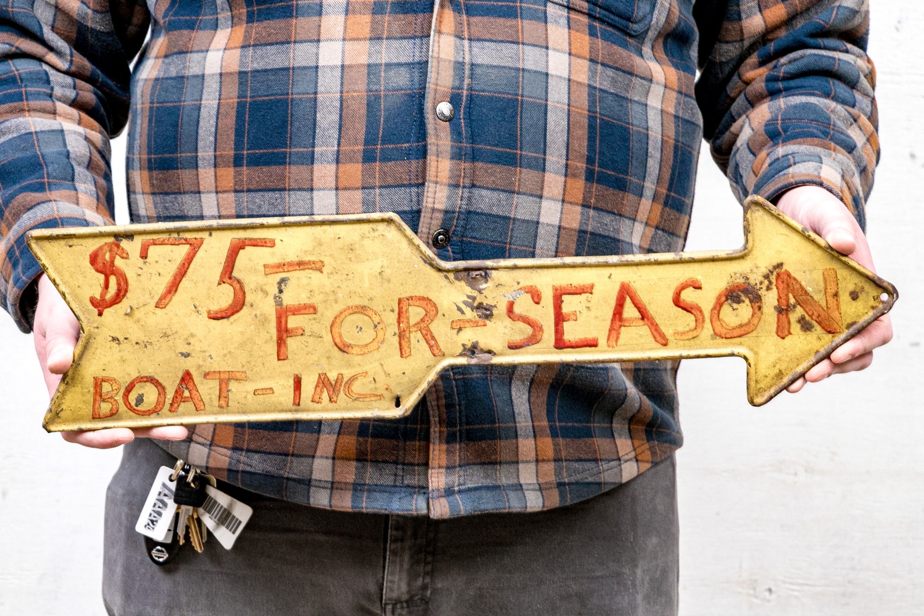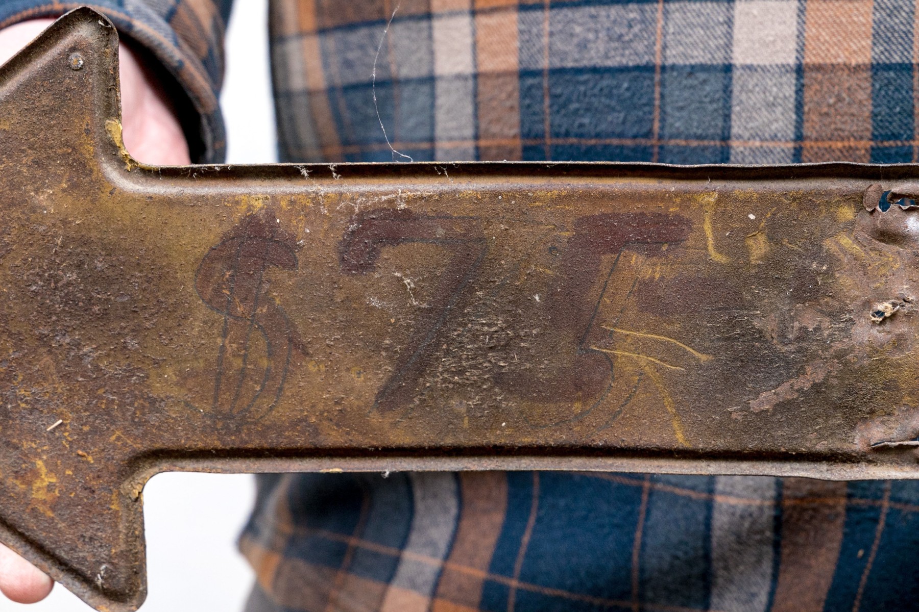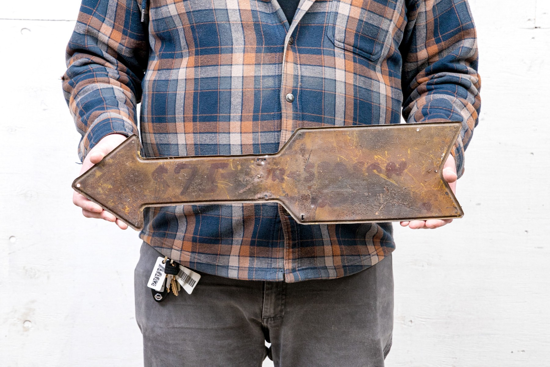 A thin arrow shaped plaque painted in yellow with red lettering. With raised borders and holes for attachment.