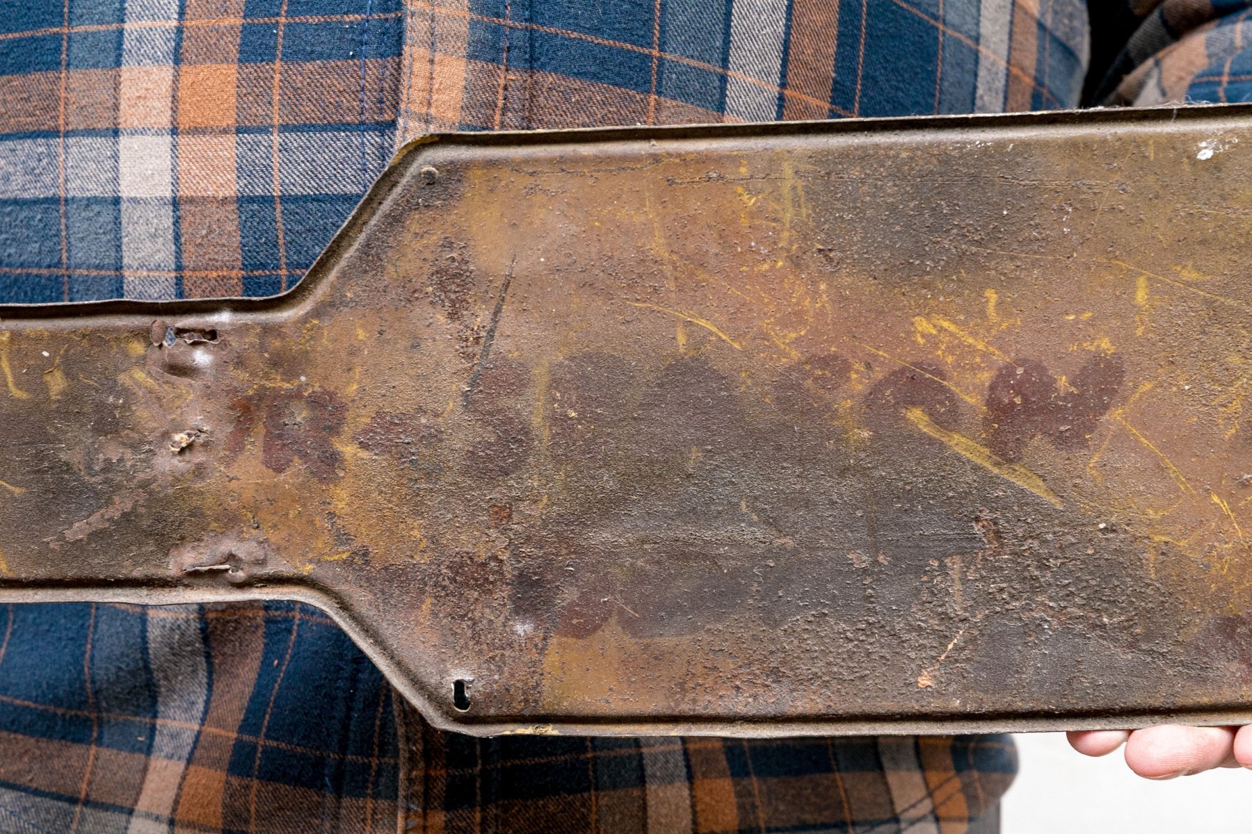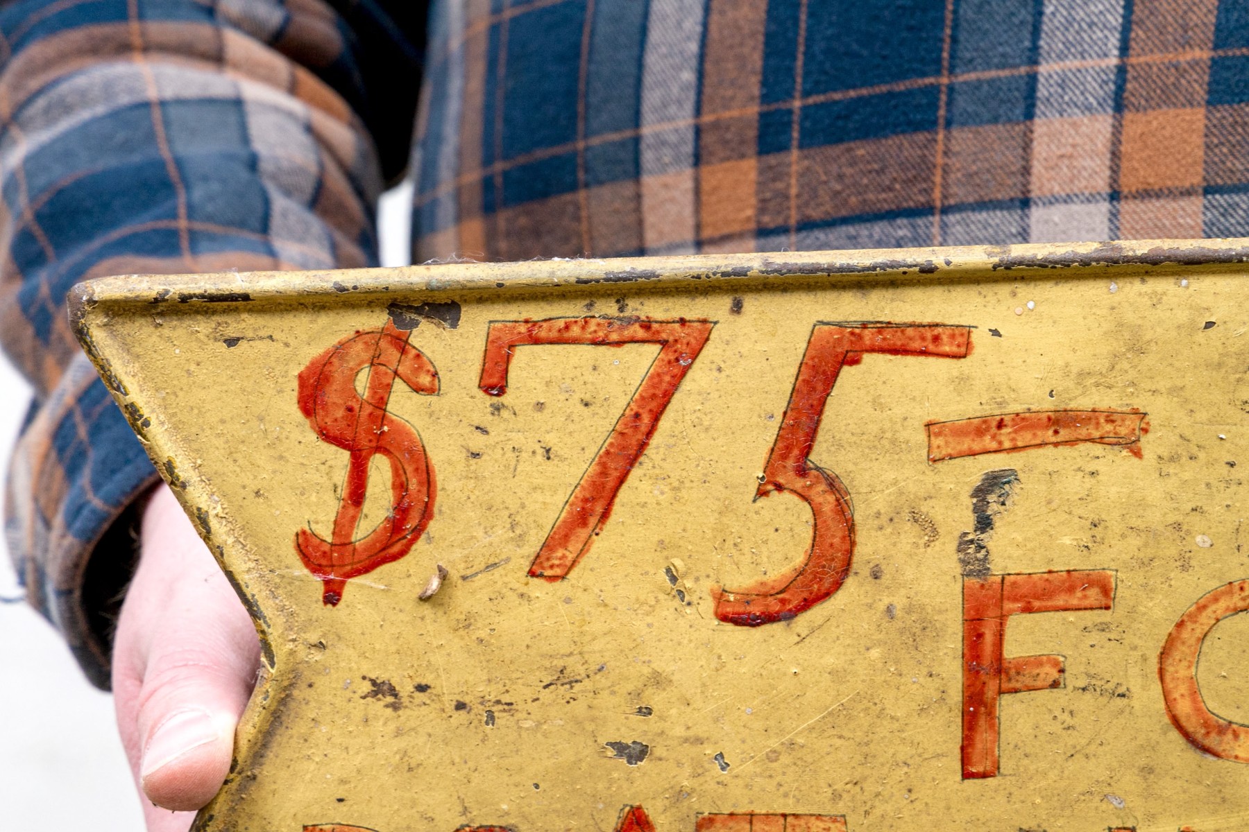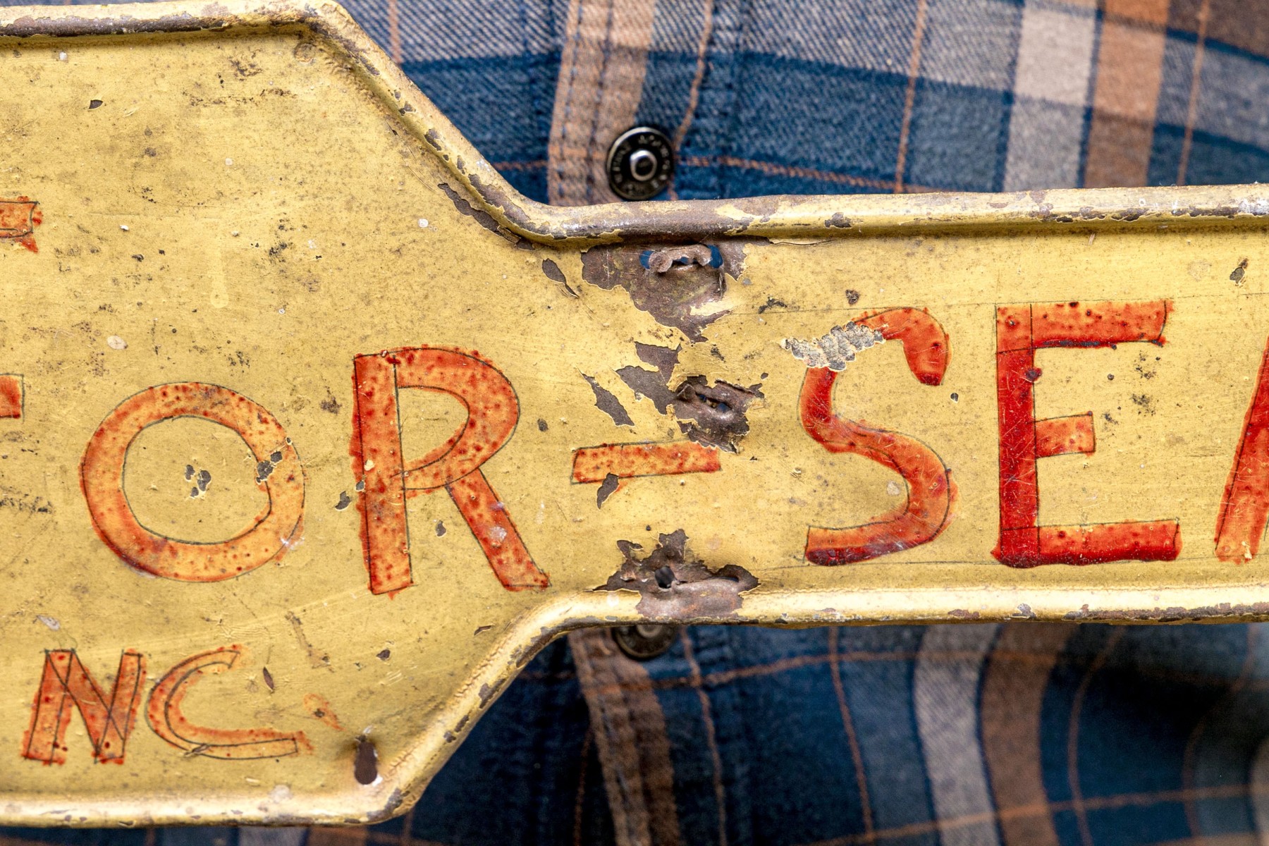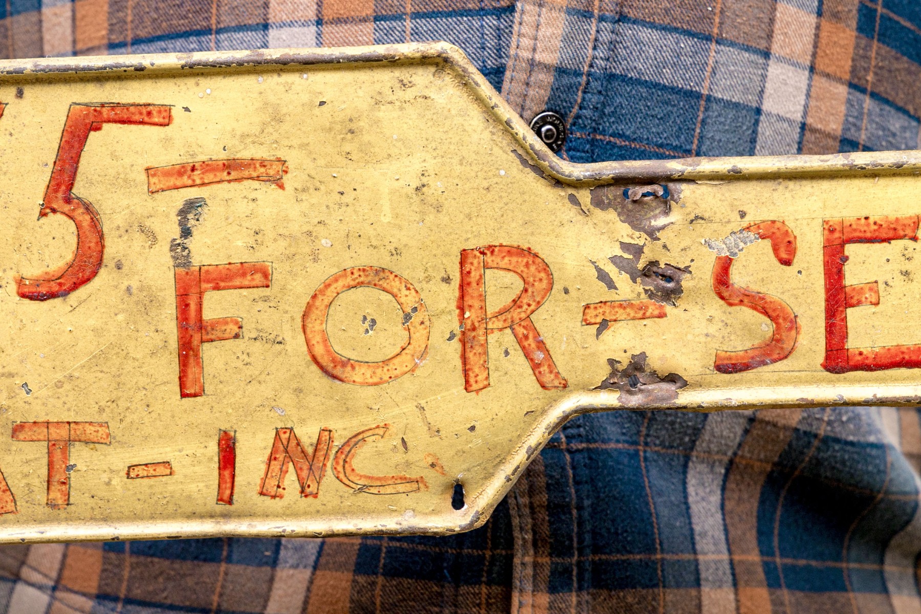 A thin arrow shaped plaque painted in yellow with red lettering. With raised borders and holes for attachment.