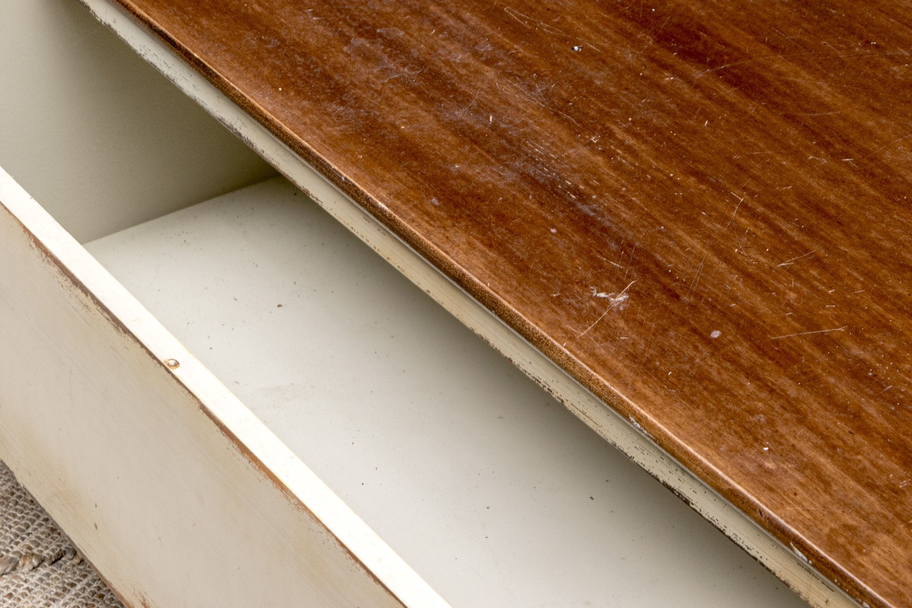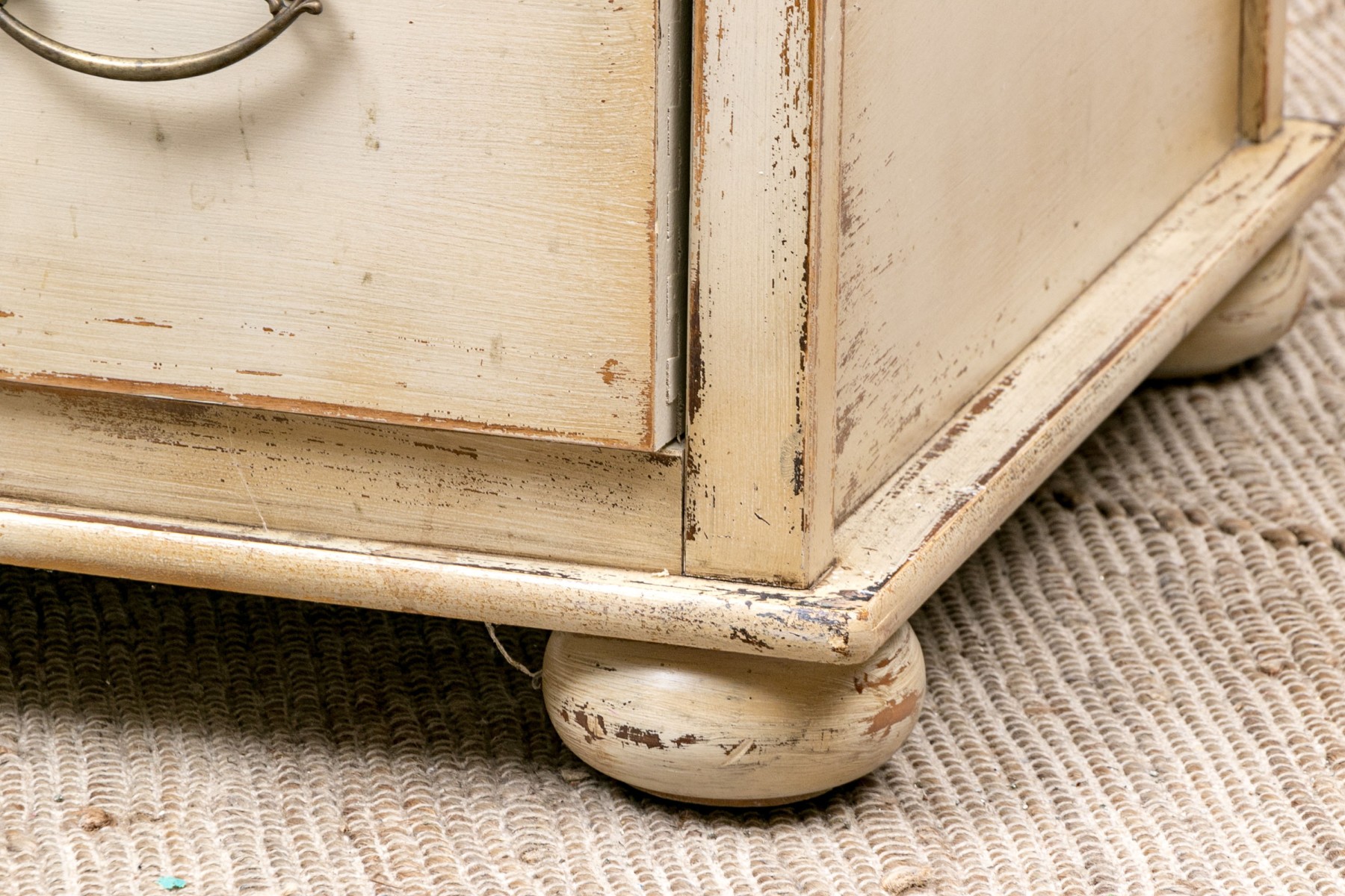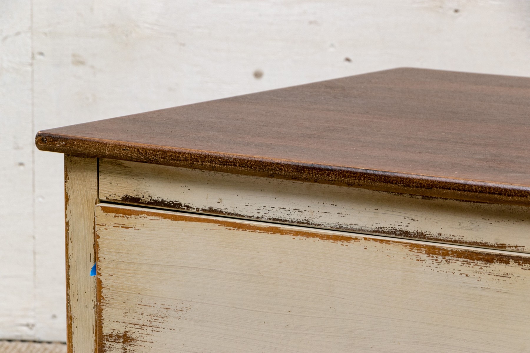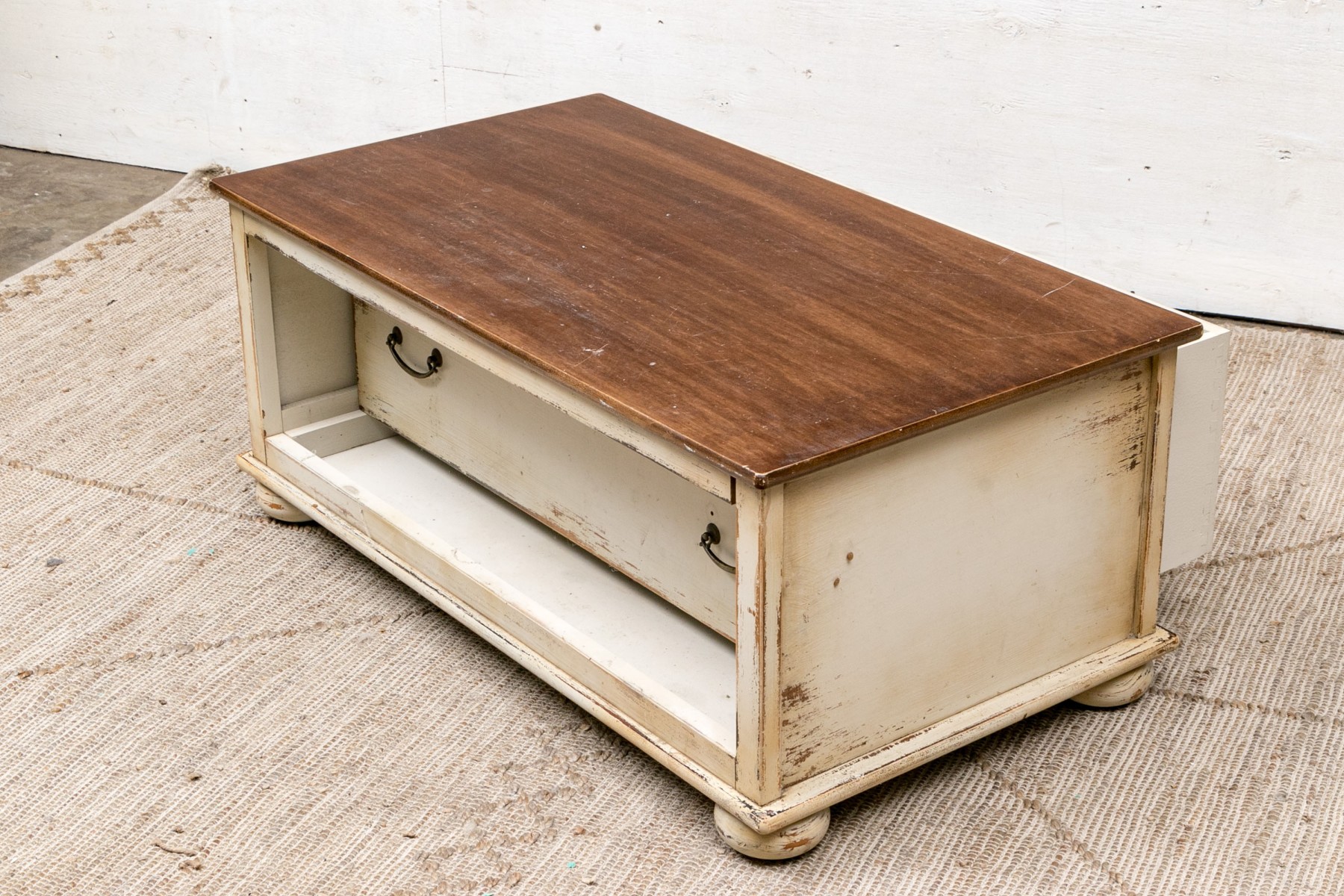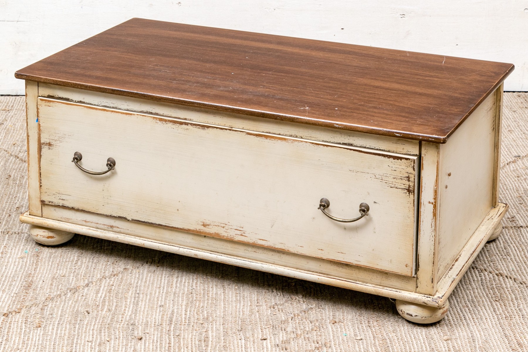 With a dark wood top on the antiqued white painted finish chest with a large long drawer on each side with metal pulls. Raised on bun feet.