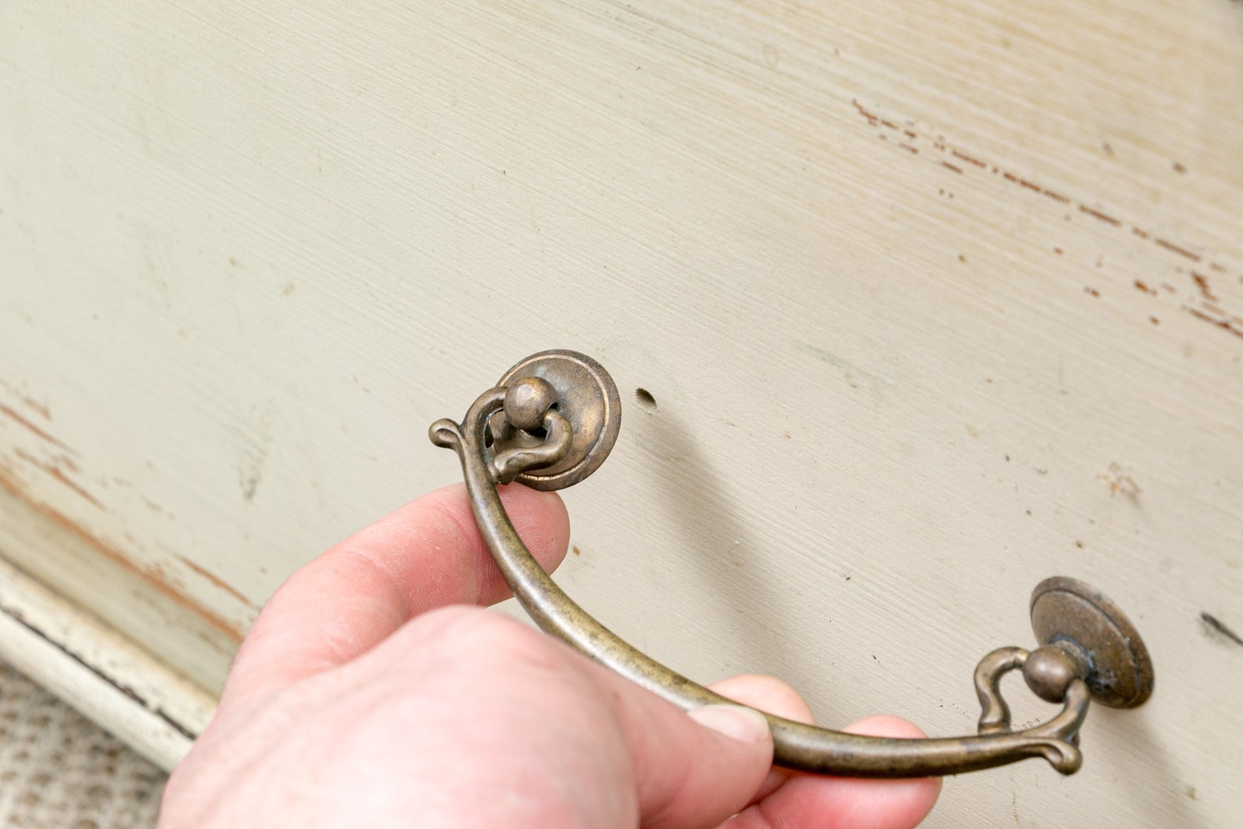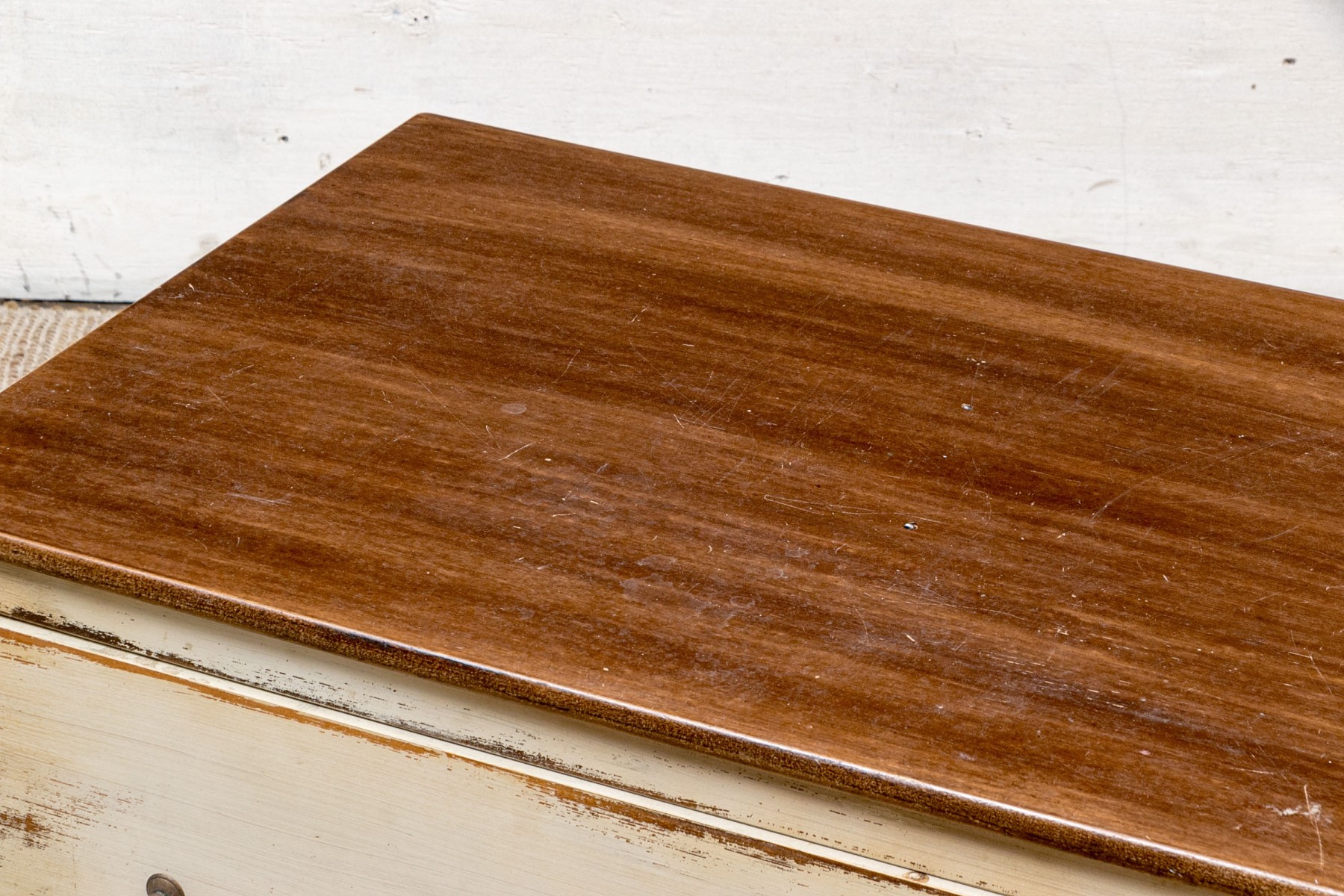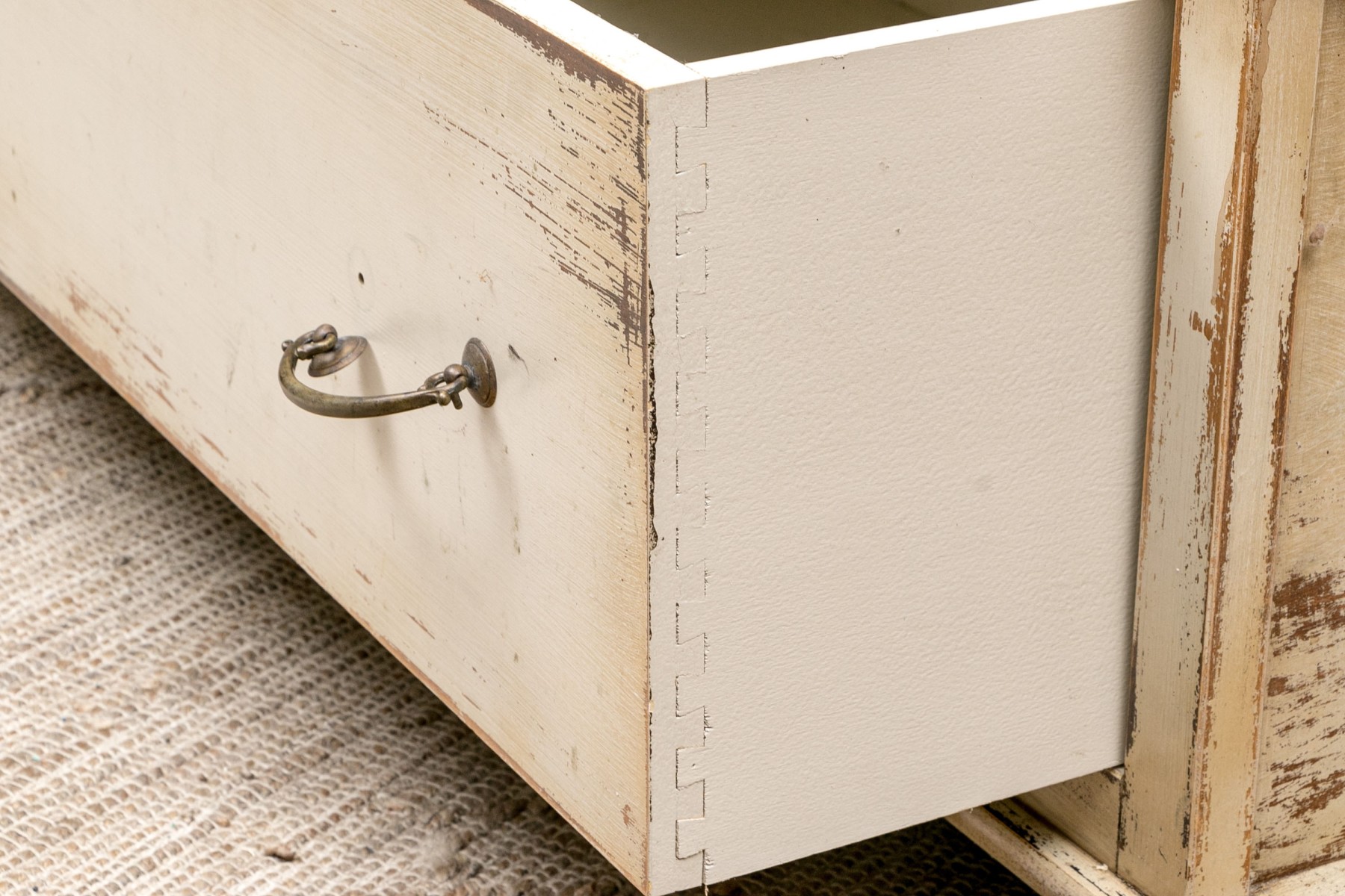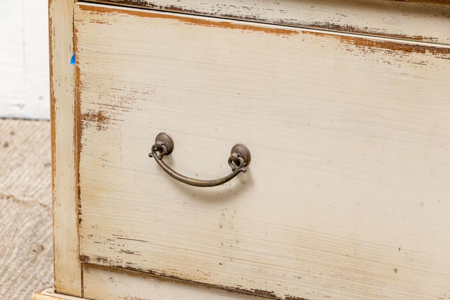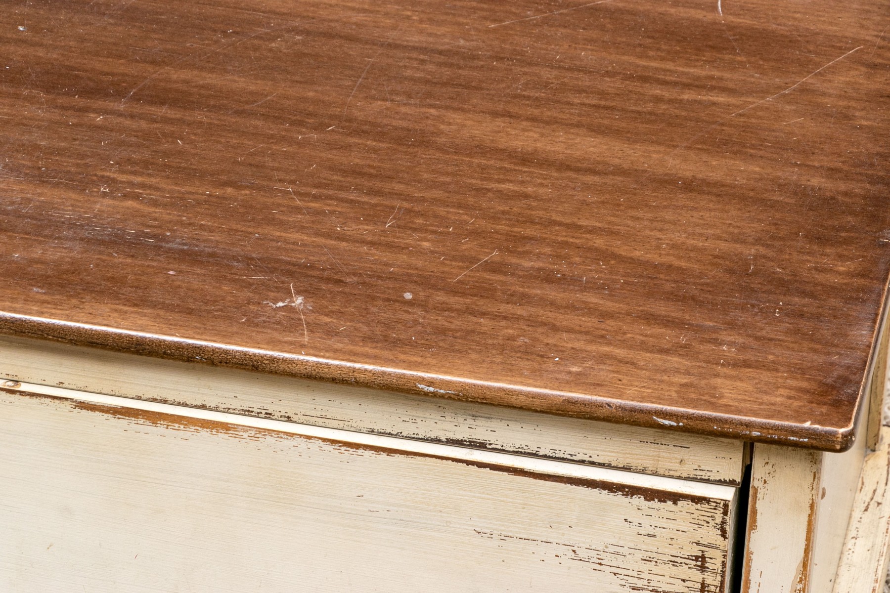 With a dark wood top on the antiqued white painted finish chest with a large long drawer on each side with metal pulls. Raised on bun feet.