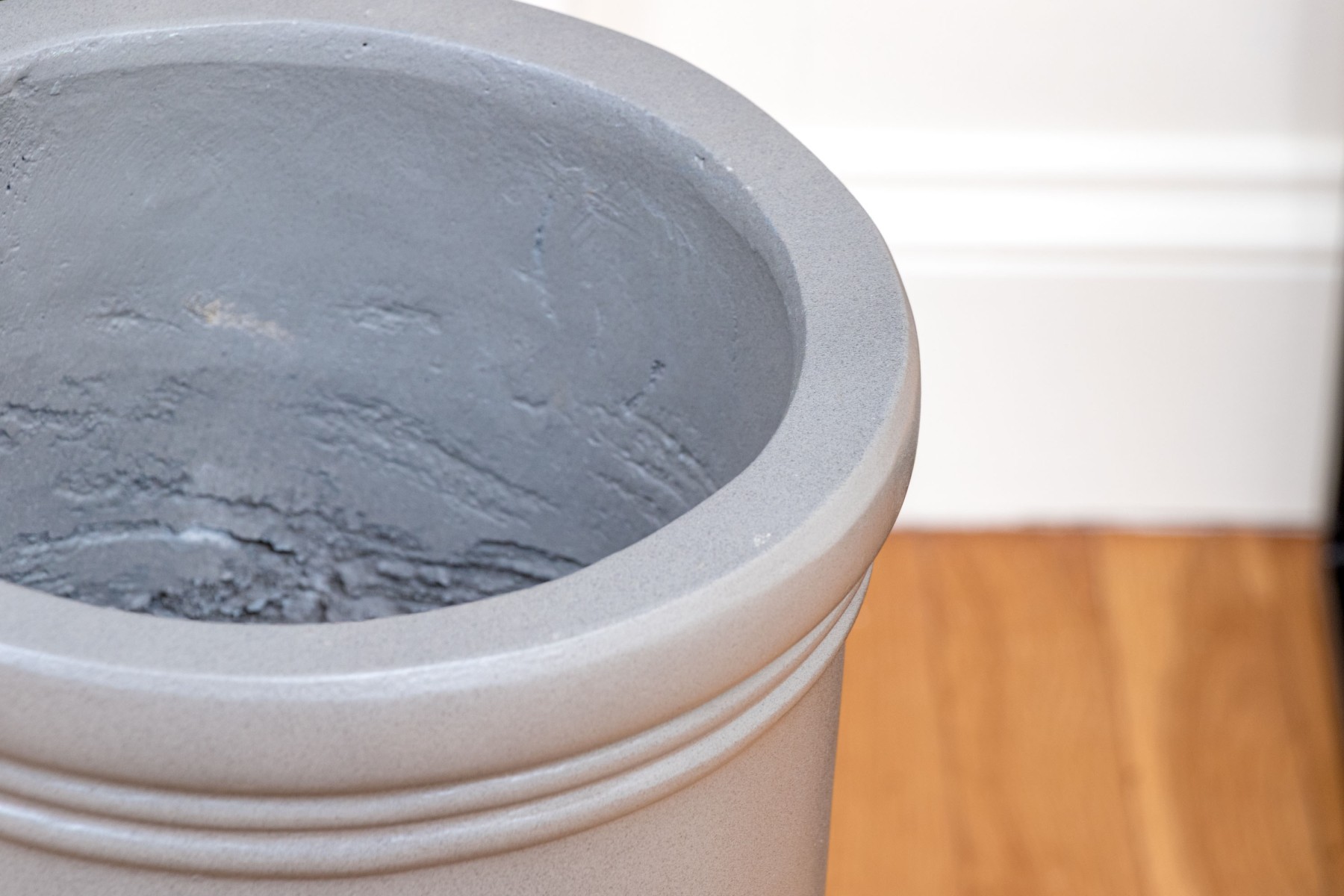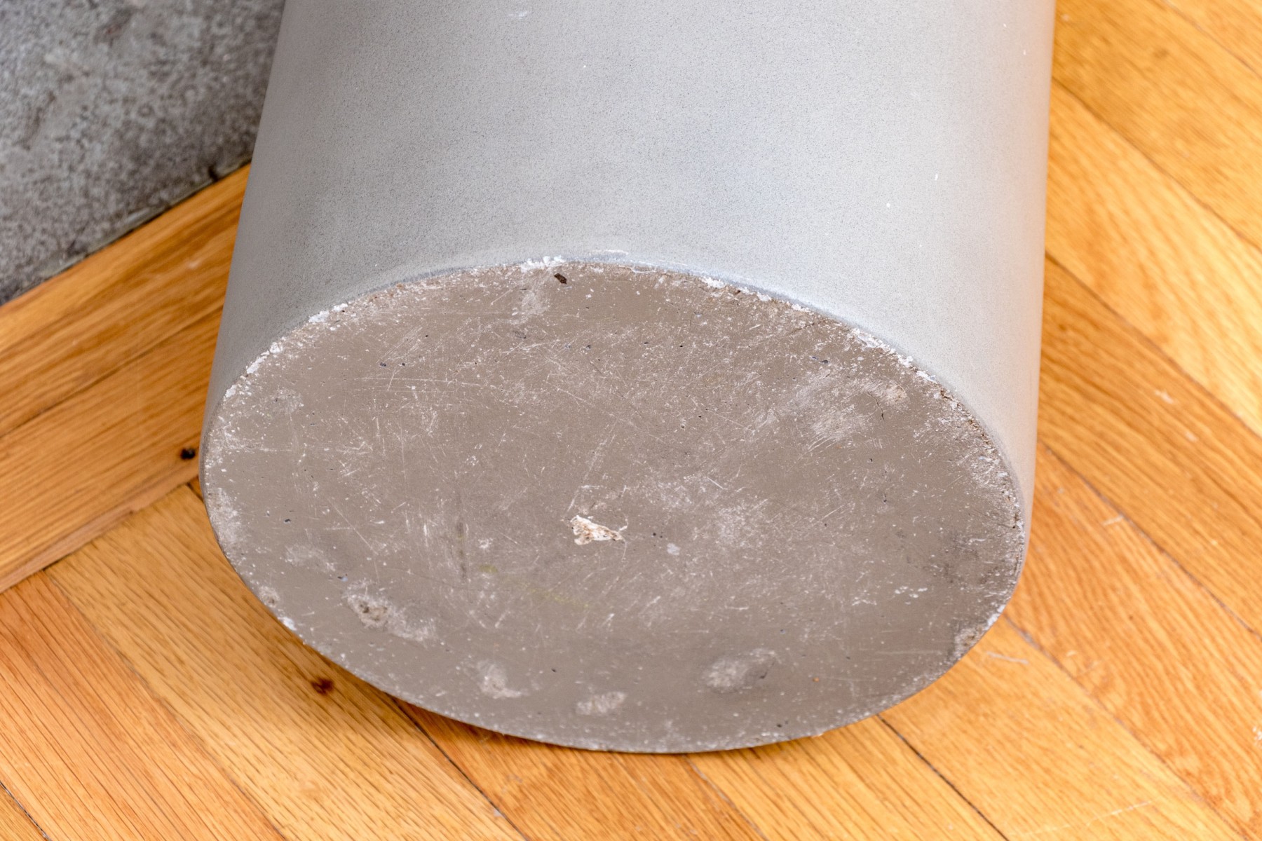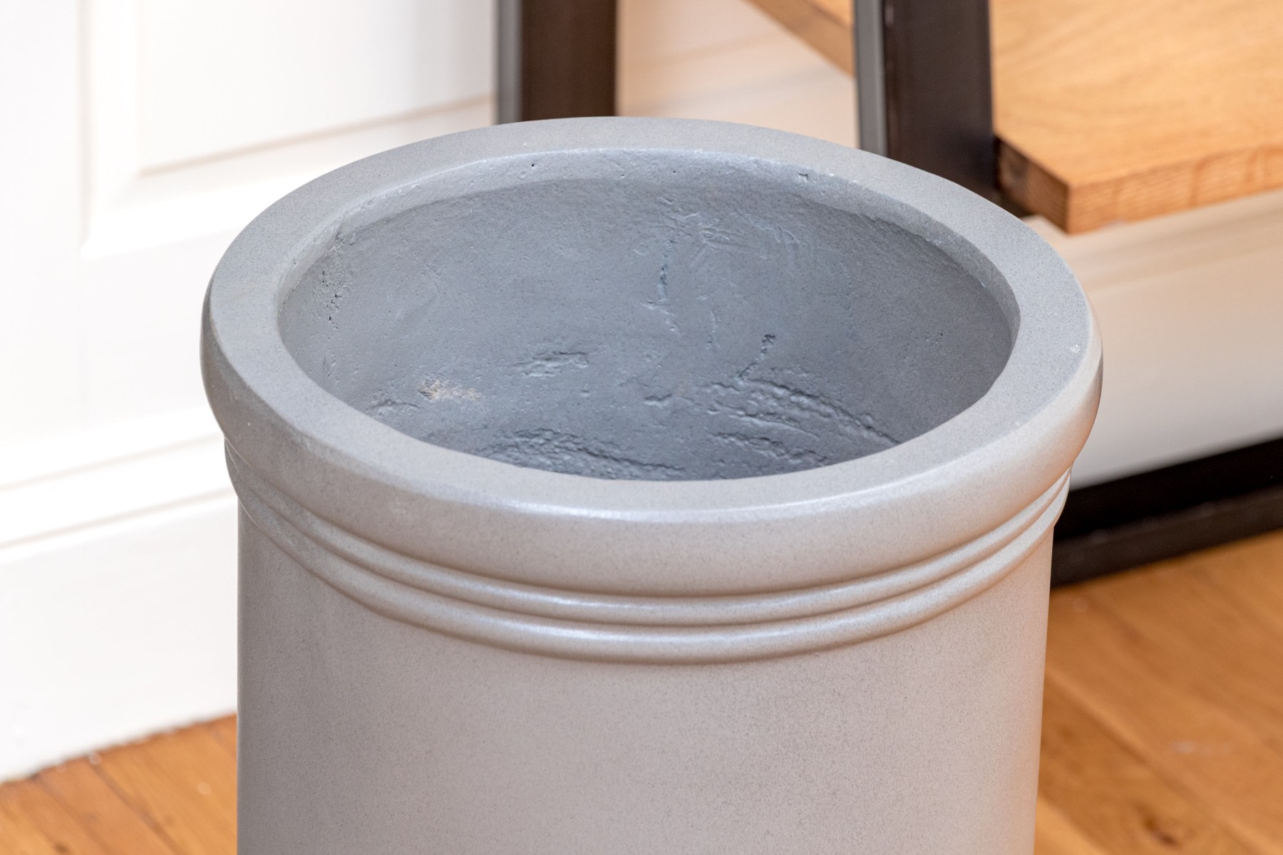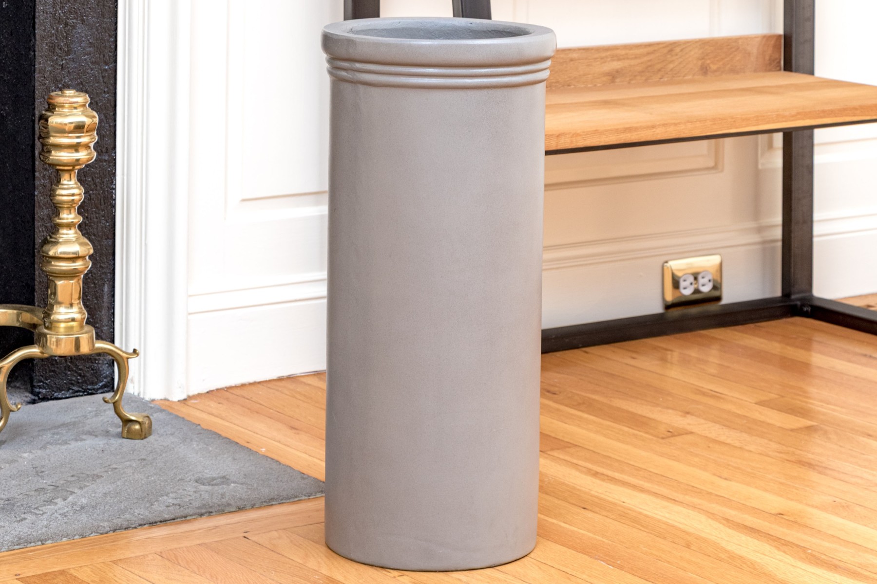 A wonderful elegantly minimalist composite plaster umbrella or cane stand painted in a cement gray finish. The stand features a banded rim over a sleek, tall cylindrical body with a flat foot.