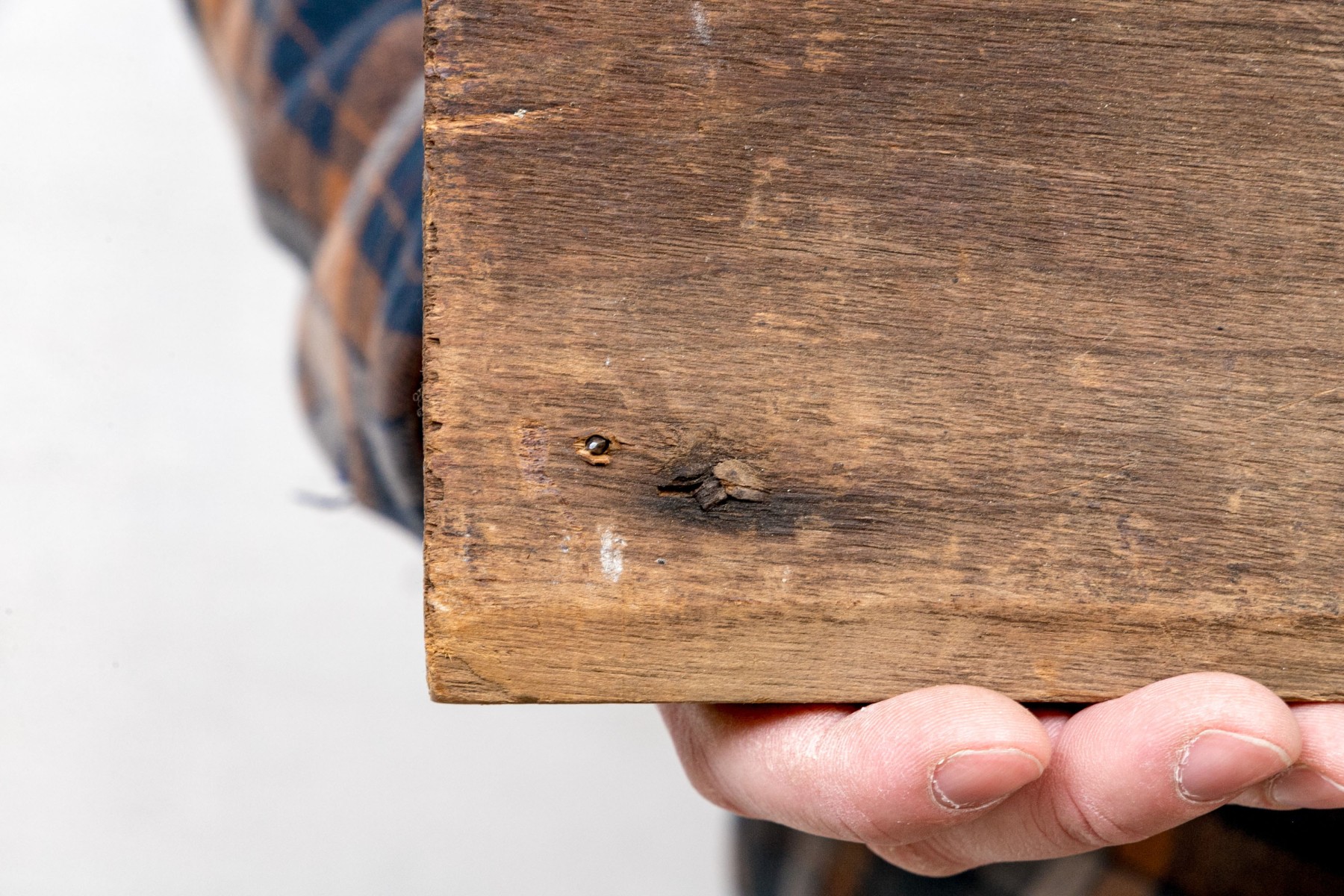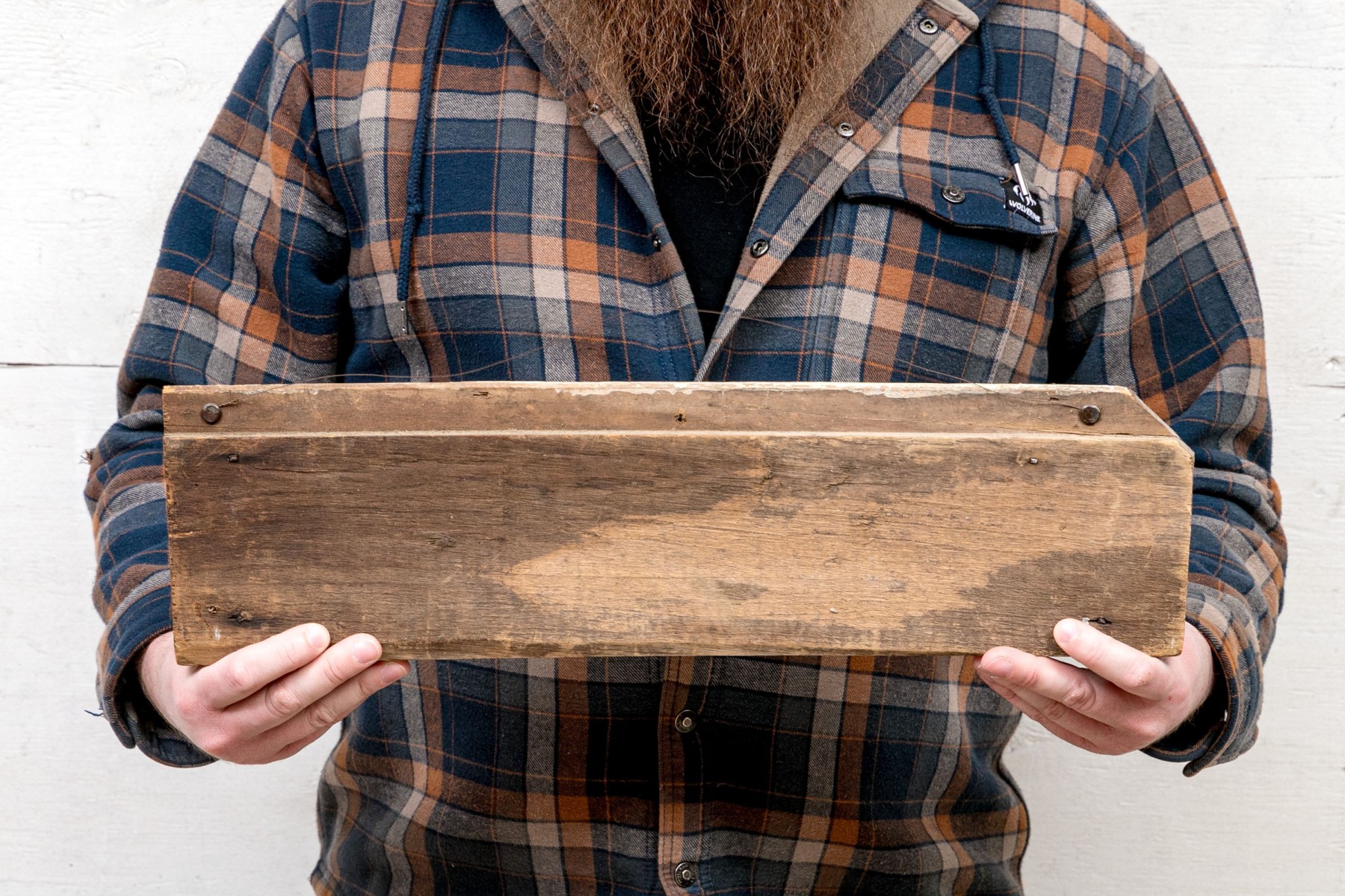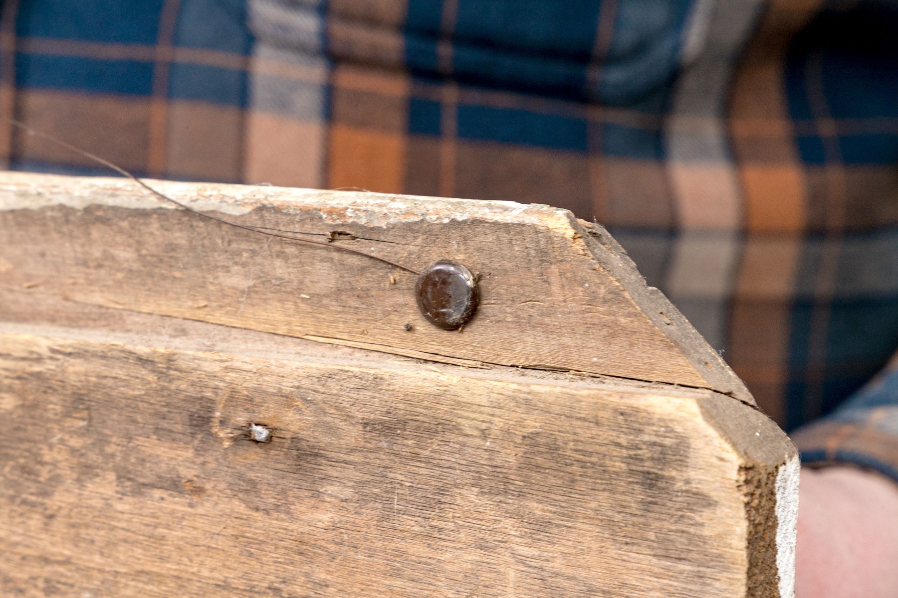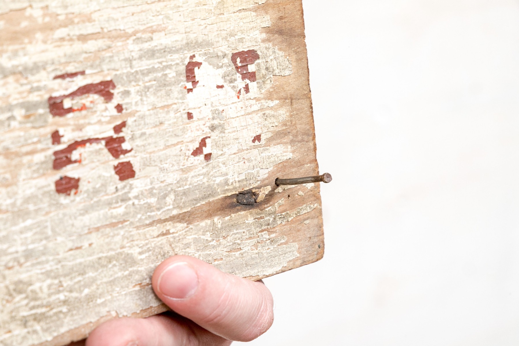 Painted in reddish brown on white with some old nails in place. With a separately made top band, with newer line for hanging. A single nail projecting lower right.