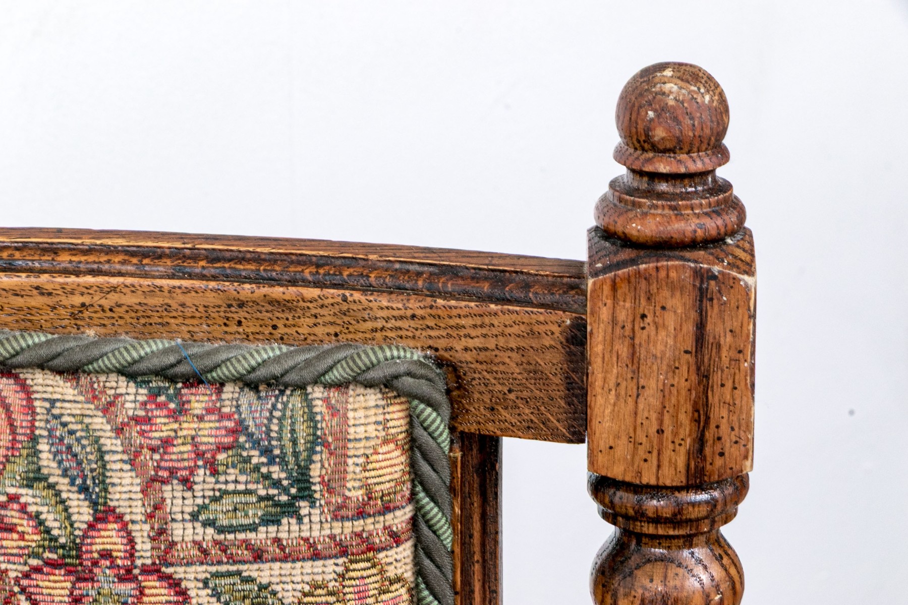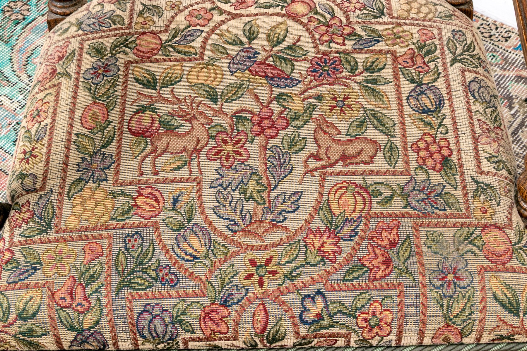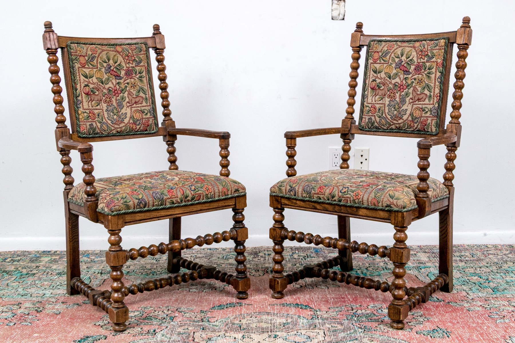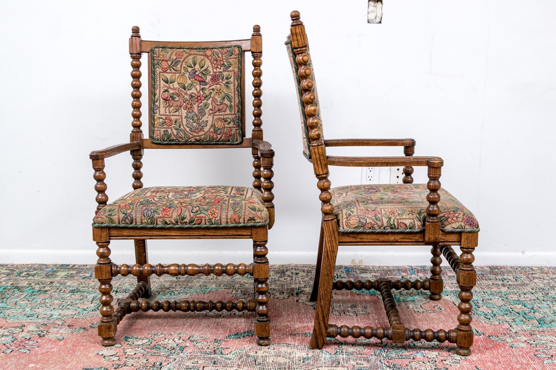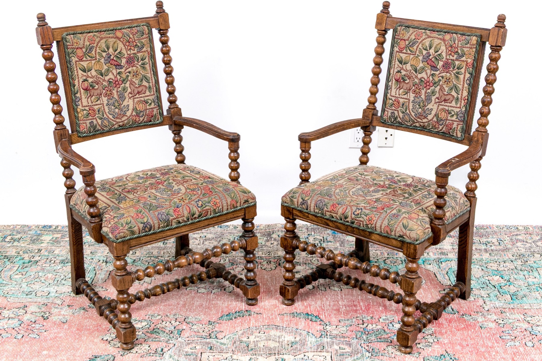 A handsome pair of vintage armchairs with great Jacobean appeal, crafted in warm-toned medium brown oak with sphere finials atop the ears of a straight top rail, leading to bobbin turned posts flanking handsomely upholstered seat backs slats with needlepoint designs of deer and a central bird perched on a fruiting tree. The designed is continued on the upholstered seats, surrounded by gently curved arms and finished with straight aprons supported by bobbin turned front legs with H-stretchers.