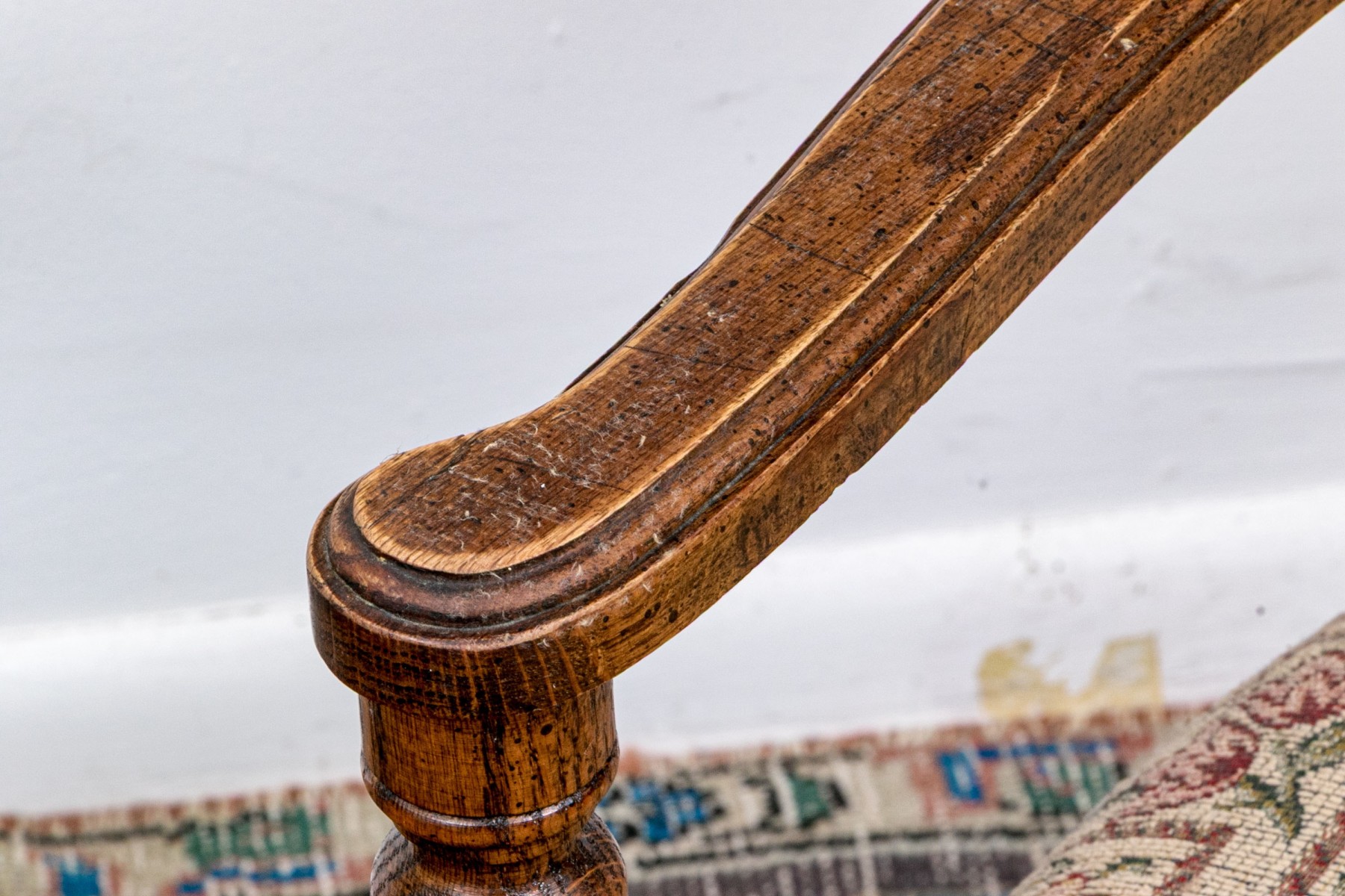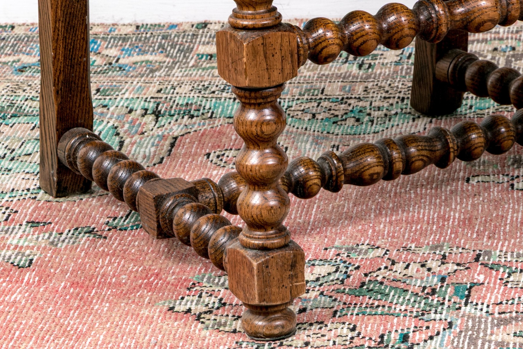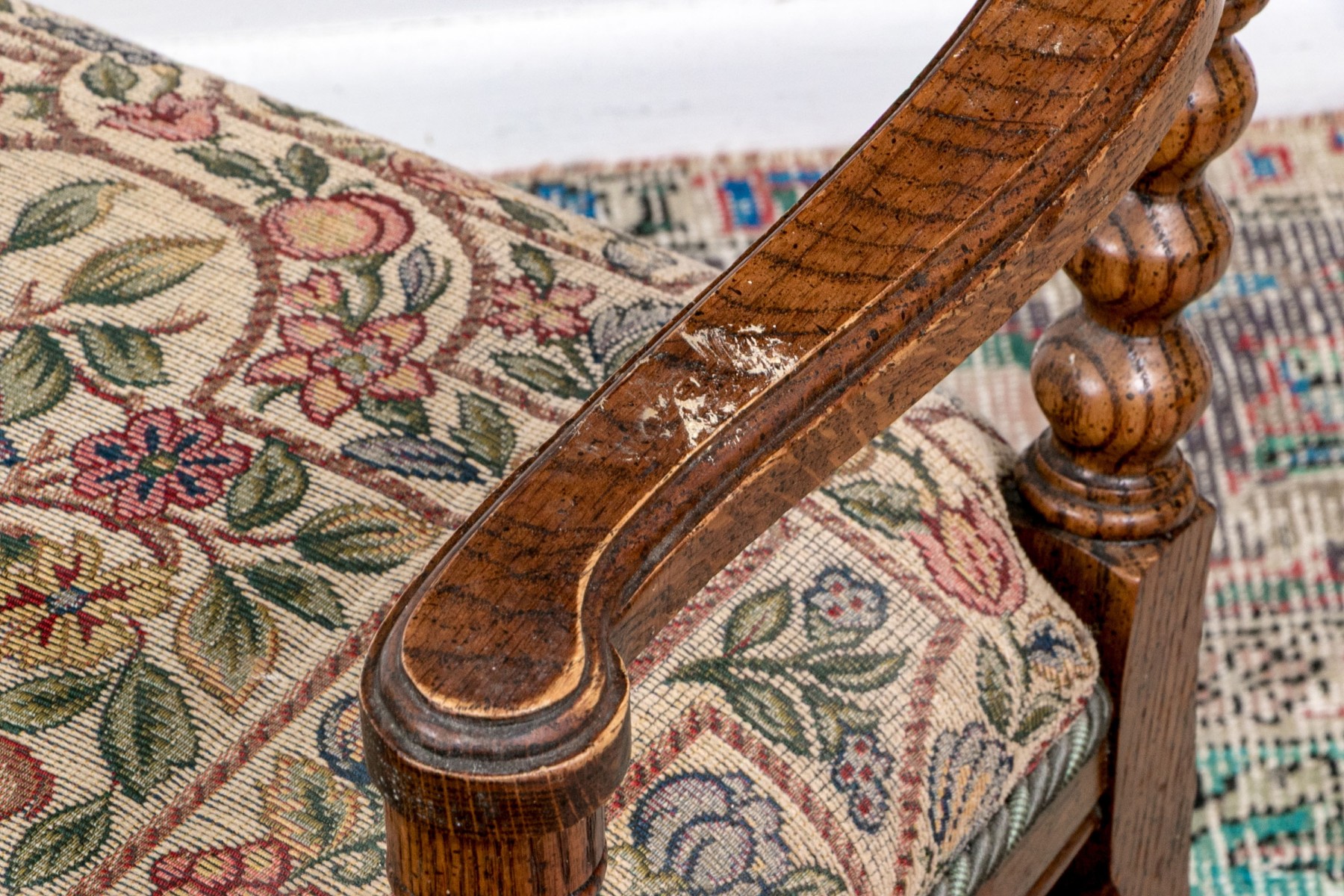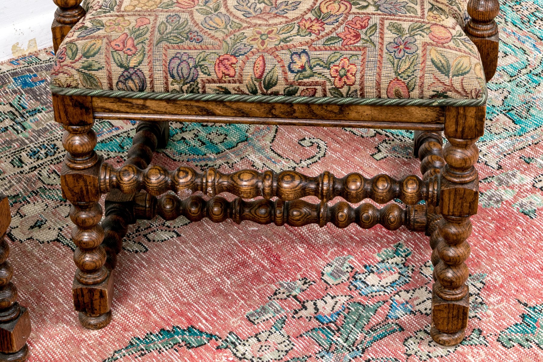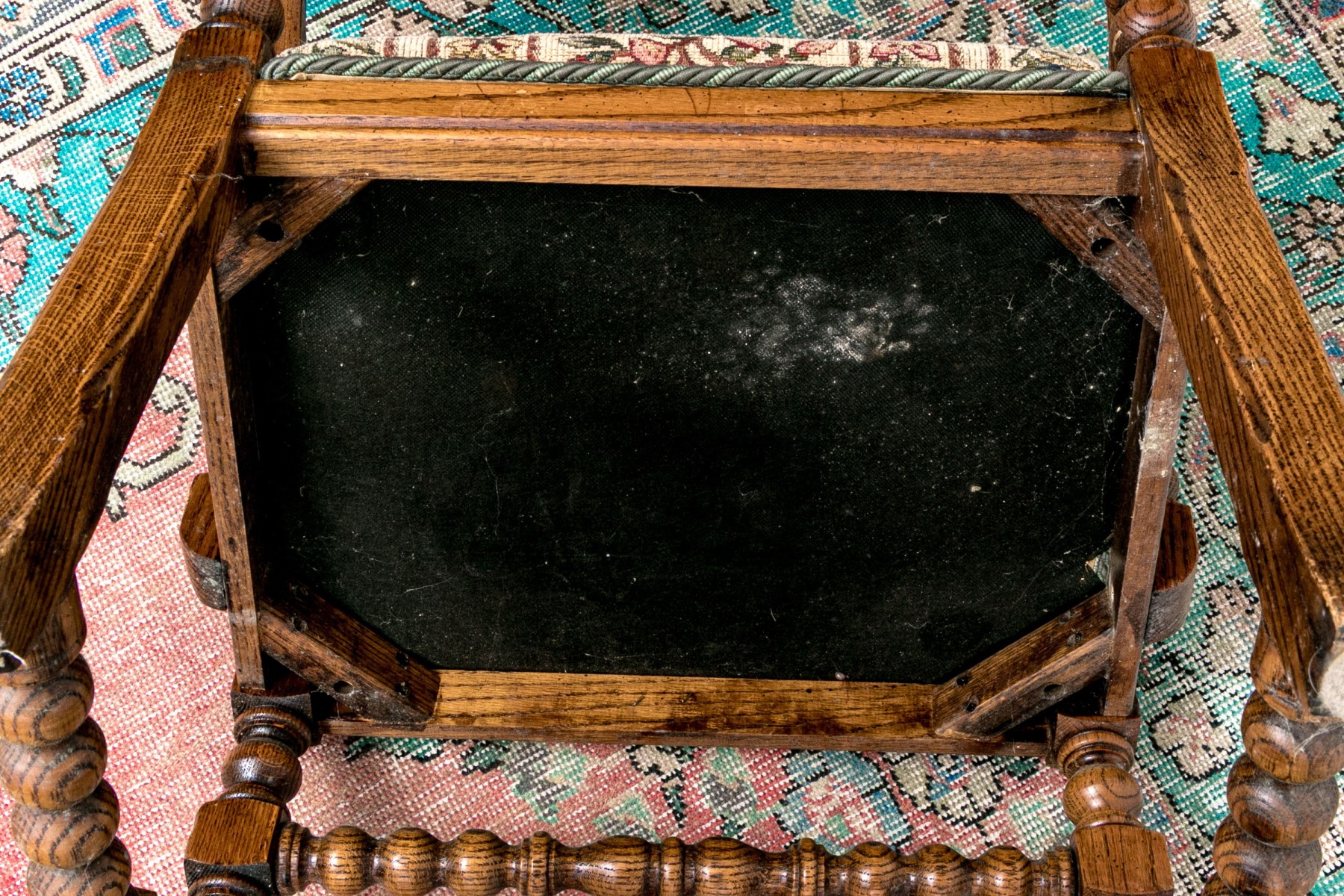 A handsome pair of vintage armchairs with great Jacobean appeal, crafted in warm-toned medium brown oak with sphere finials atop the ears of a straight top rail, leading to bobbin turned posts flanking handsomely upholstered seat backs slats with needlepoint designs of deer and a central bird perched on a fruiting tree. The designed is continued on the upholstered seats, surrounded by gently curved arms and finished with straight aprons supported by bobbin turned front legs with H-stretchers.