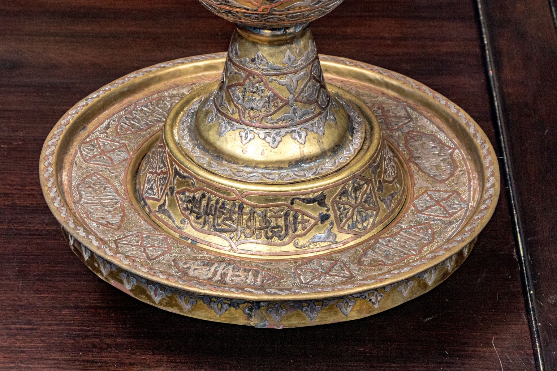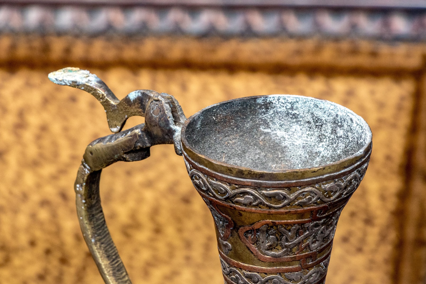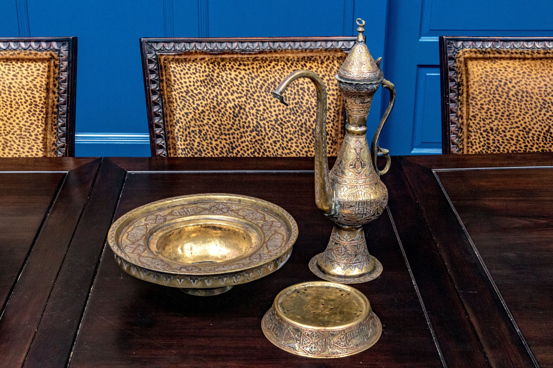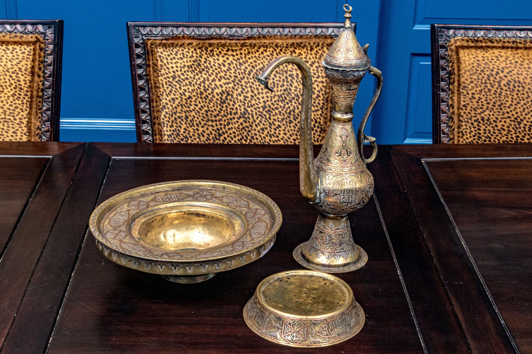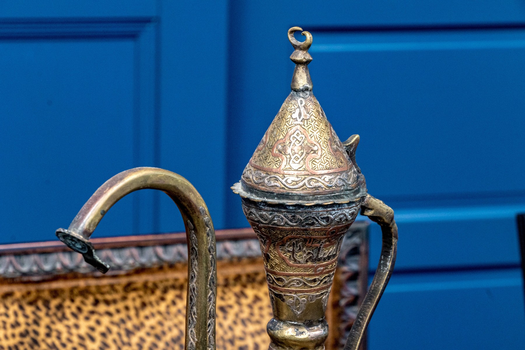 A fabulous pair of antique Middle Eastern ewers and basins. The ewers sport pear-shaped bodies with conical necks and feet, adorned with dramatically arched spouts and elegantly curved handles. The ewers rest atop removable platforms that fit within raised basins, sporting raised rims and wide cheeks surrounding rounded centers over raised pedestal feet. The ewers and basins are beautifully detailed with brass, copper, and silver hues, incorporating elegant relief and geometric etched details to create eye-catching, ornate designs.