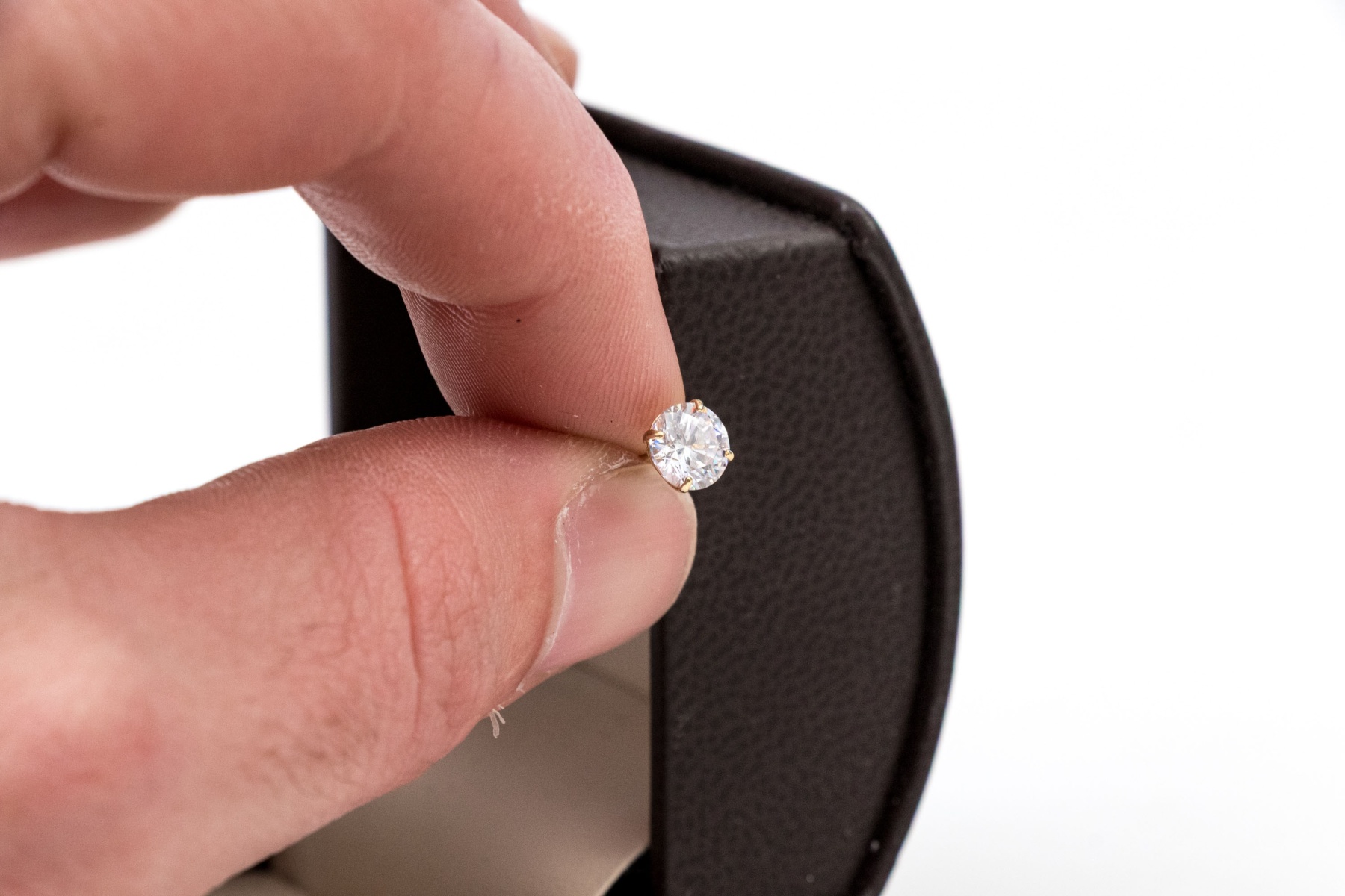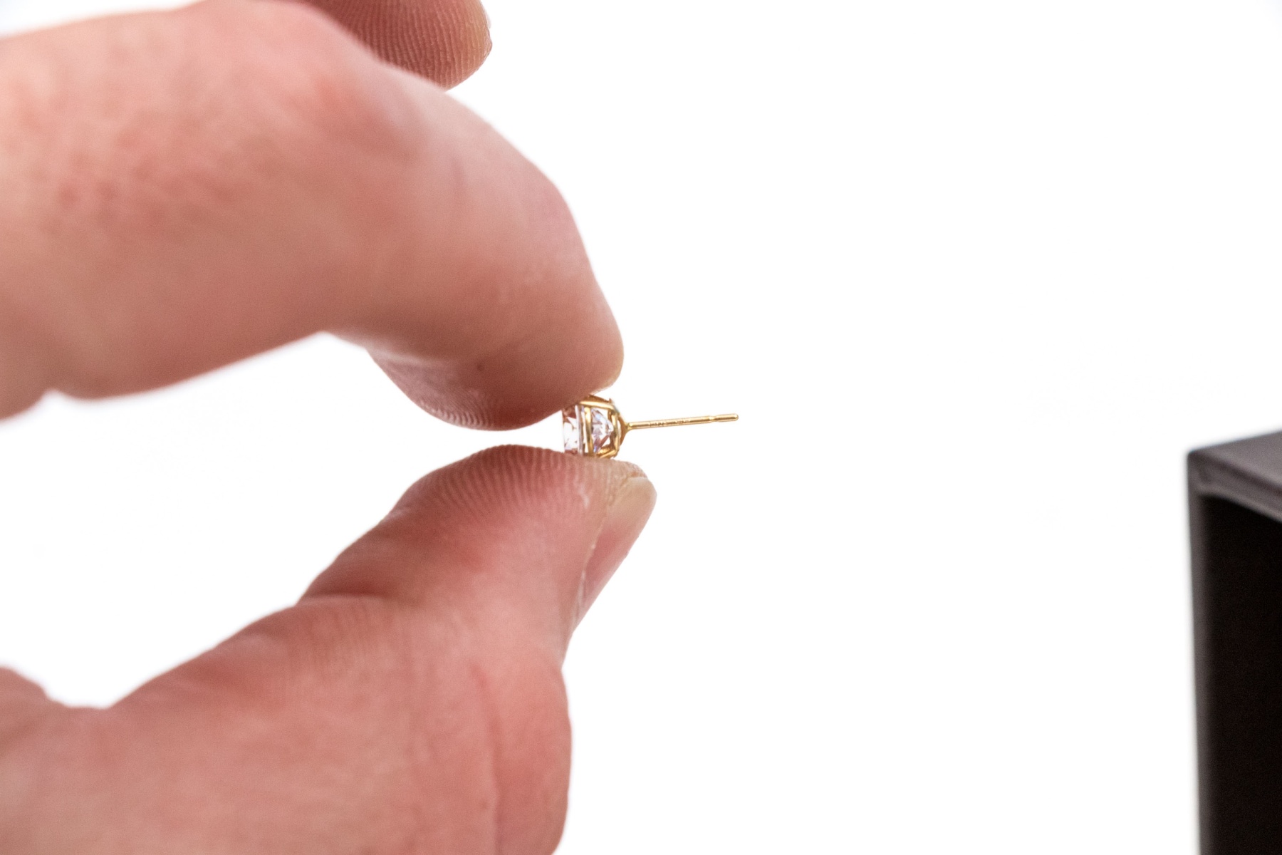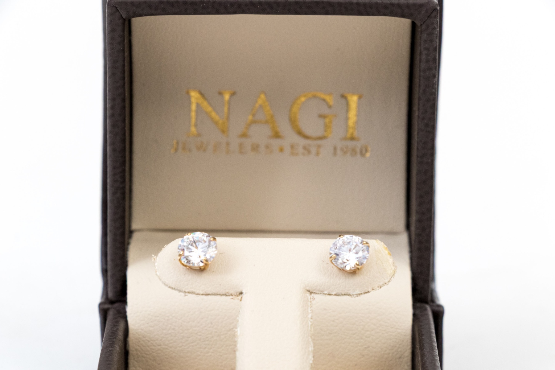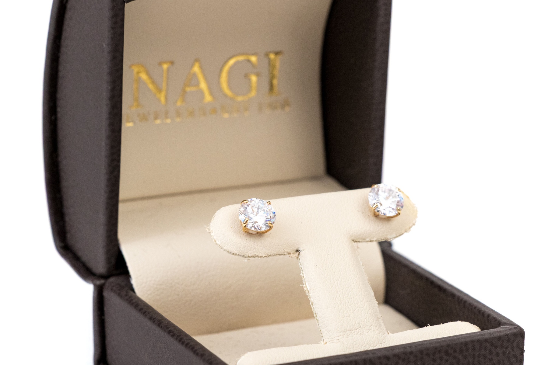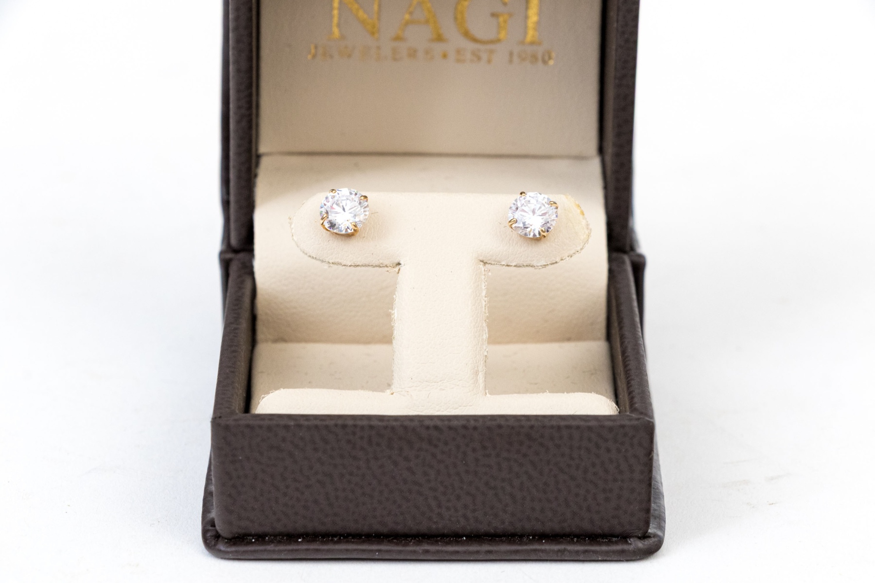 A beautiful pair of white CZ stud earrings with 14k yellow gold prong settings. Includes a Nagi display box.