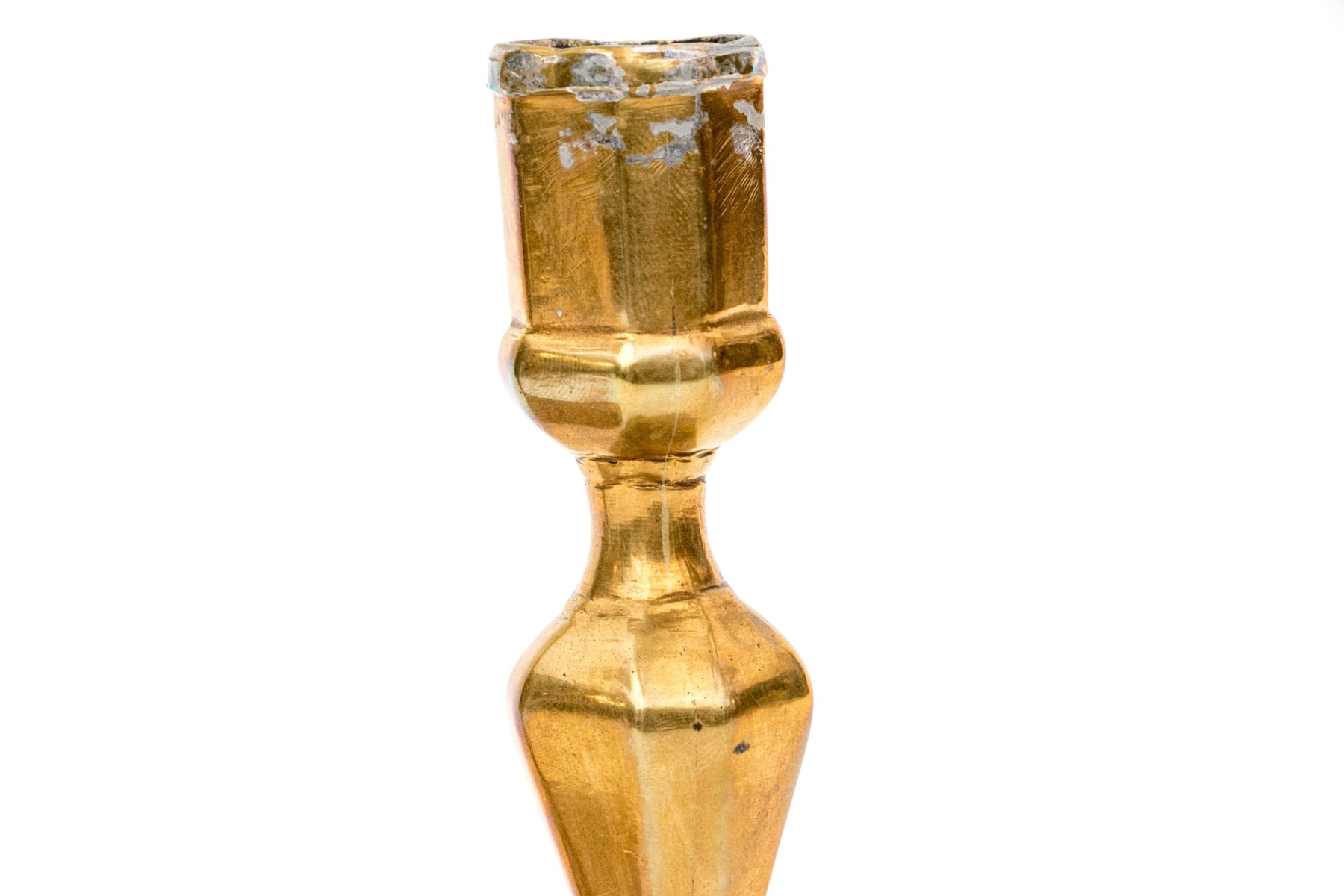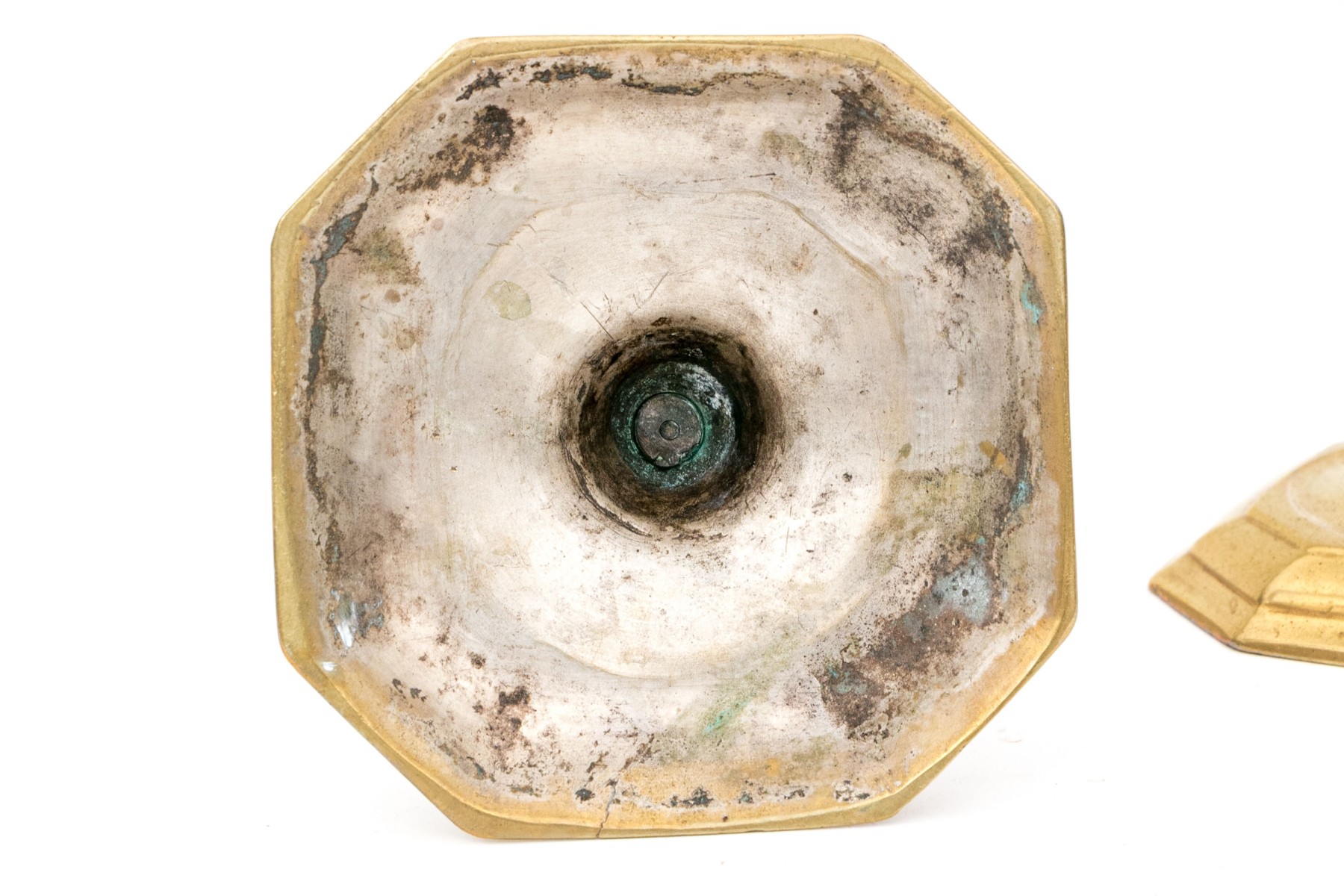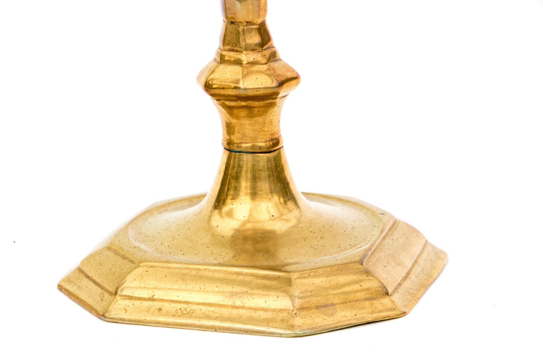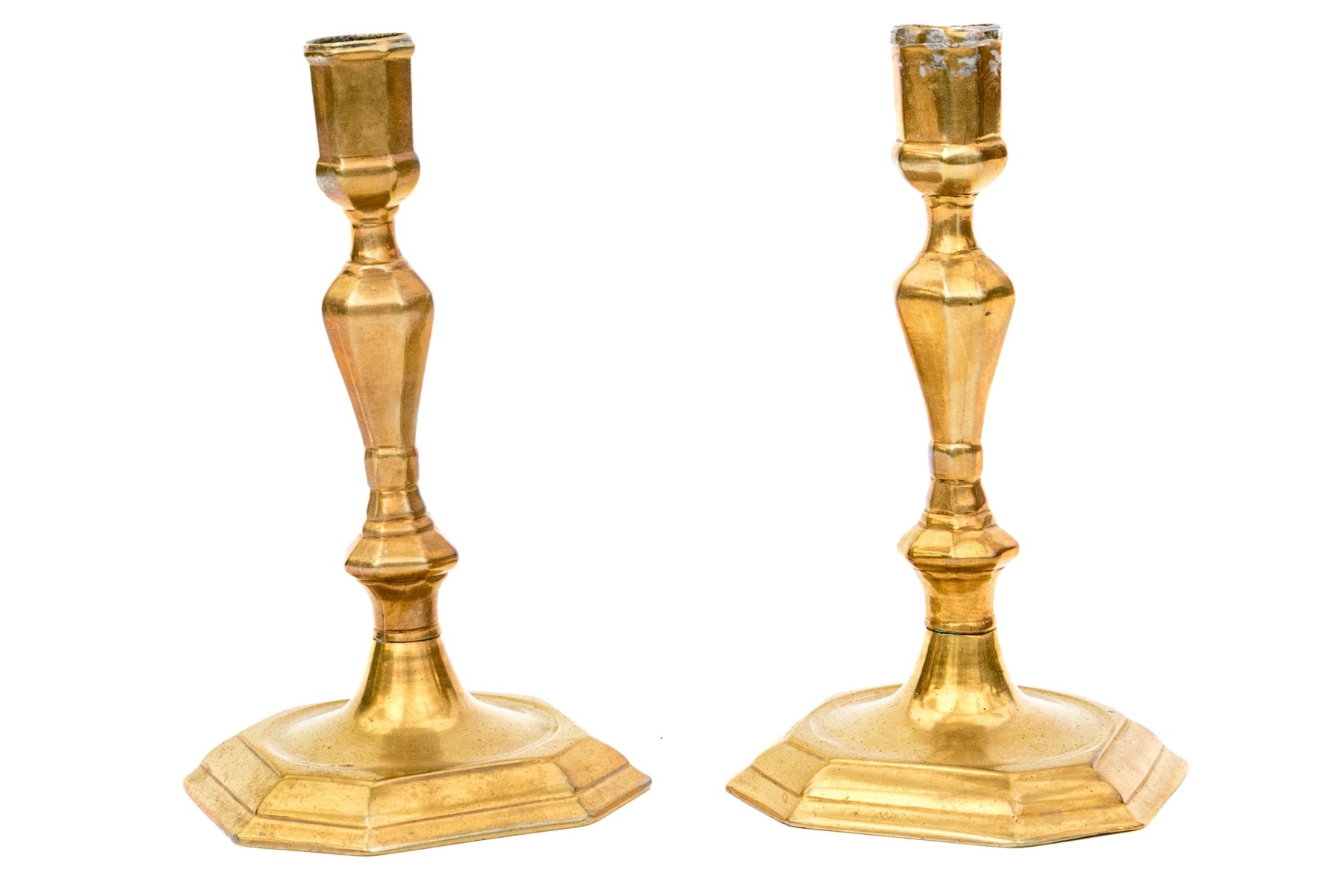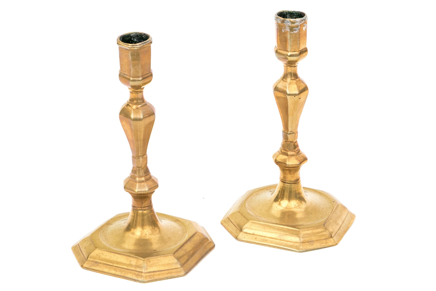 A wonderful pair of 18th century brass candlesticks showcasing tall hexagonal capitals over shapely faceted baluster columns terminating over cut-corner rectangular bases with beveled borders.