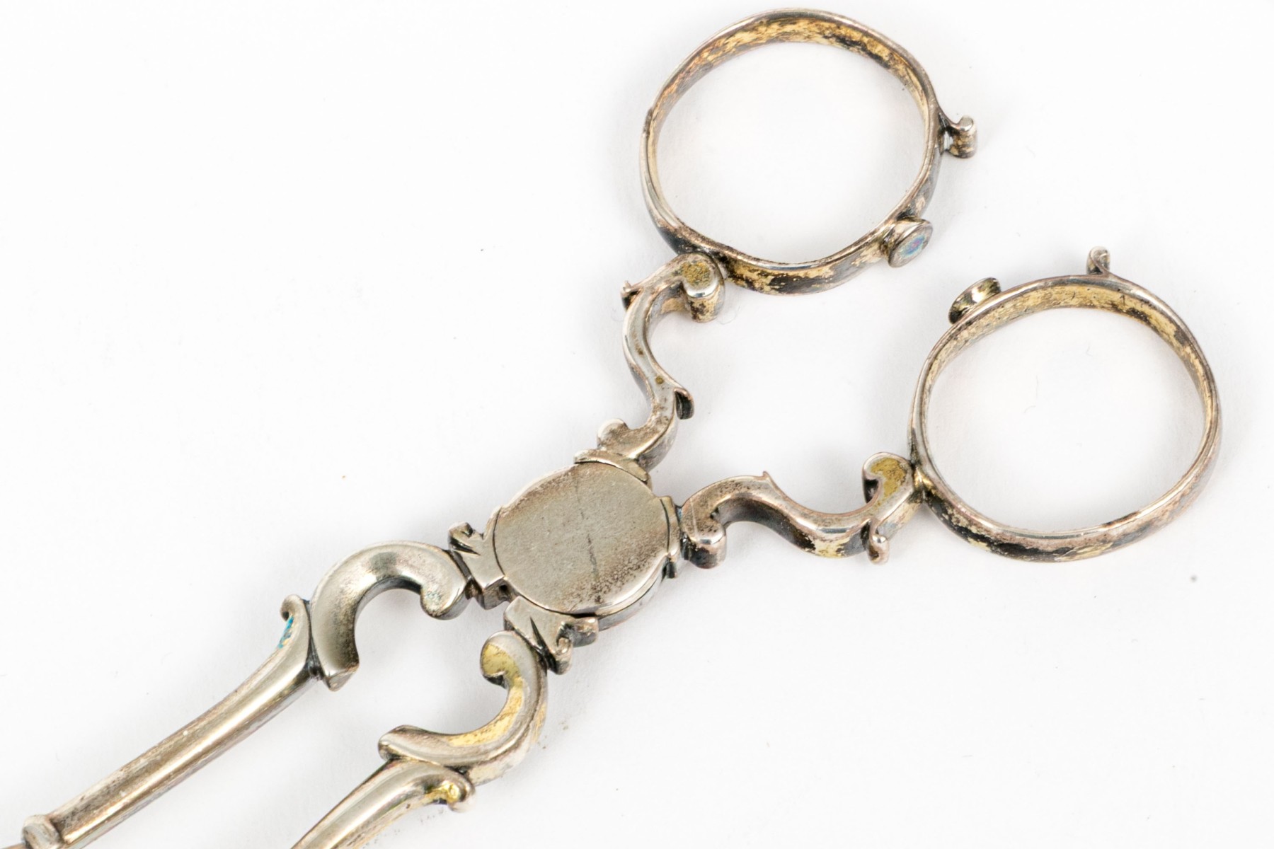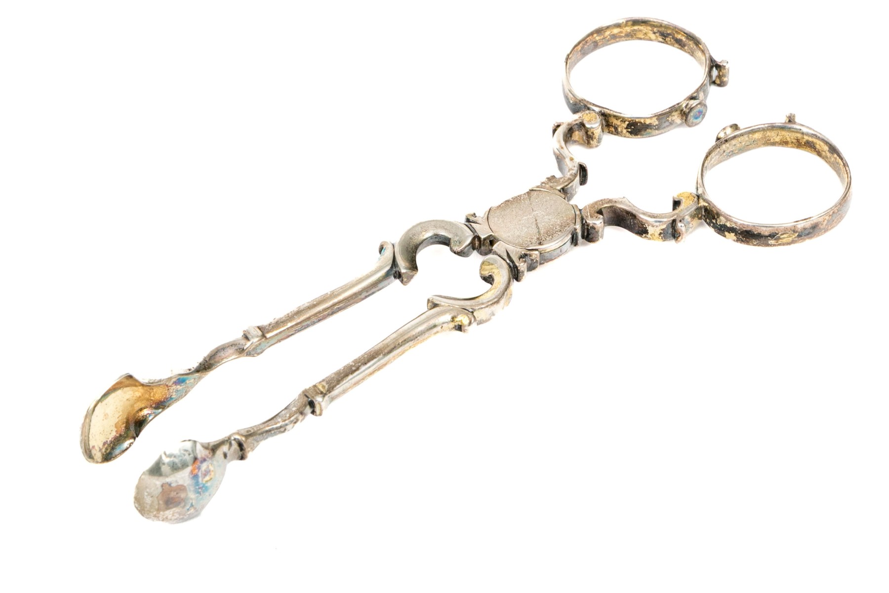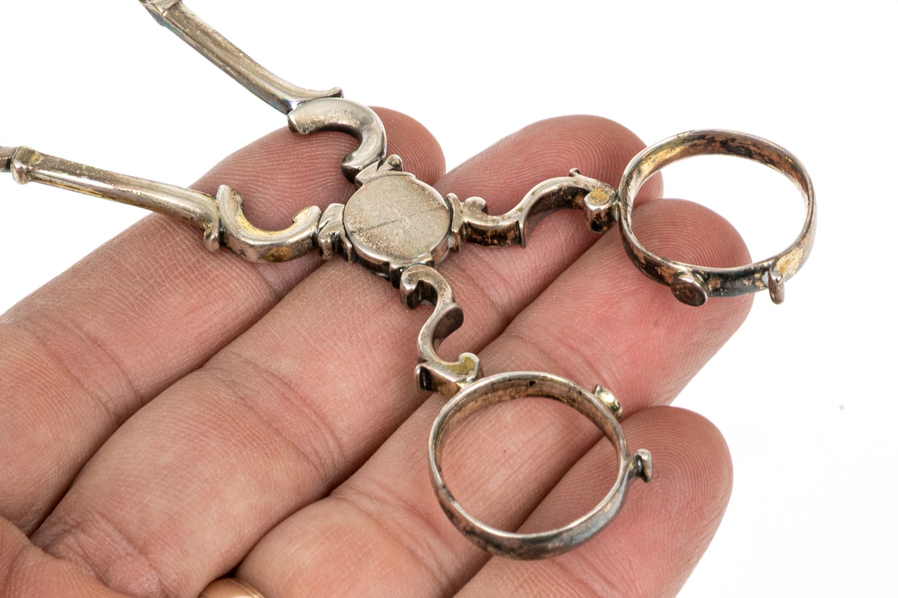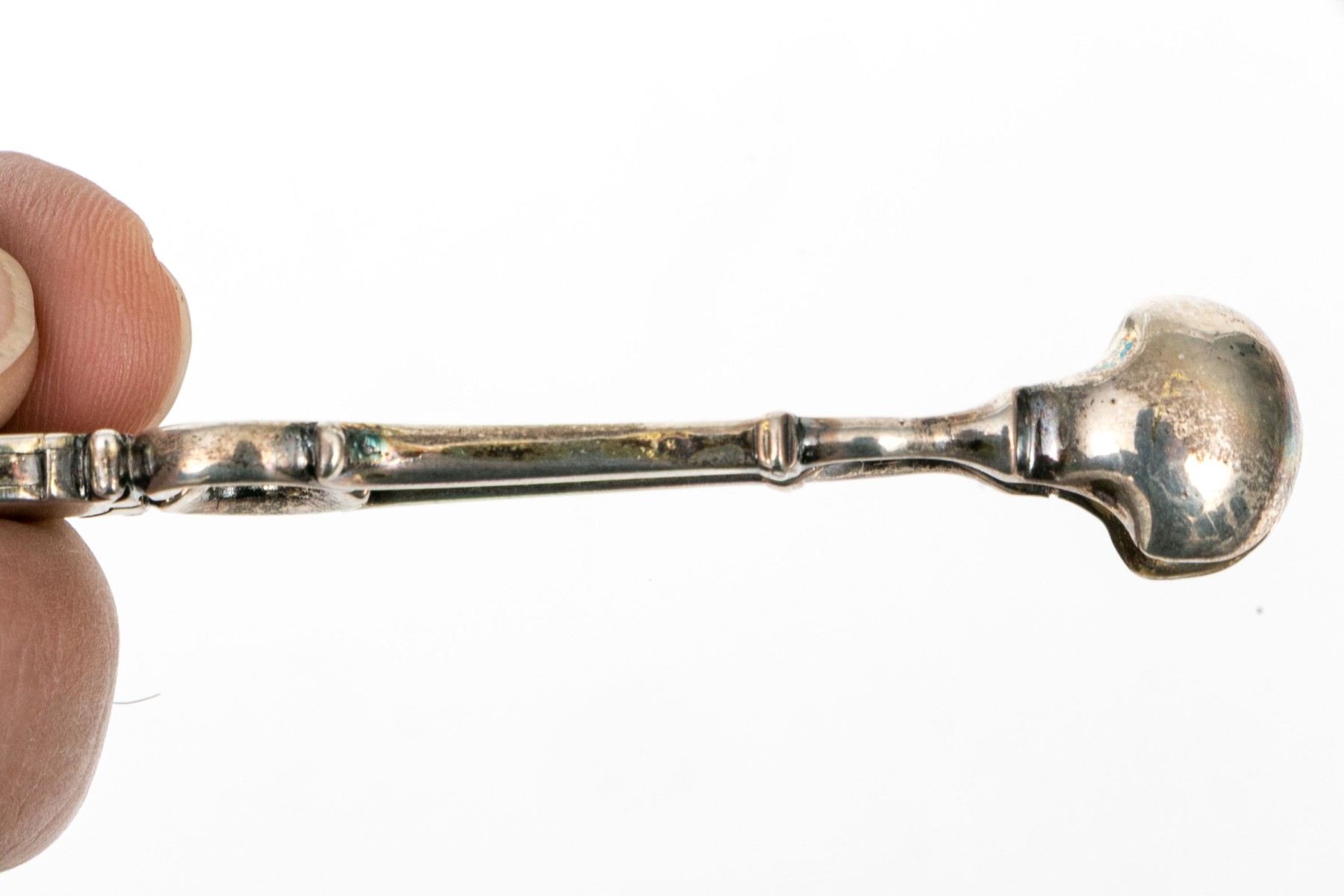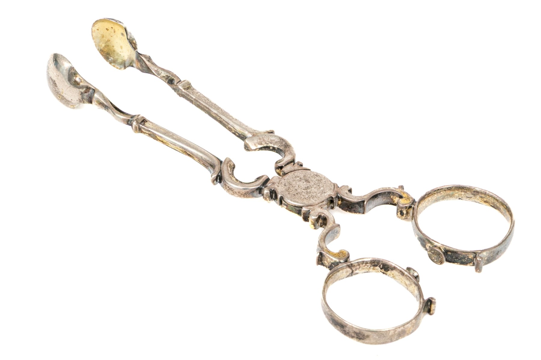 A lovely pair of silver sugar nips with rounded bowls on elegantly shaped arms meeting at a circular medallion center before finishing with circular handles.