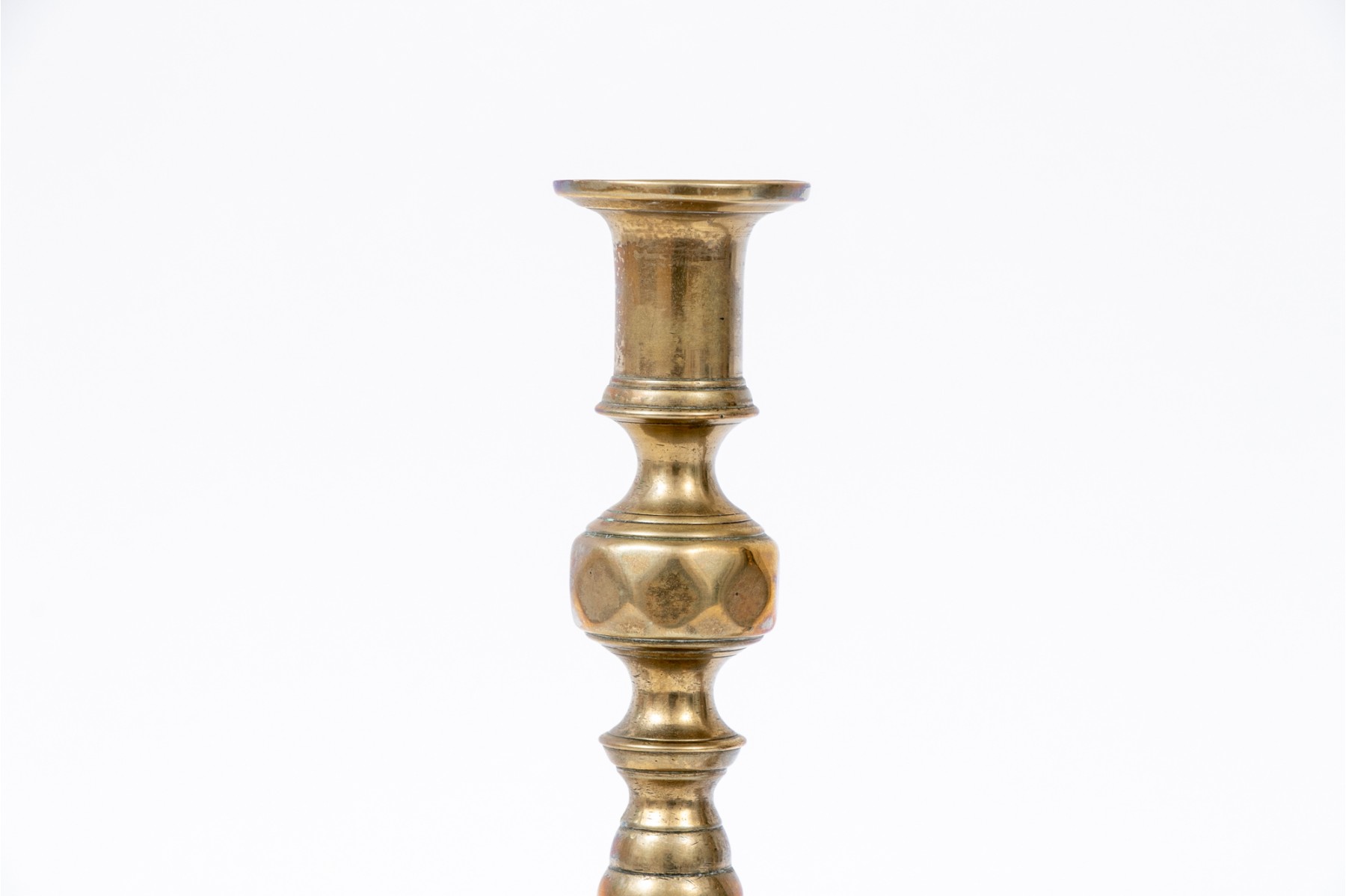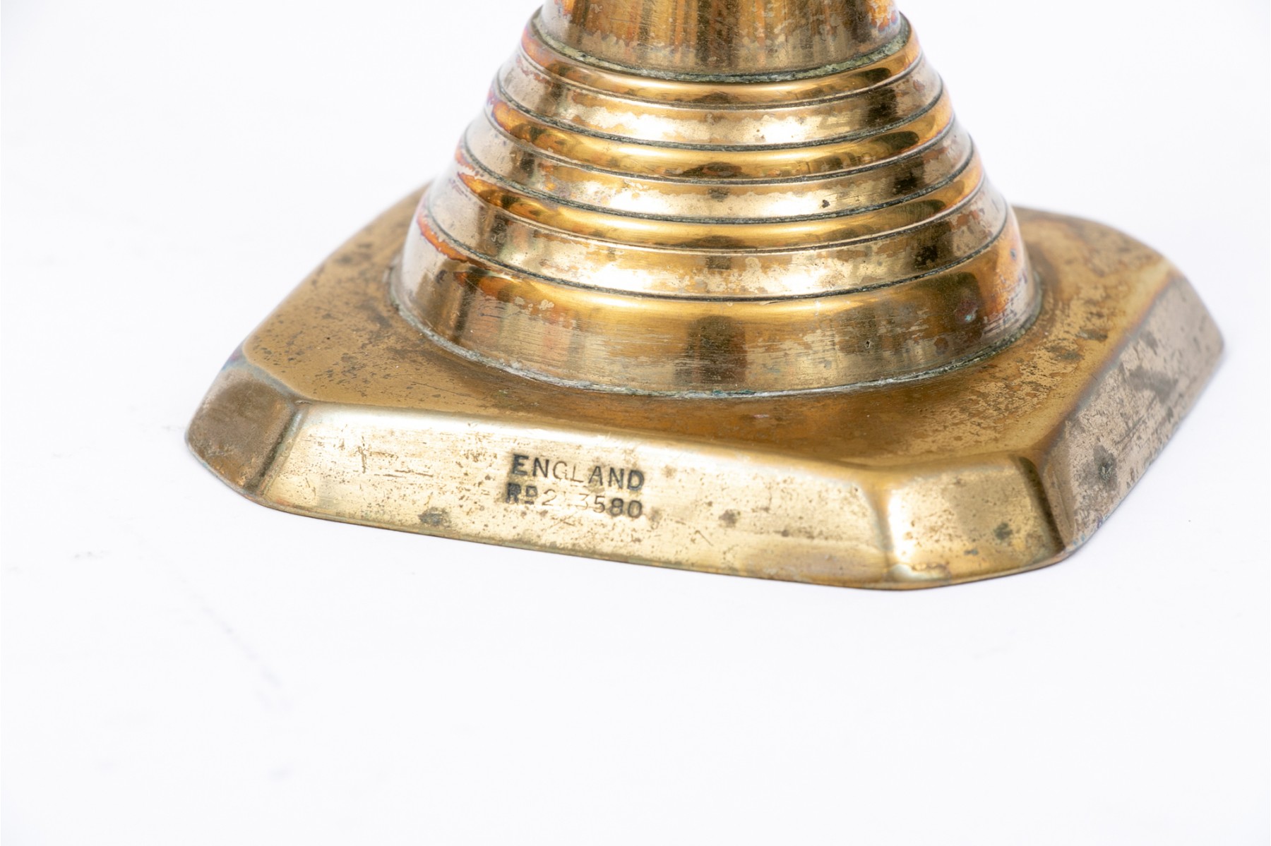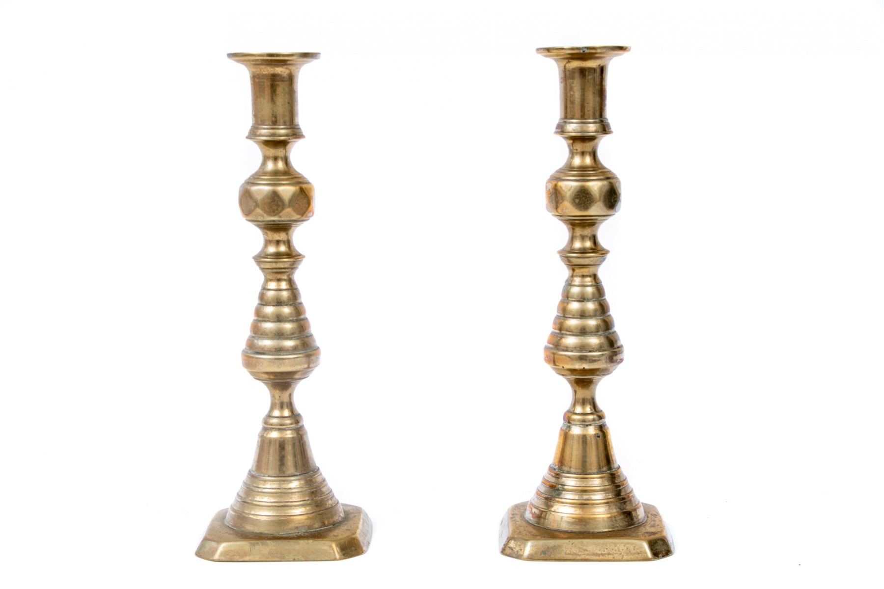 Pair of brass candlesticks with tiered beehive form, marked England Rd. 223580, indicating a design registration date of 1890. Each candlestick retaining it’s original internal push-ejector and button.