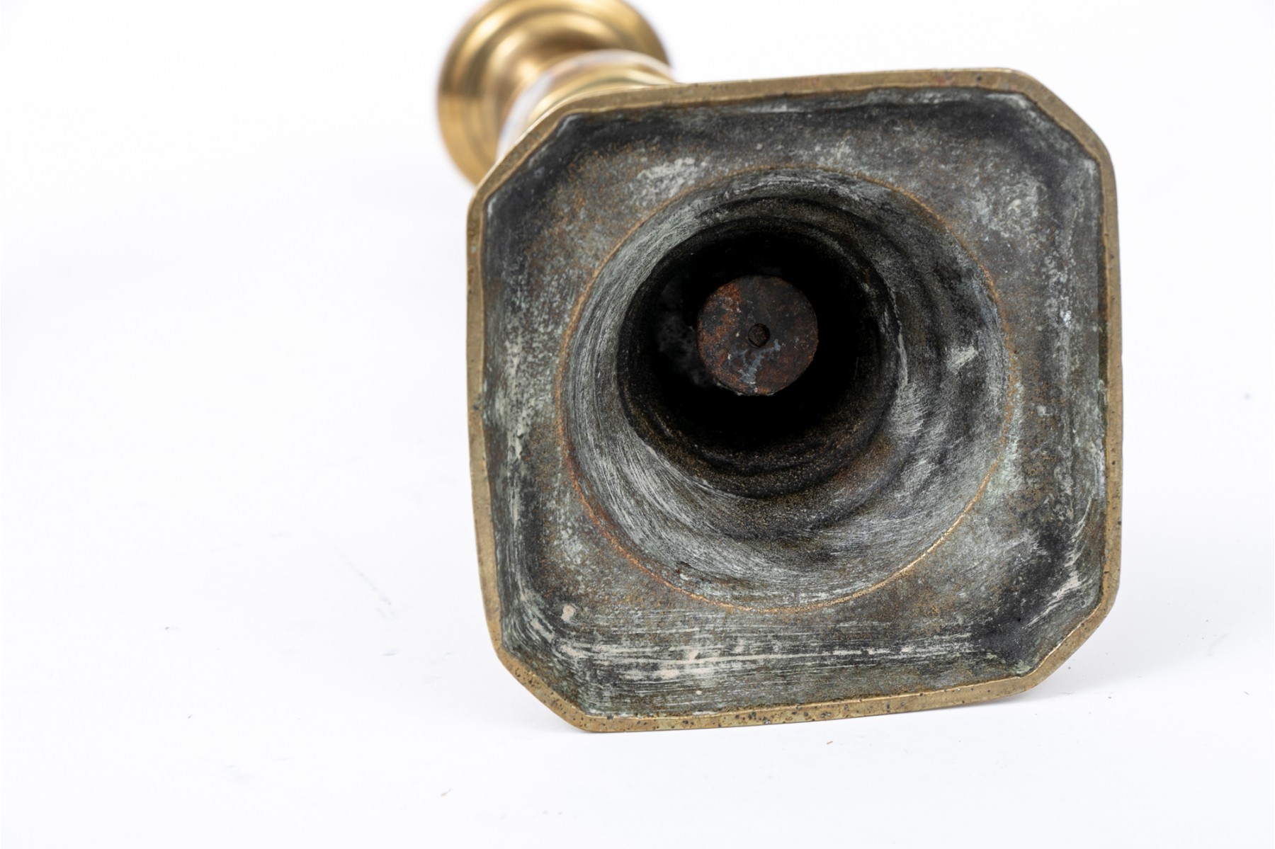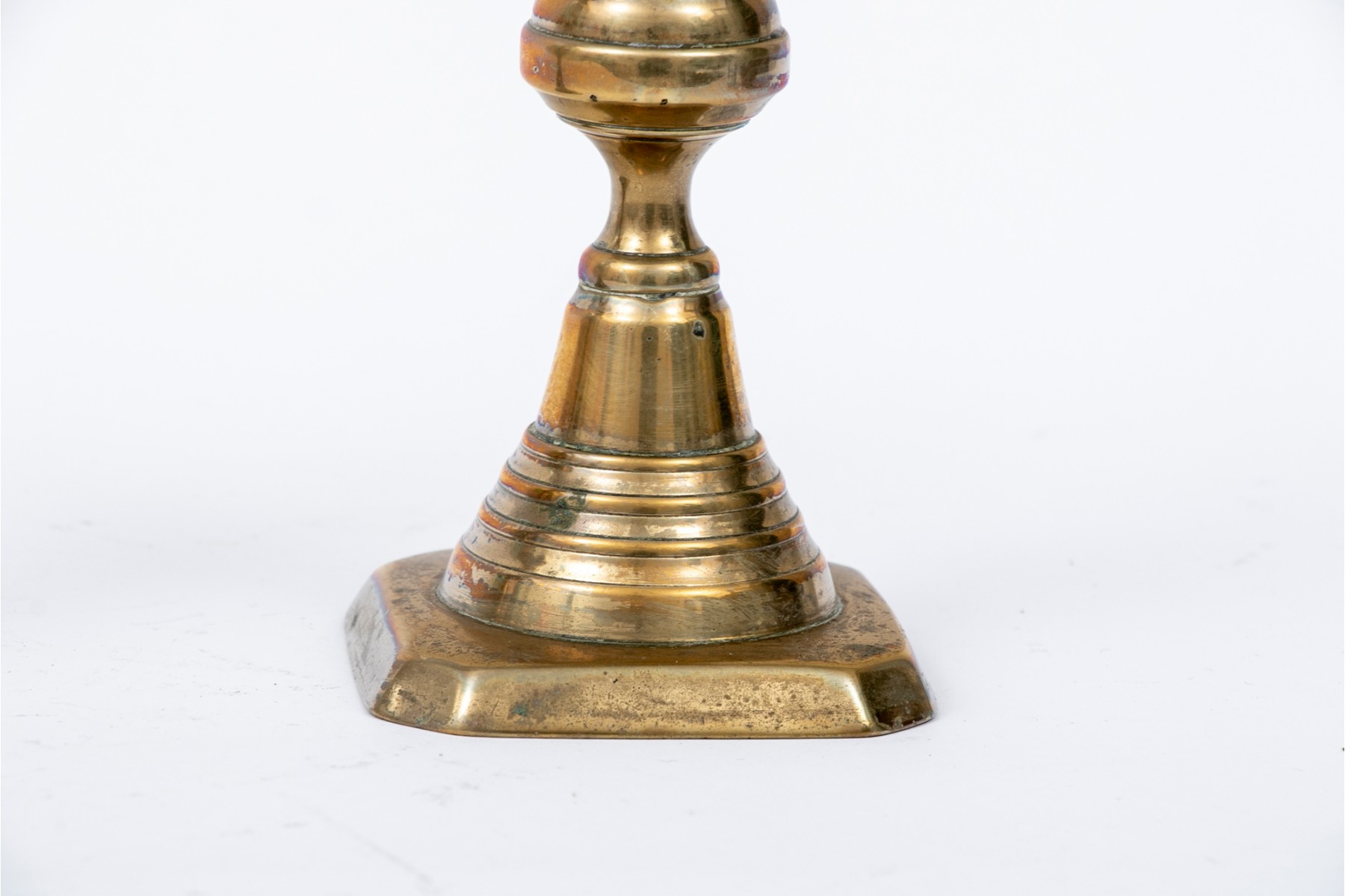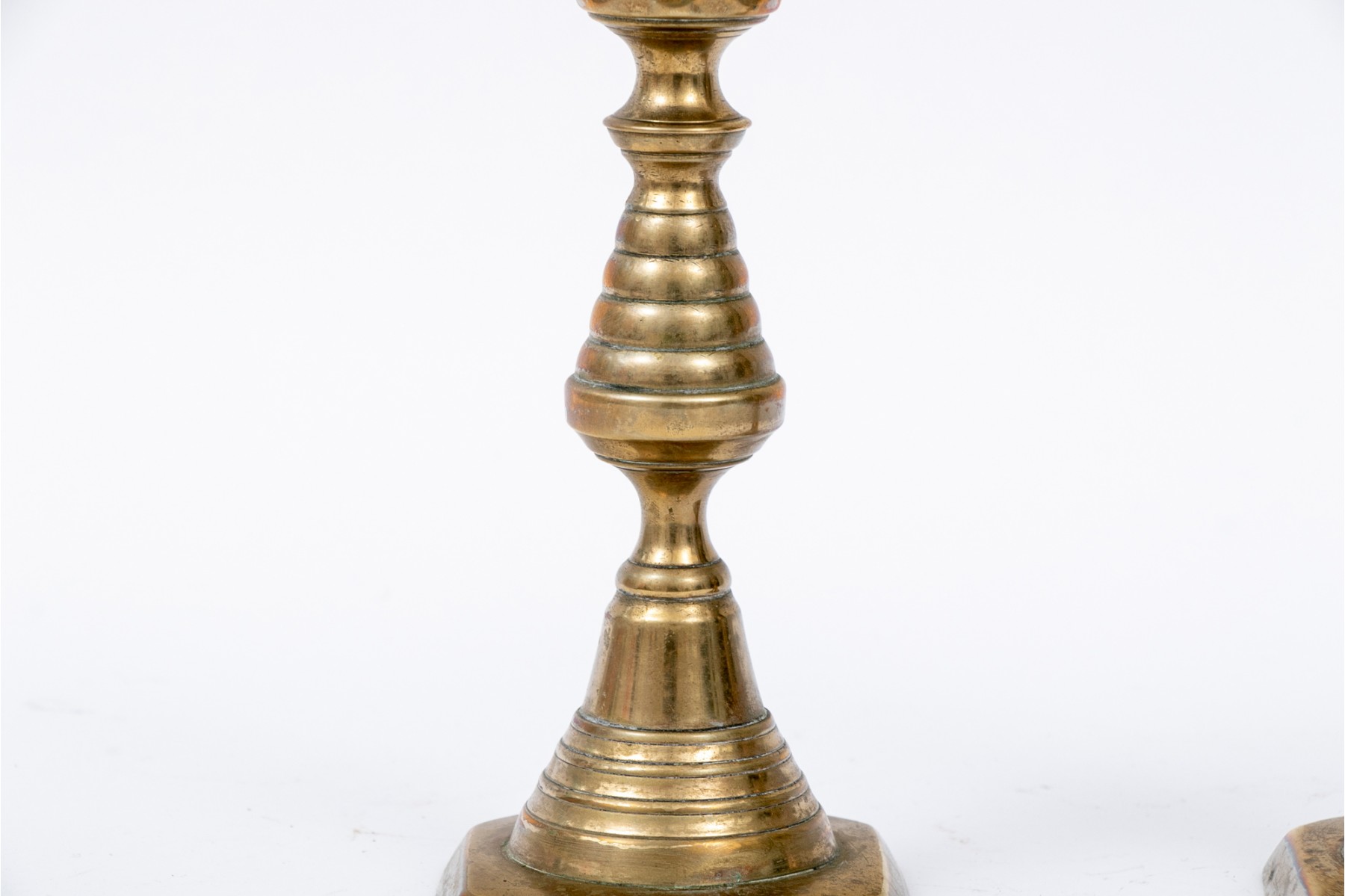 Pair of brass candlesticks with tiered beehive form, marked England Rd. 223580, indicating a design registration date of 1890. Each candlestick retaining it’s original internal push-ejector and button.