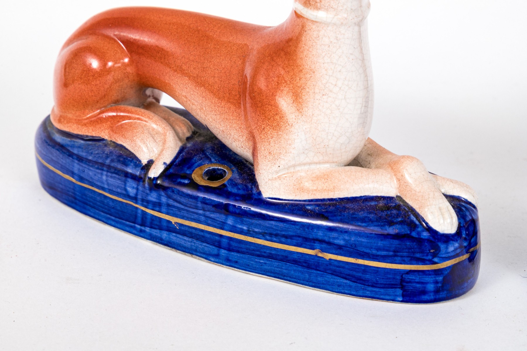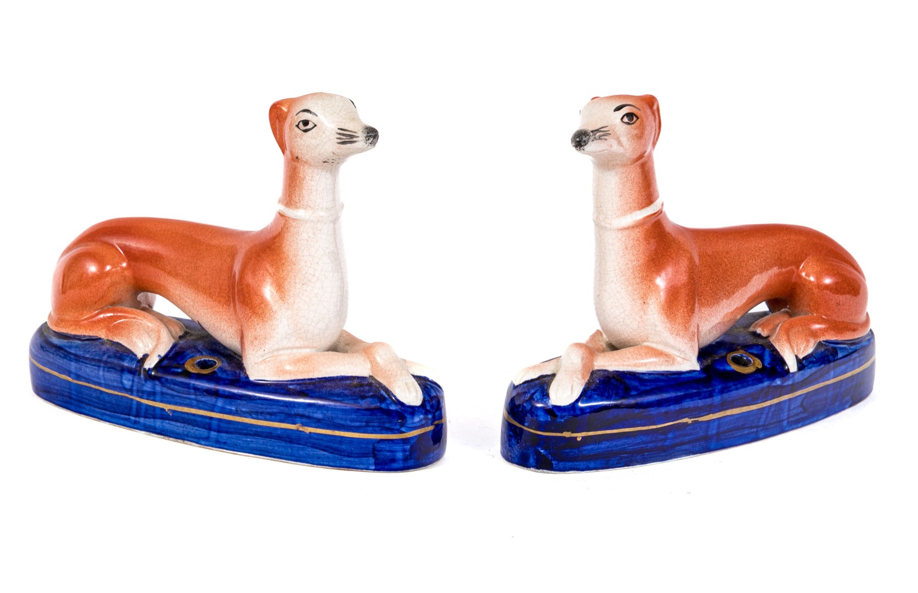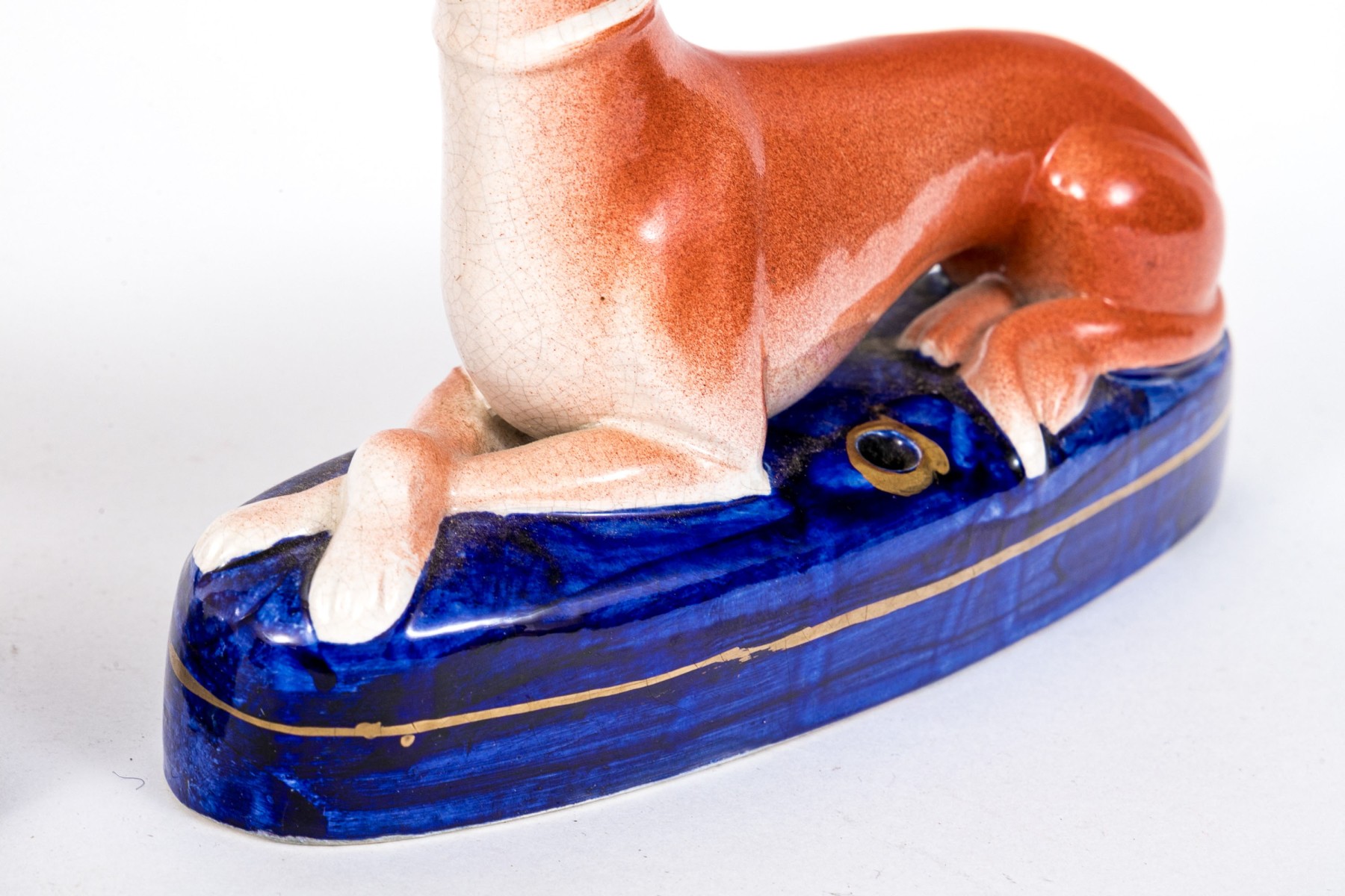 A pair of large hand painted Staffordshire whippet inkwells having a crackle underglaze and gilded decorations.