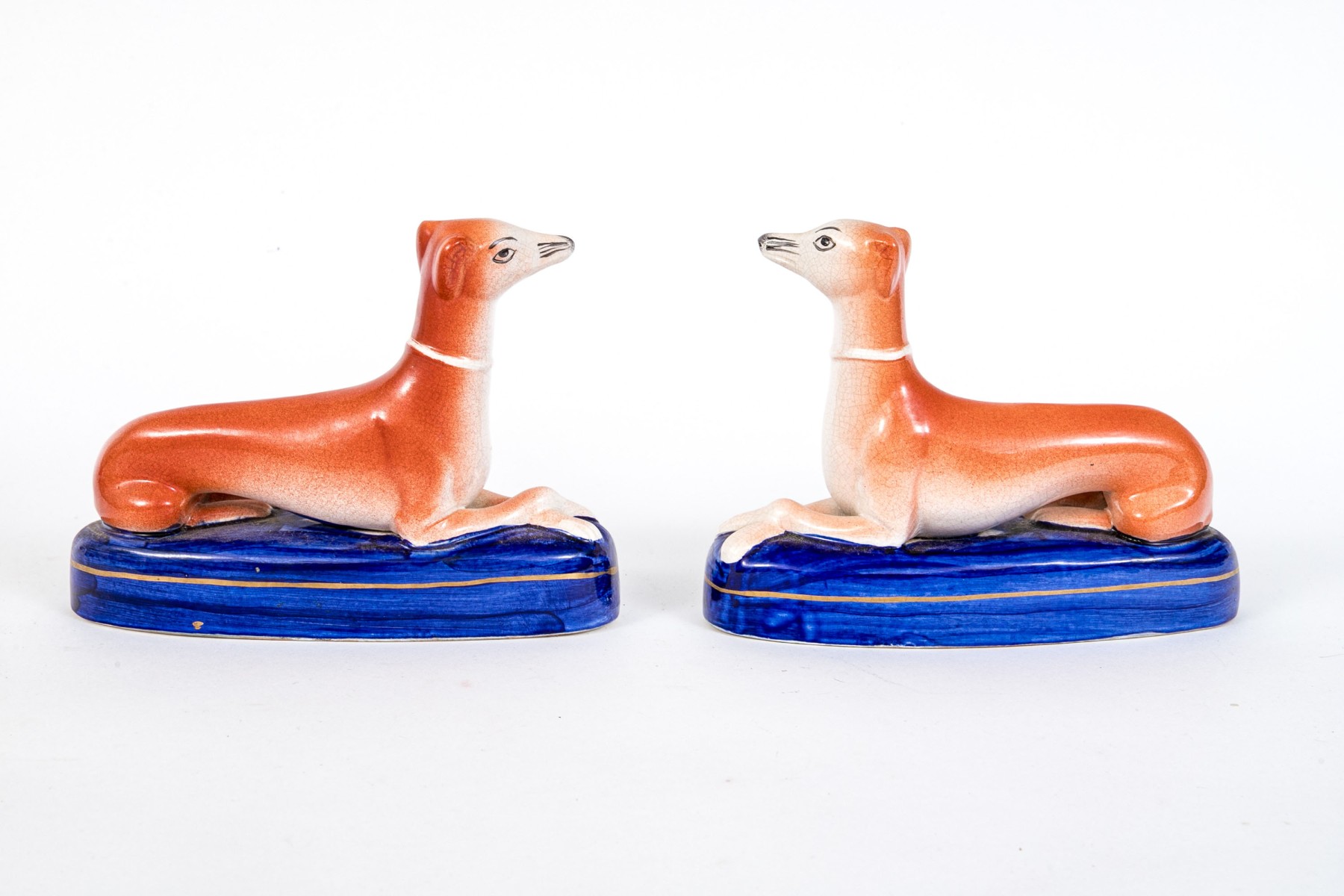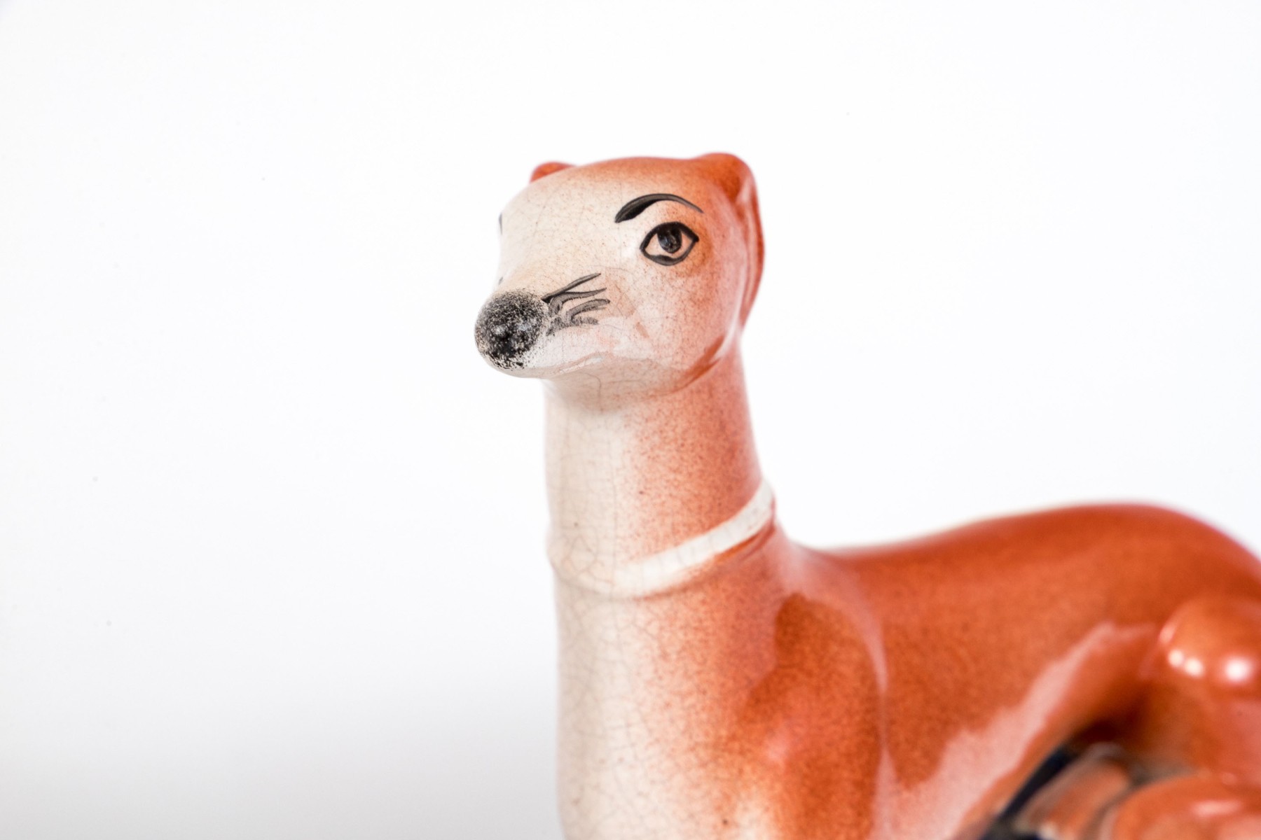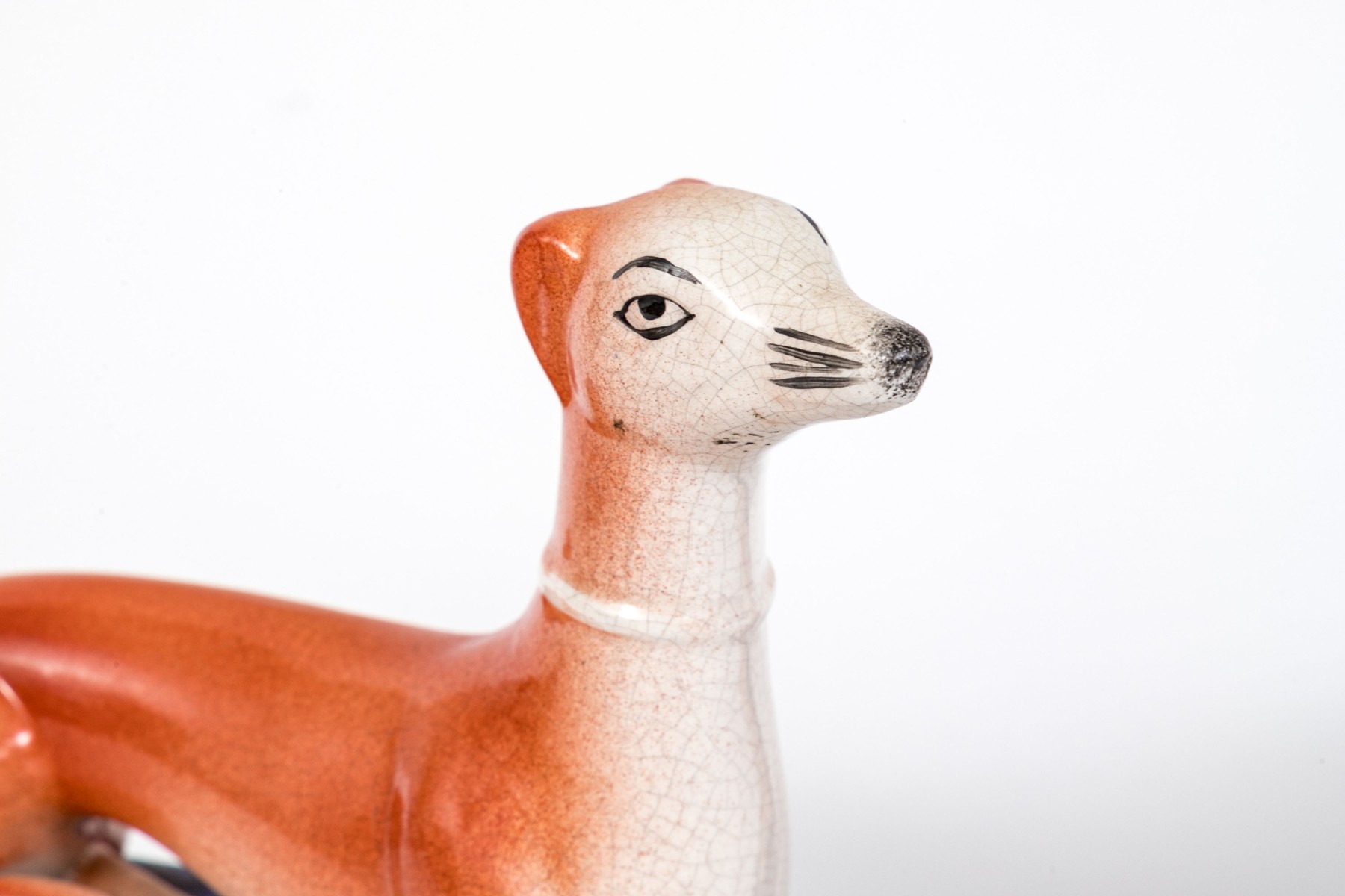 A pair of large hand painted Staffordshire whippet inkwells having a crackle underglaze and gilded decorations.