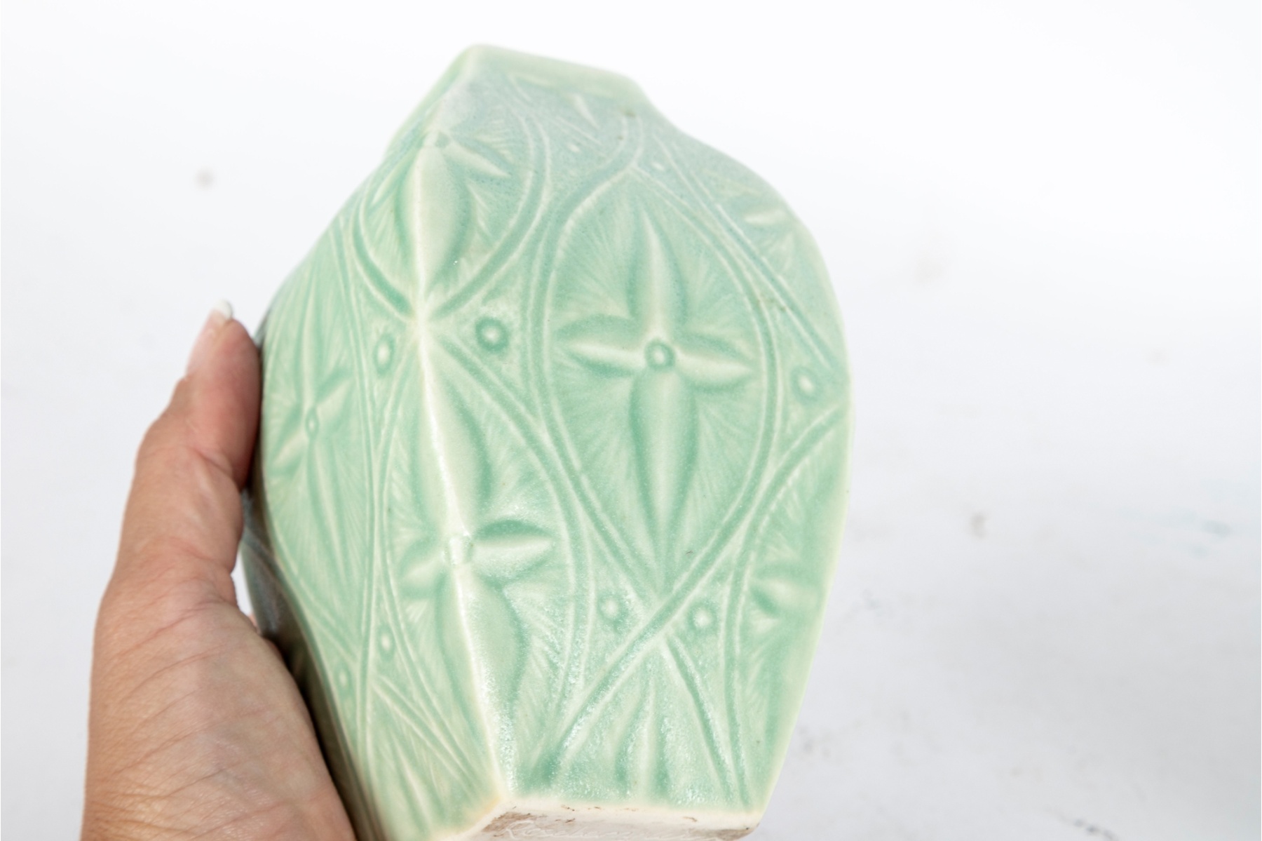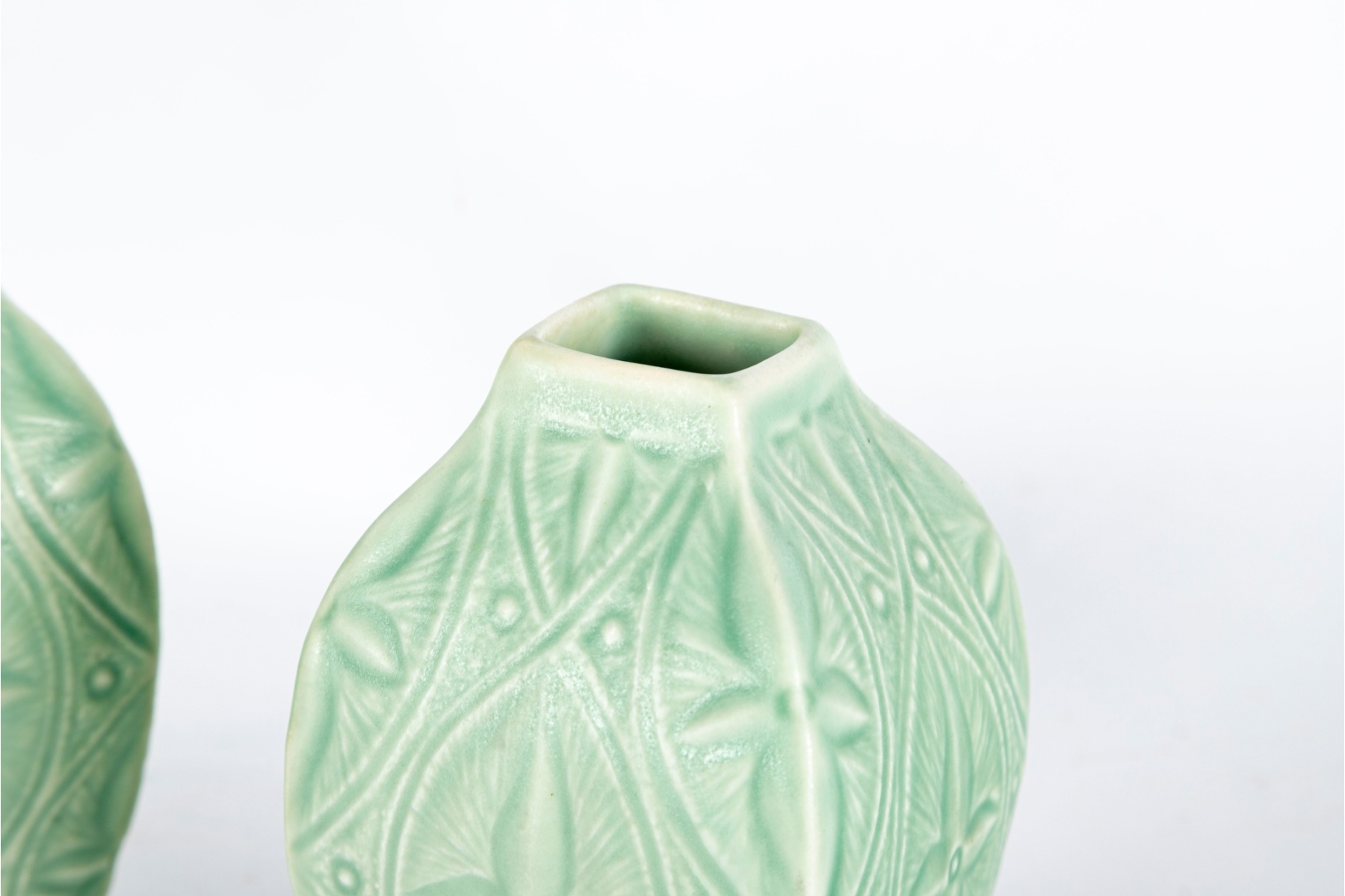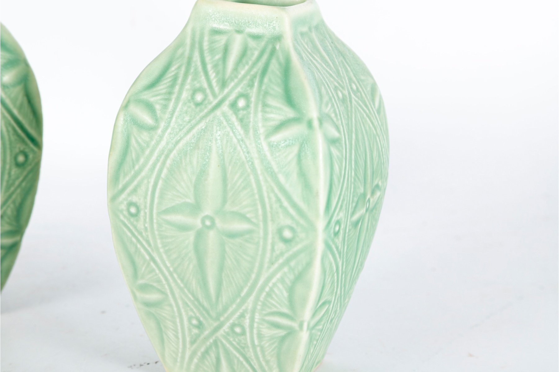Pair of Roseberry-Winn Pottery vases in soft matte green glaze, each with raised geometric and floral motif in low relief. Elegant midcentury-inspired form with gently flared rims.