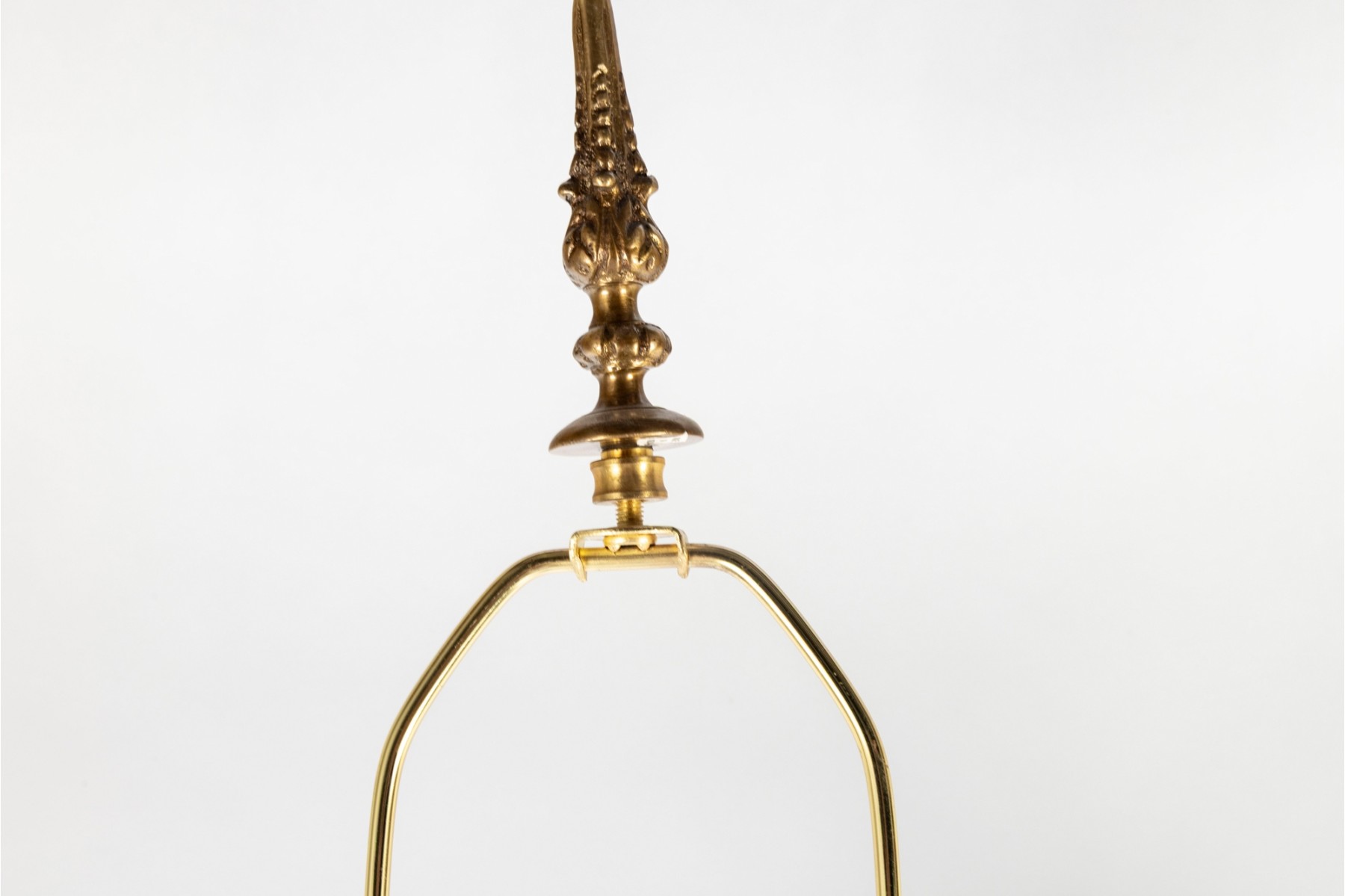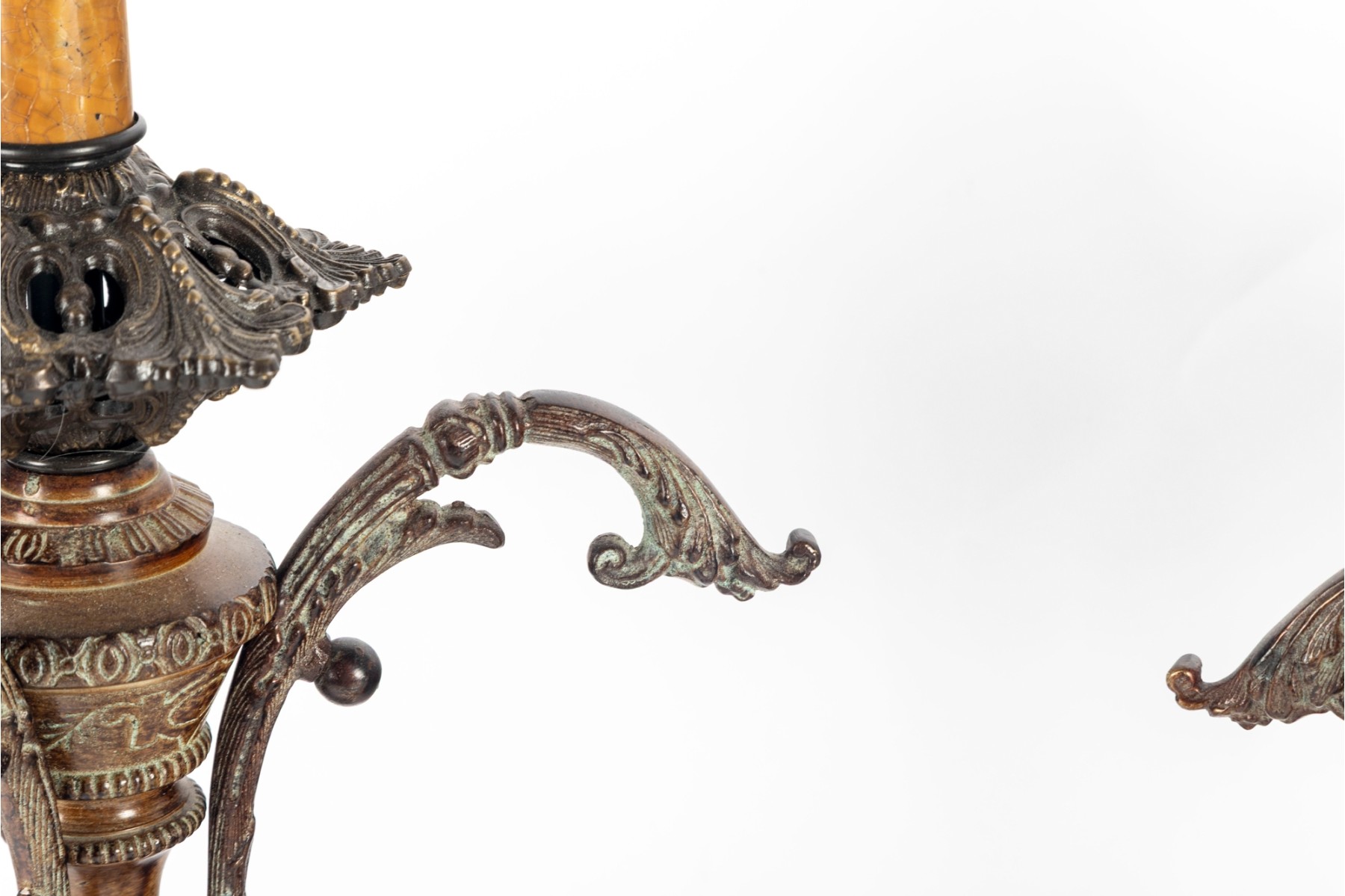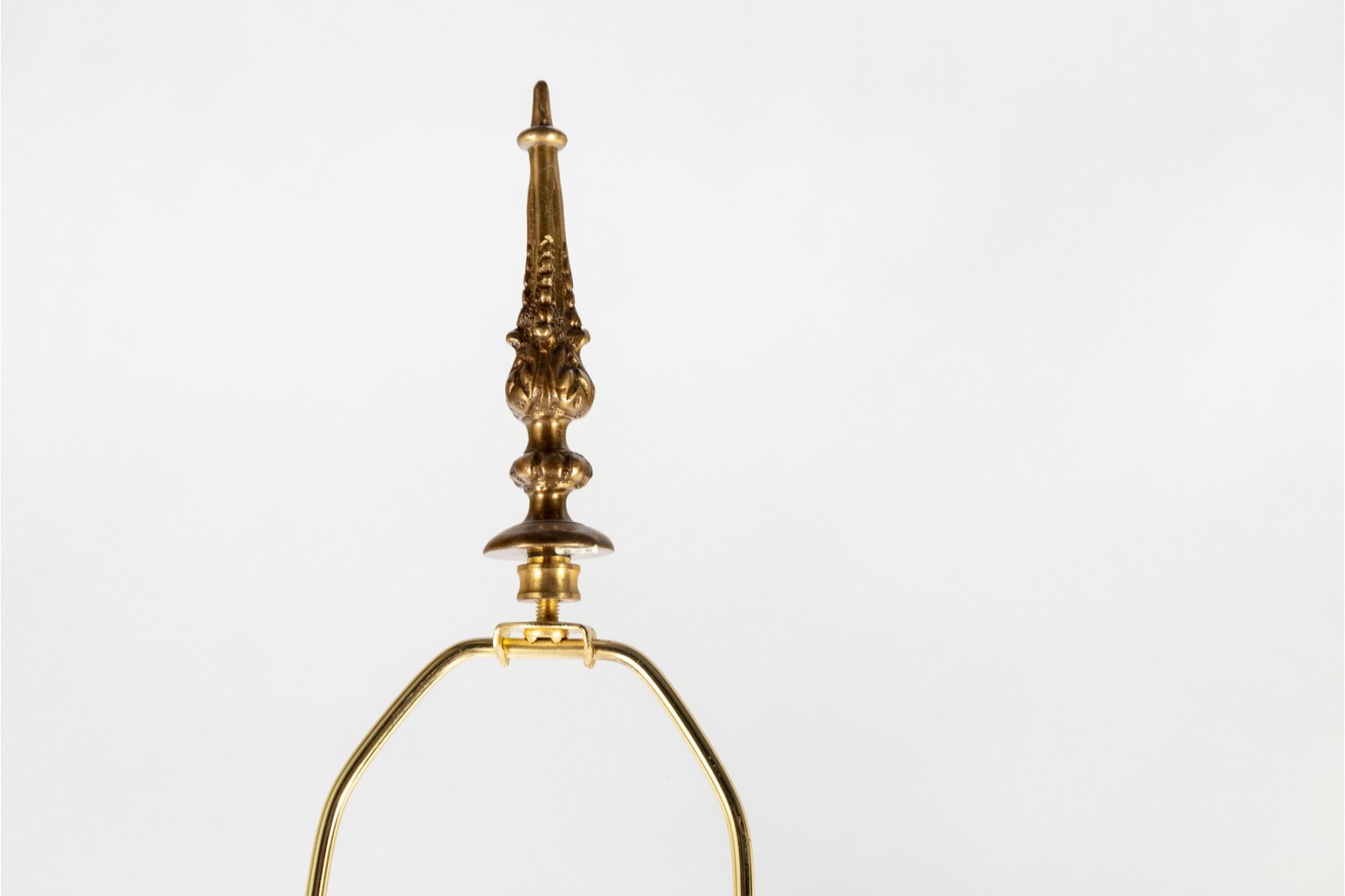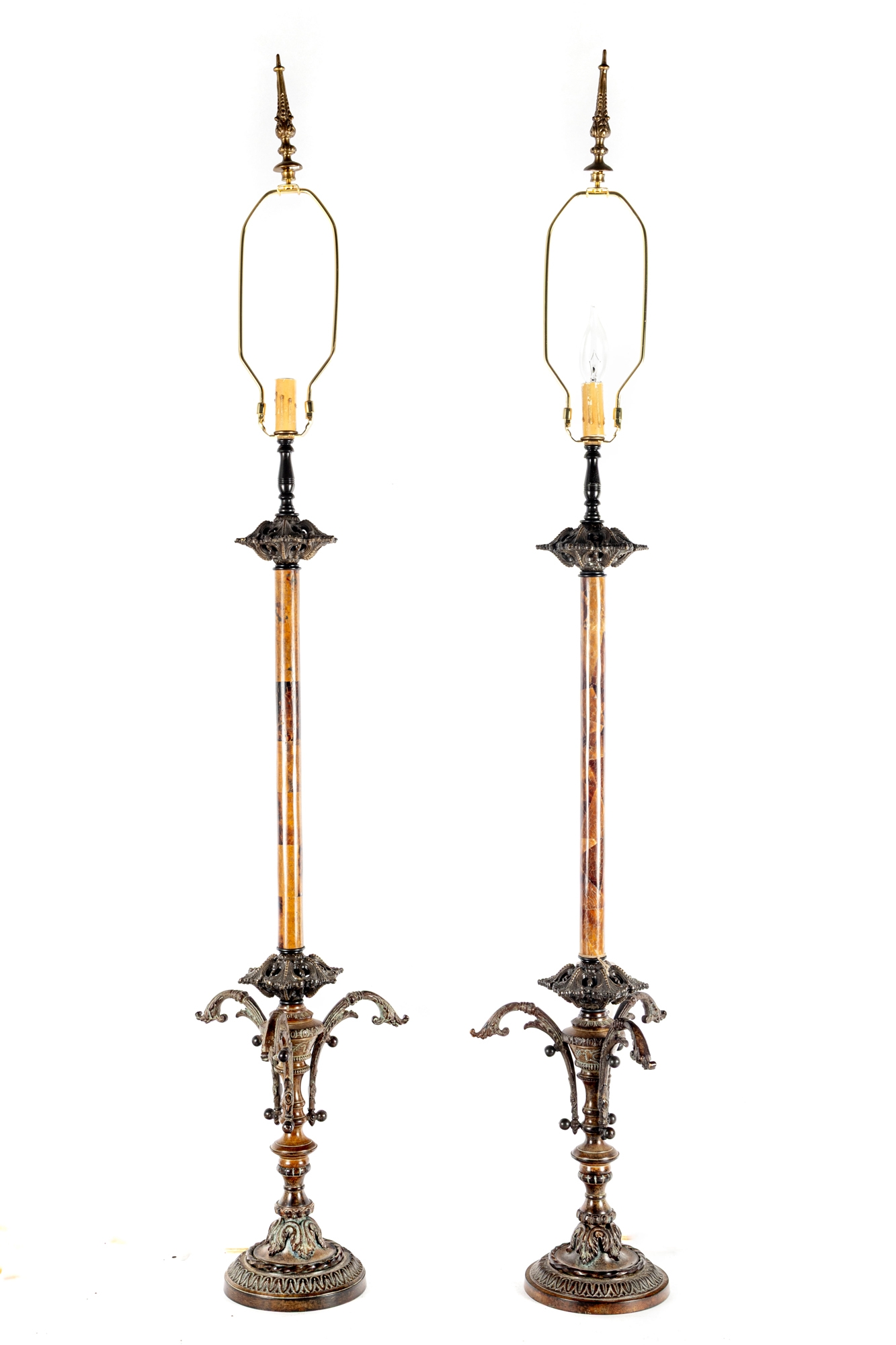 Elegant pair of tall antique table lamps featuring amber glass columns accented with ornate cast brass metalwork. Each lamp displays intricate detailing at the base and top, with decorative finials and harp fittings. Originally procured from the North Carolina Governor’s estate (Executive Mansion collection). Shades not included.