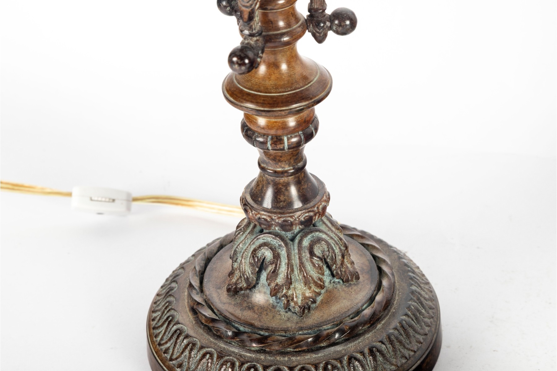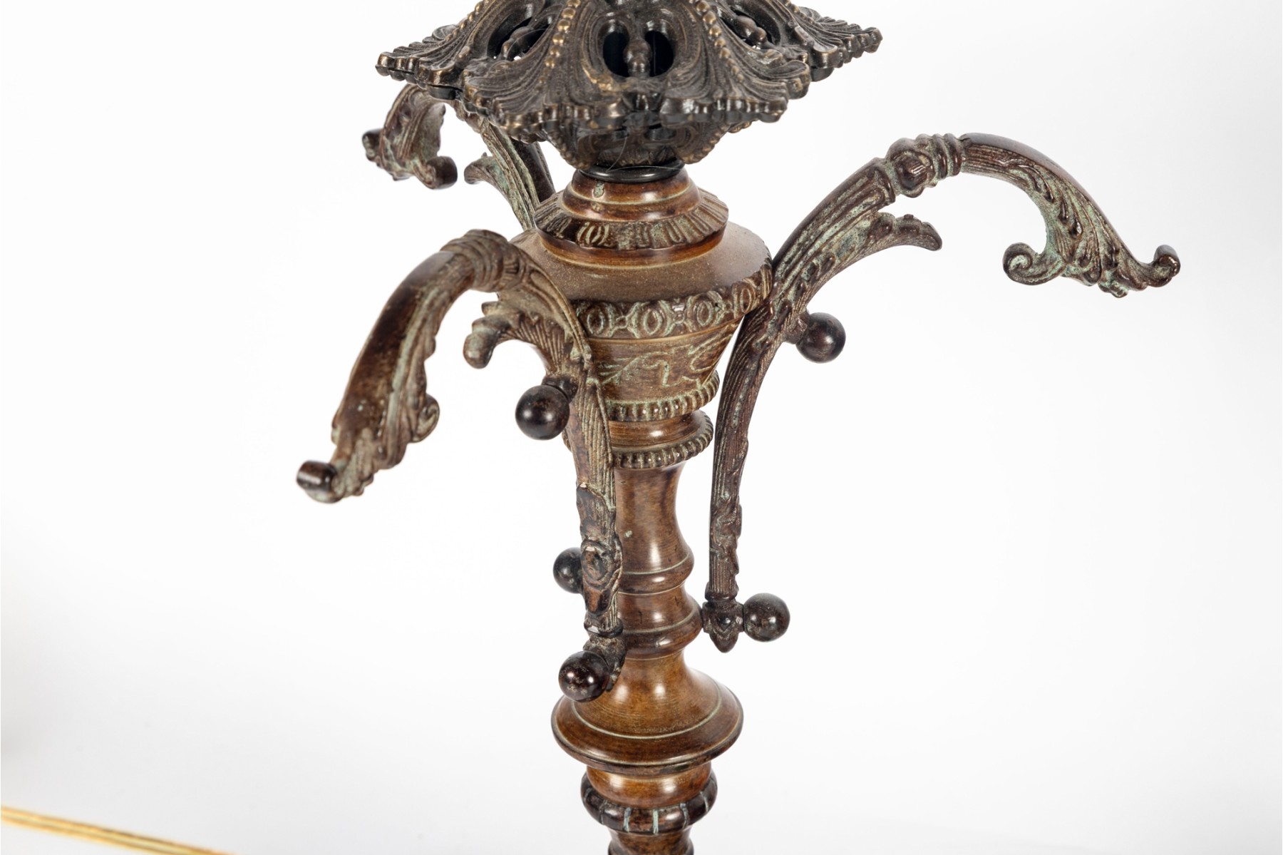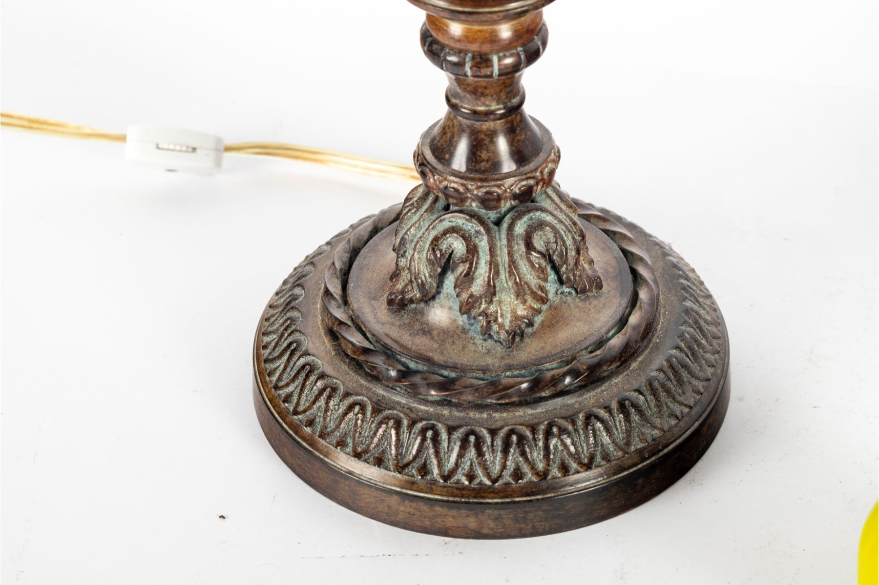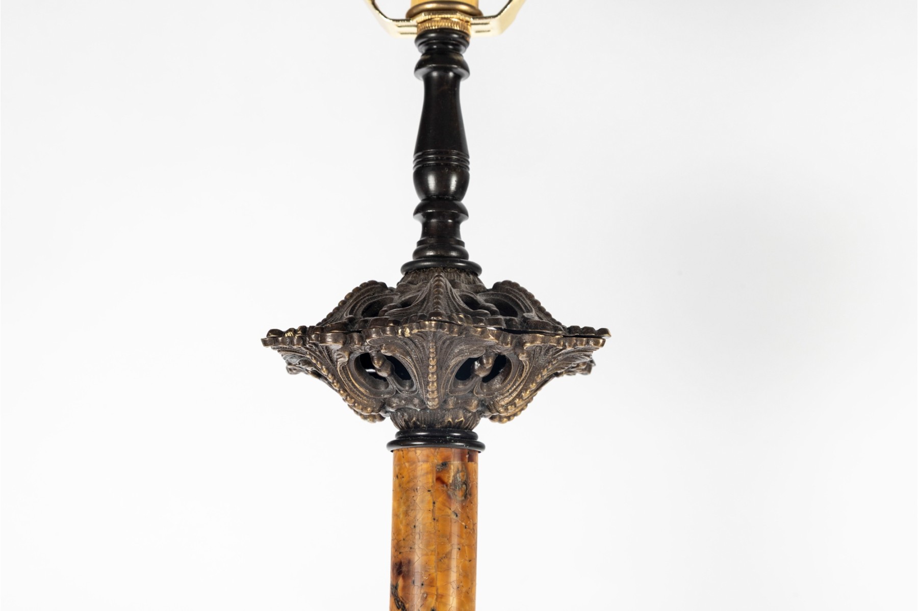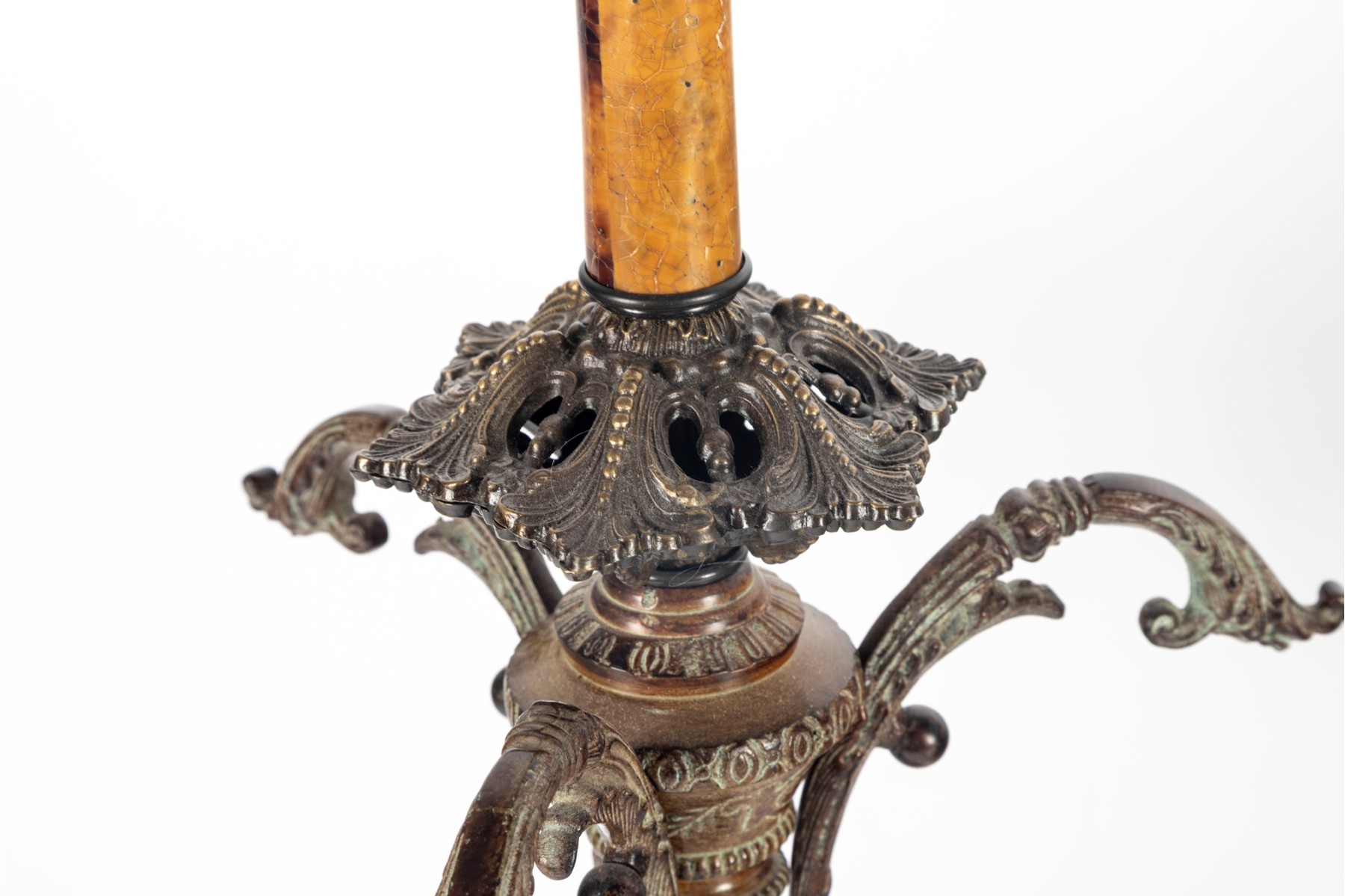 Elegant pair of tall antique table lamps featuring amber glass columns accented with ornate cast brass metalwork. Each lamp displays intricate detailing at the base and top, with decorative finials and harp fittings. Originally procured from the North Carolina Governor’s estate (Executive Mansion collection). Shades not included.