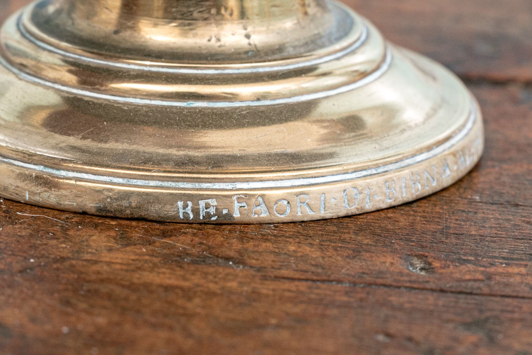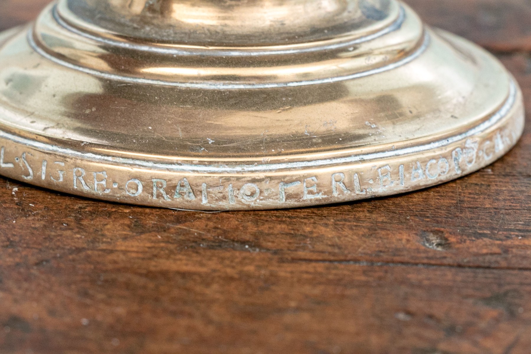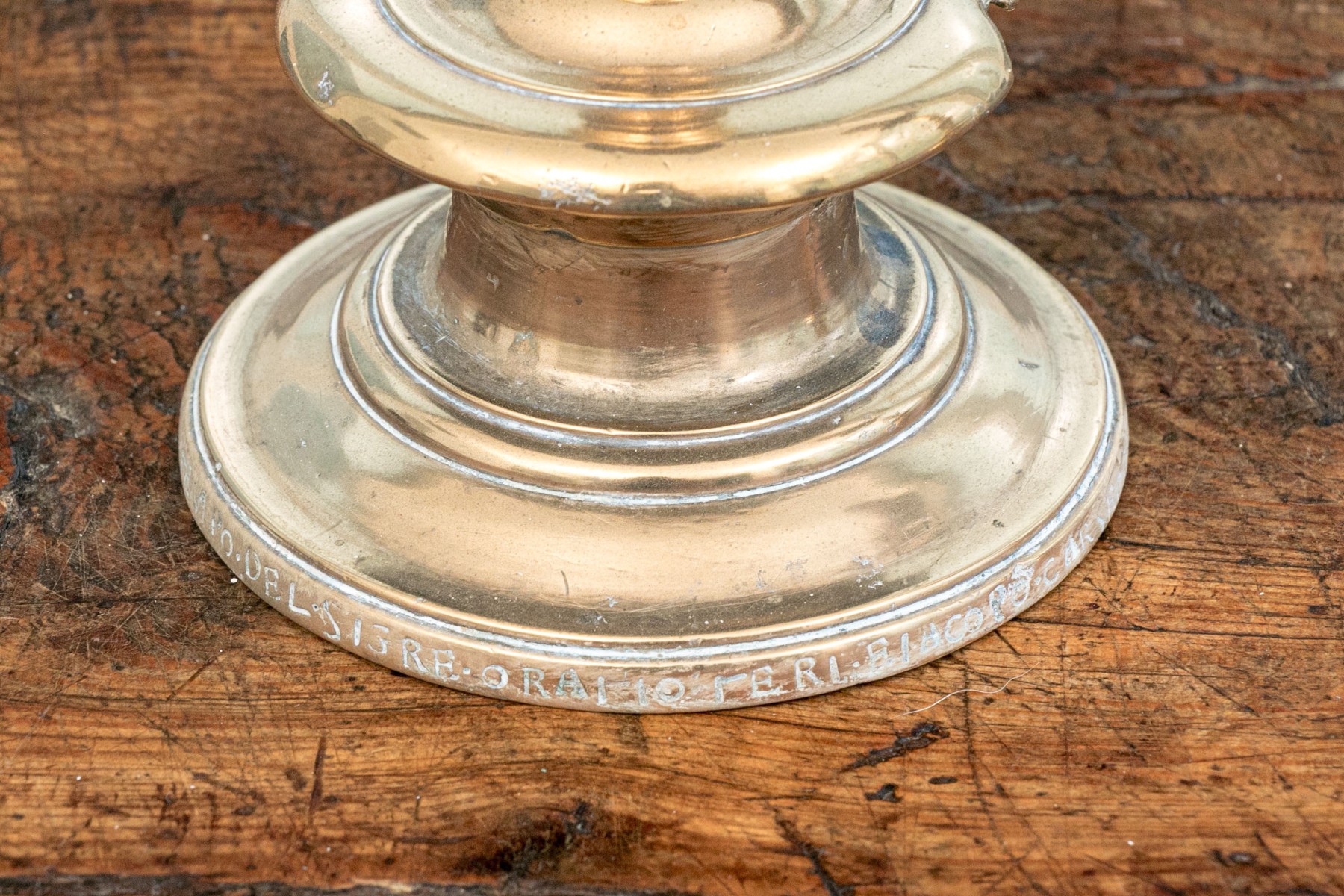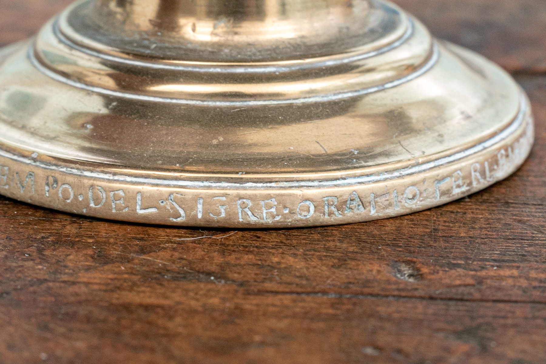 Heavy antique brass candlesticks made in two parts with shaped standards, pedestal bases and wide bobeches. An inscription (possibly Italian and/or Latin) along the base edges. Along with real candles (not used).