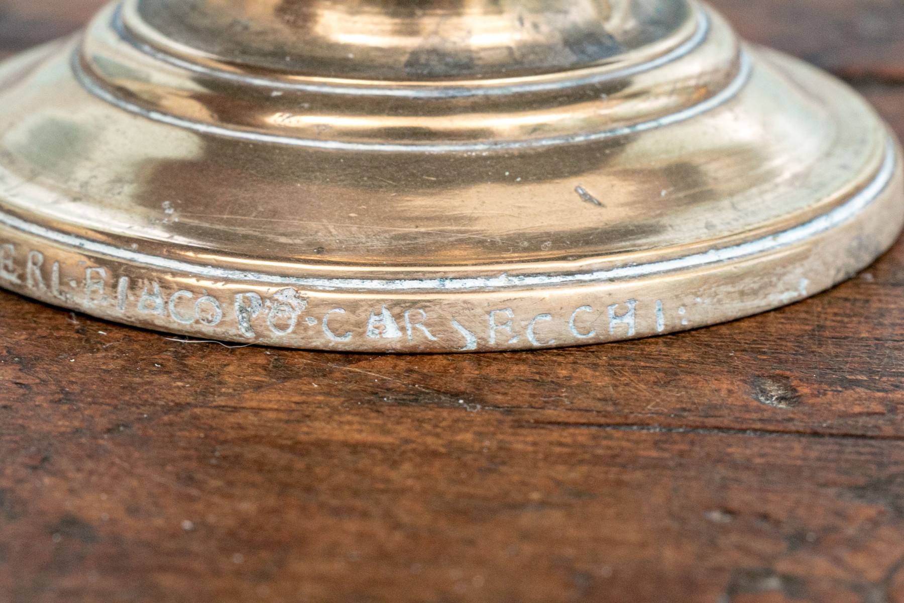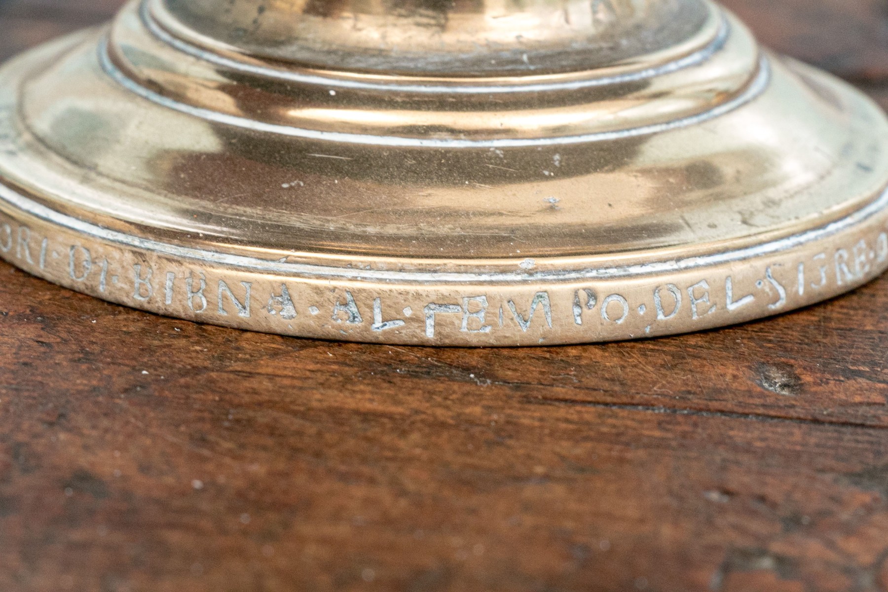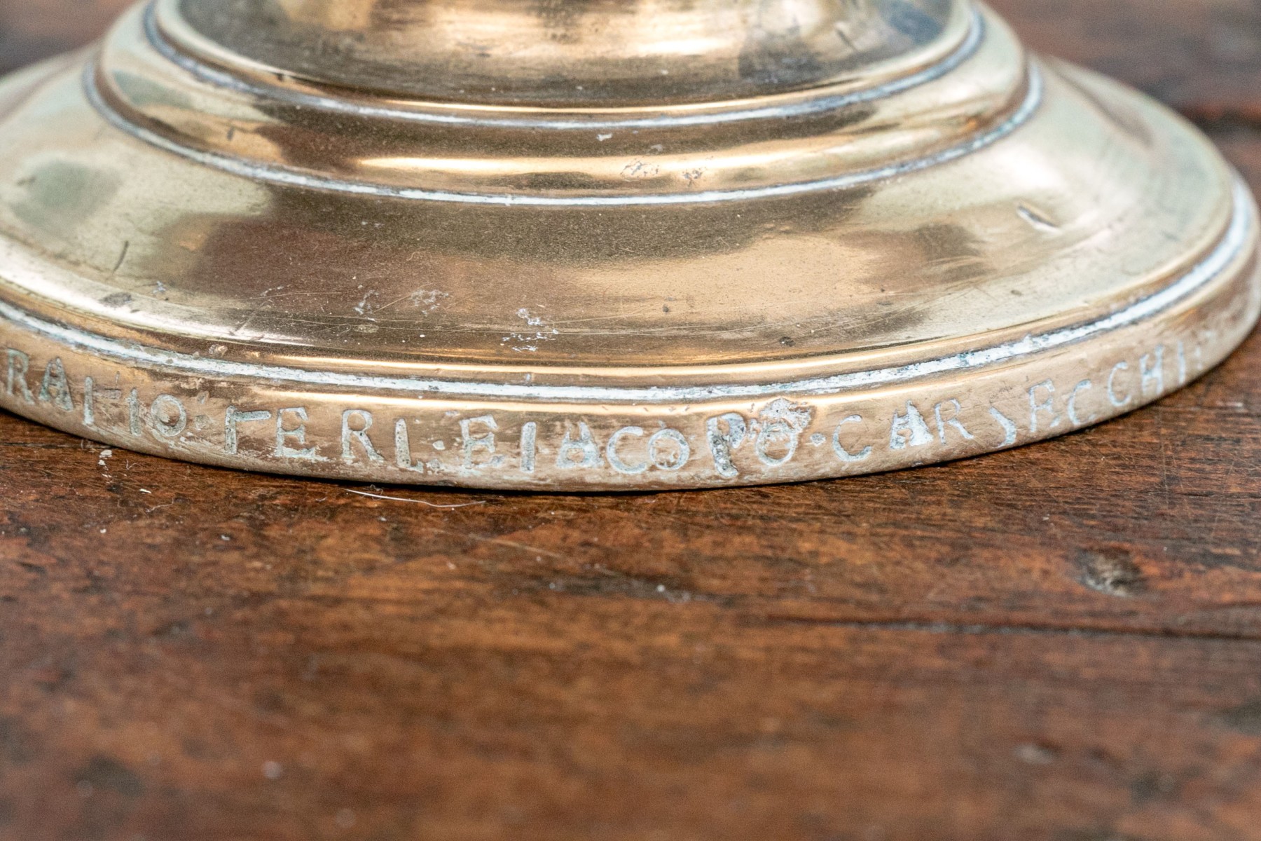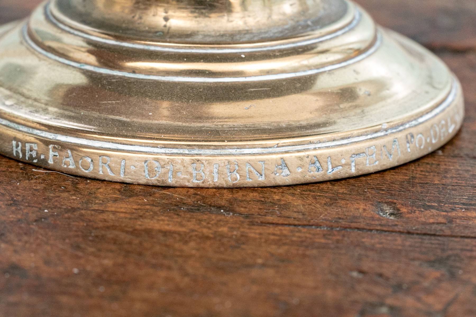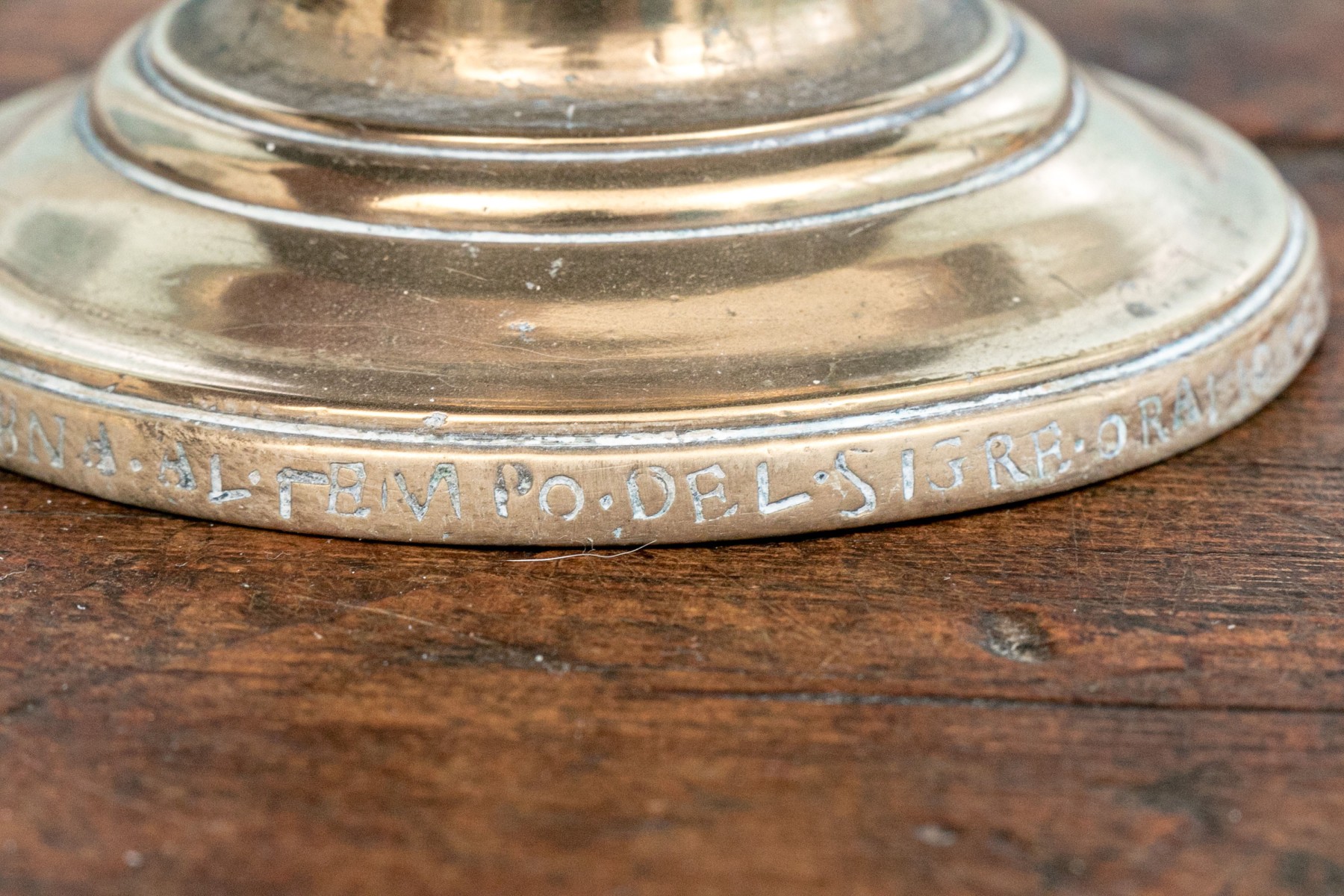 Heavy antique brass candlesticks made in two parts with shaped standards, pedestal bases and wide bobeches. An inscription (possibly Italian and/or Latin) along the base edges. Along with real candles (not used).