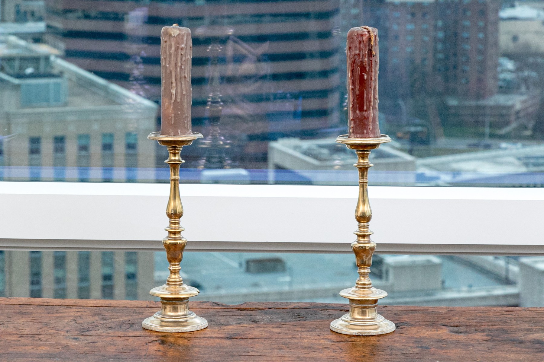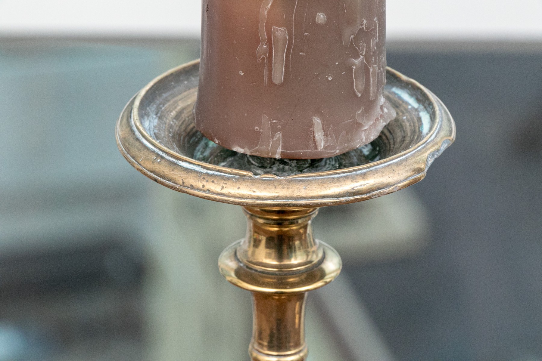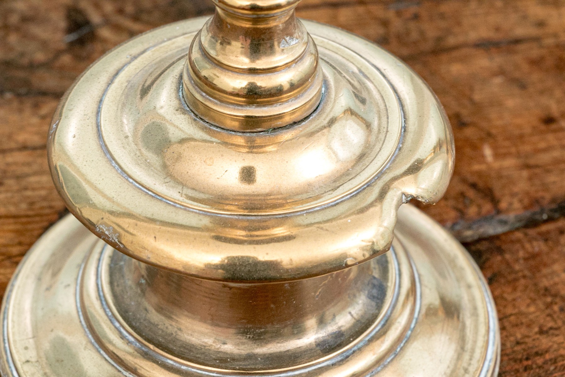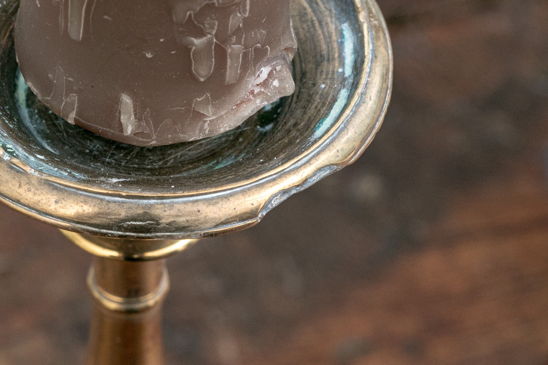 Heavy antique brass candlesticks made in two parts with shaped standards, pedestal bases and wide bobeches. An inscription (possibly Italian and/or Latin) along the base edges. Along with real candles (not used).