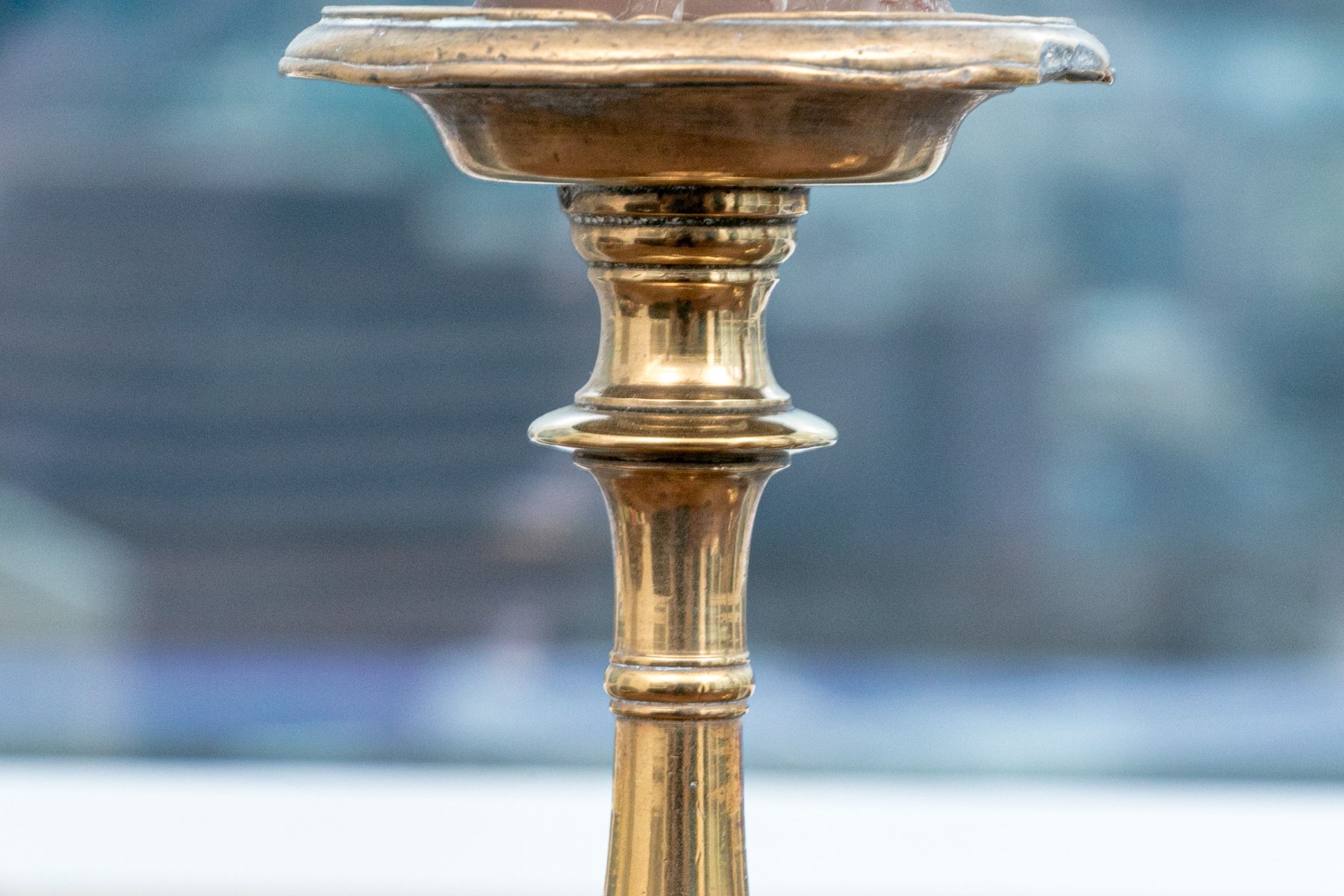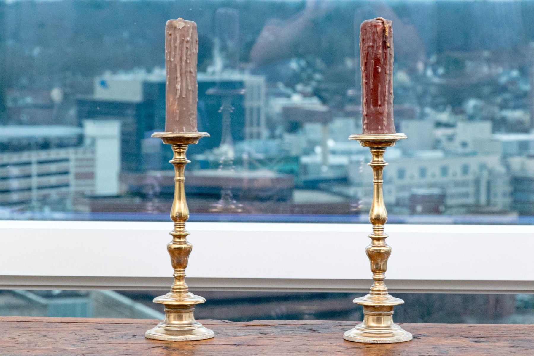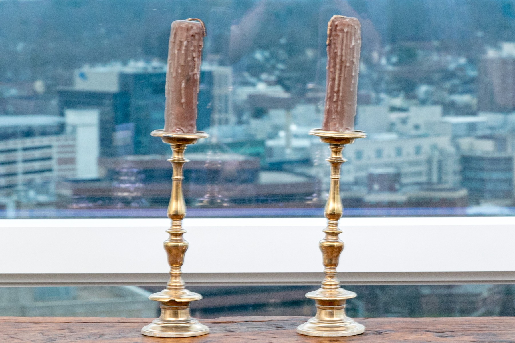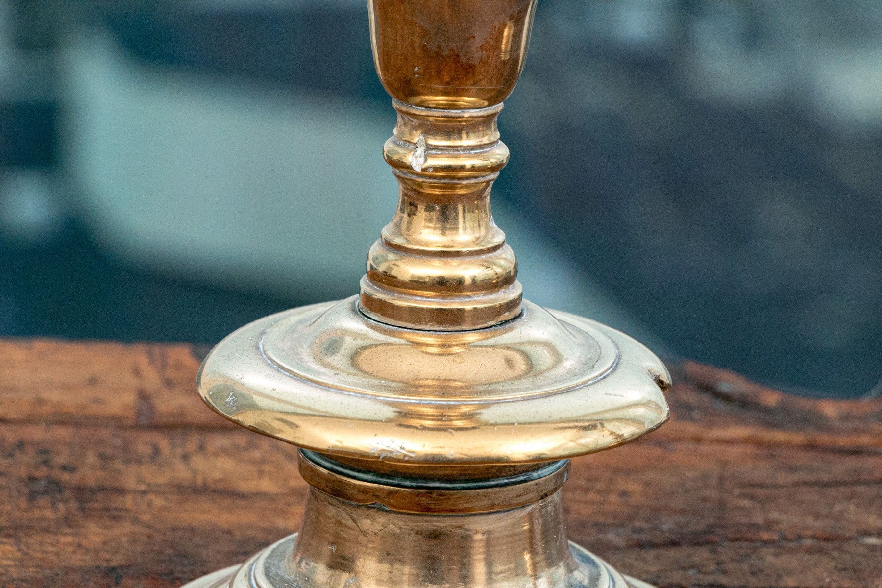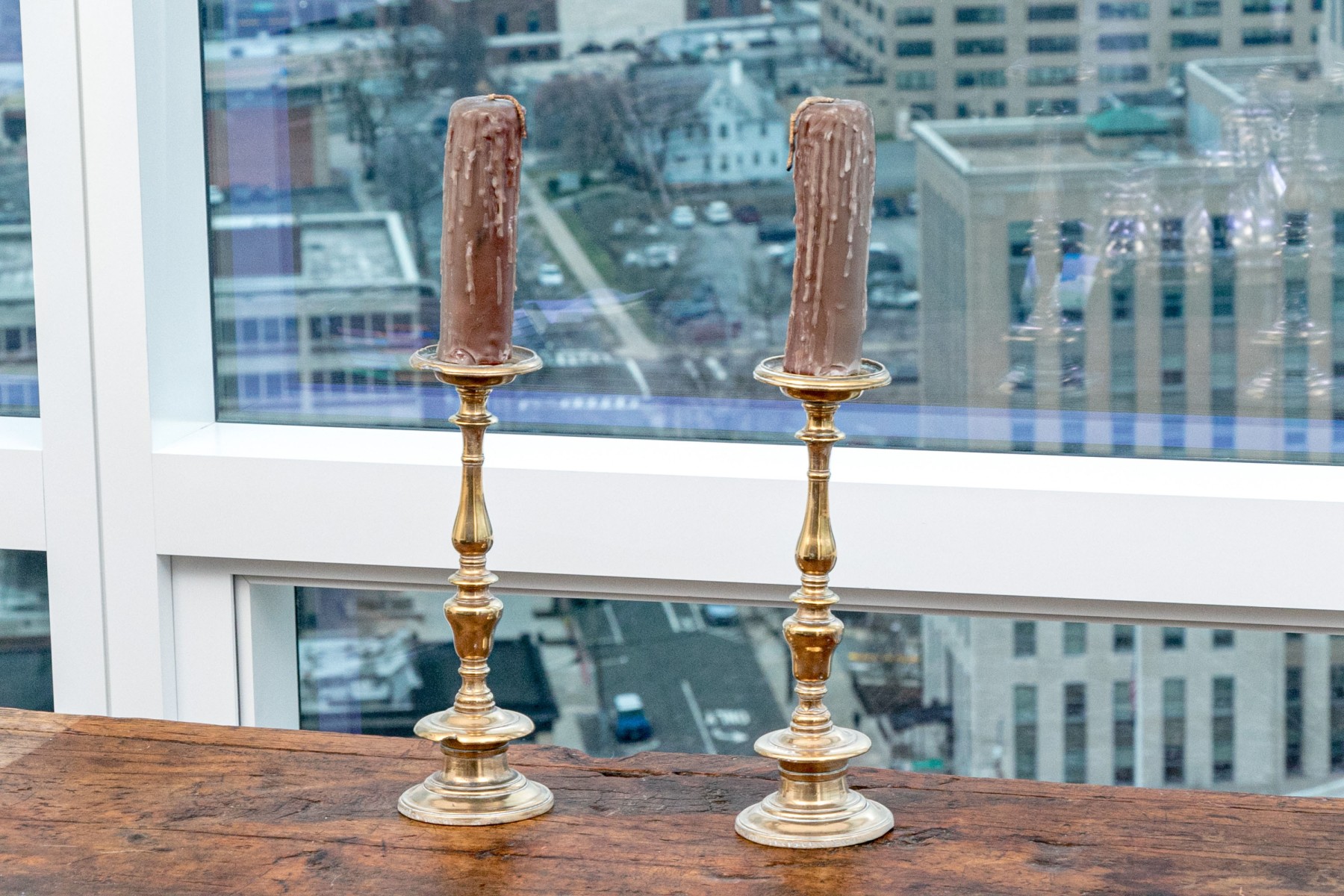 Heavy antique brass candlesticks made in two parts with shaped standards, pedestal bases and wide bobeches. An inscription (possibly Italian and/or Latin) along the base edges. Along with real candles (not used).