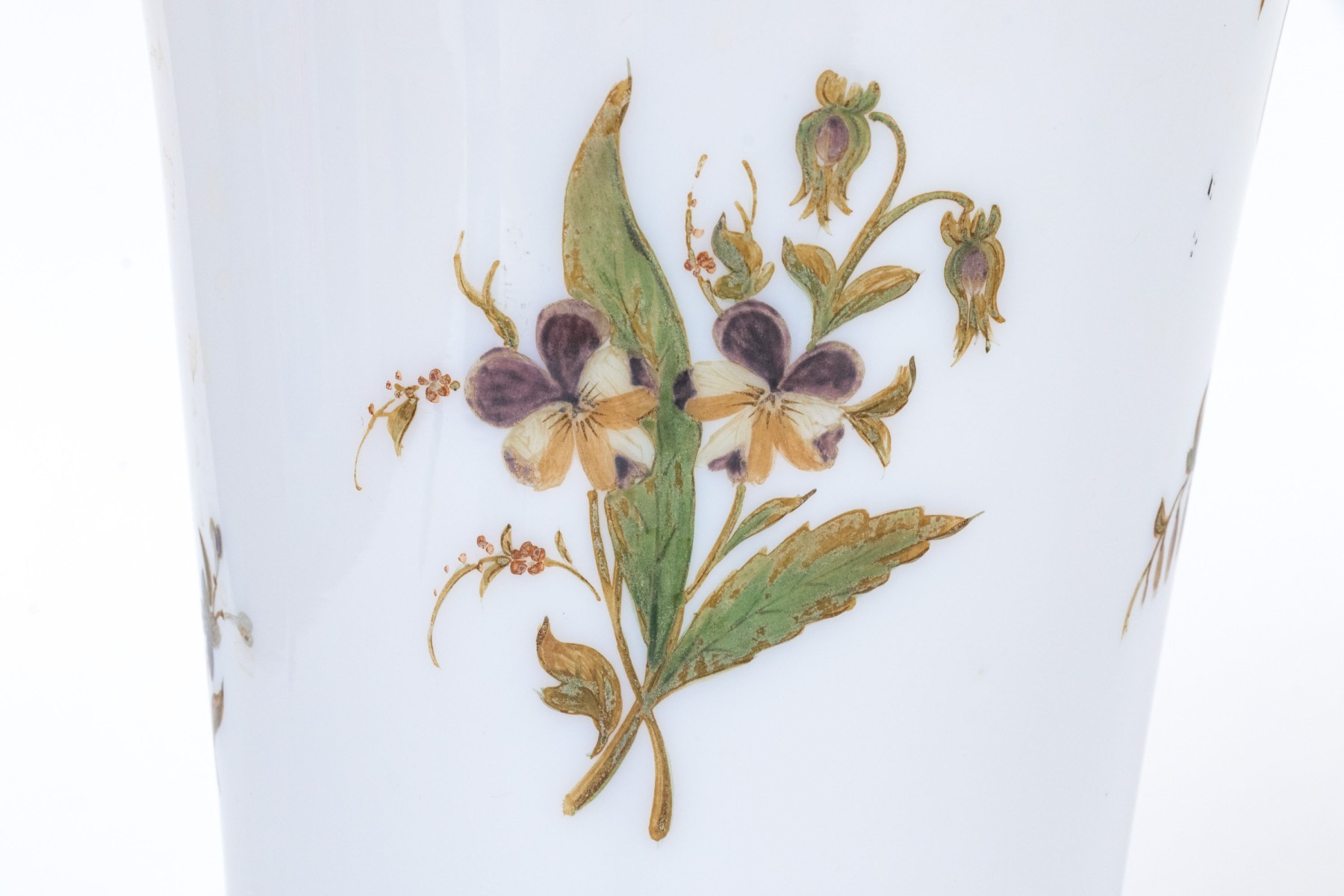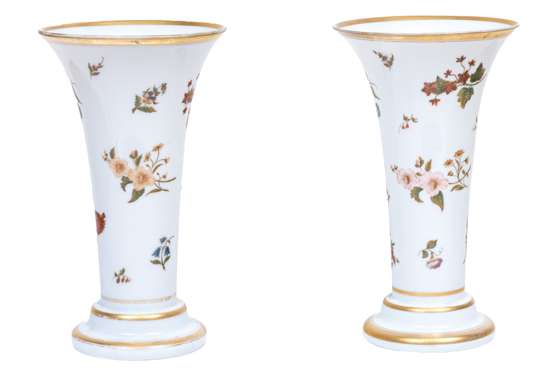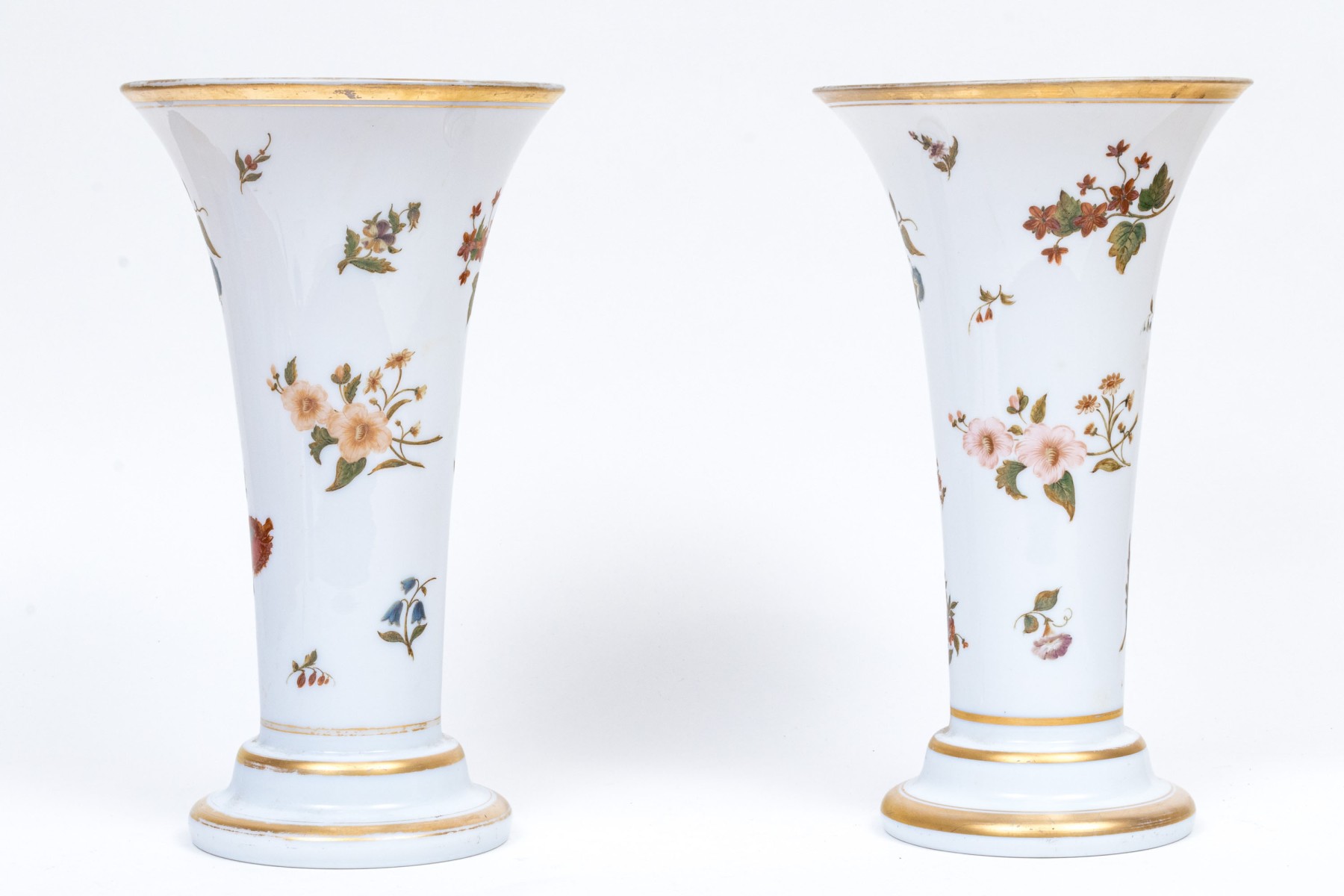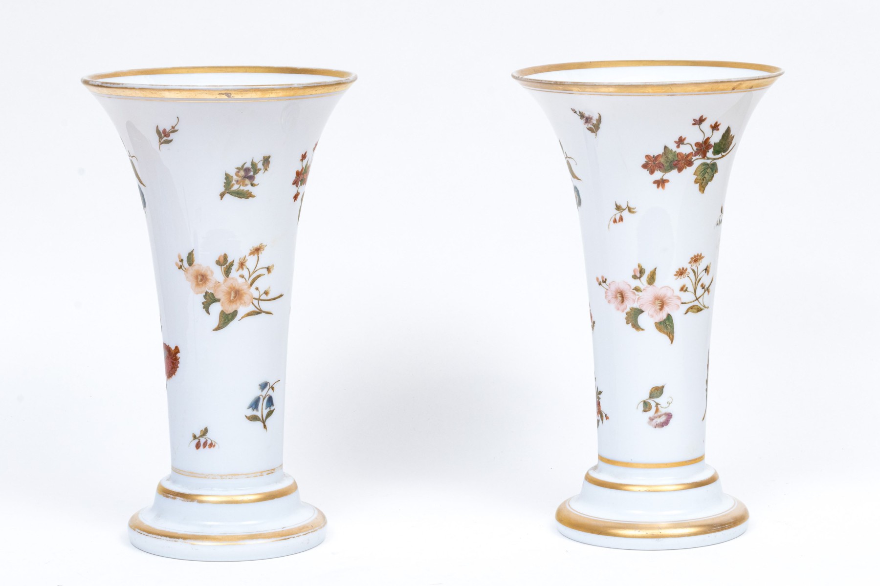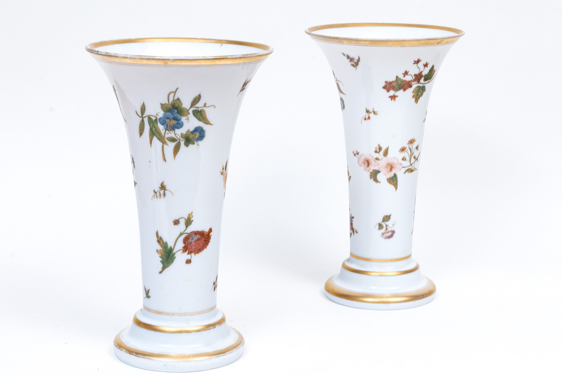 Tall trumpet vases decorated with colored flowering branches and with gilt band details.