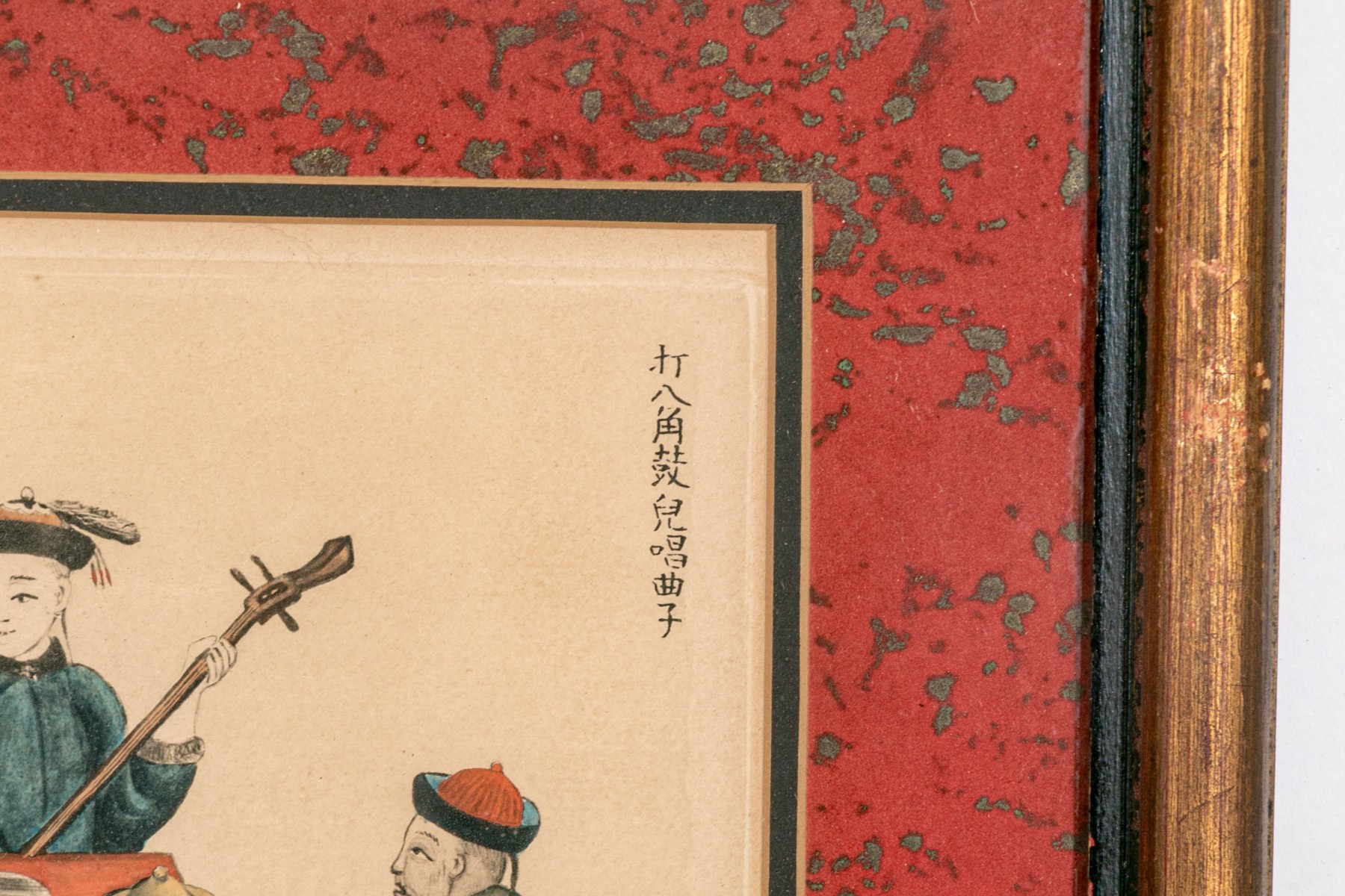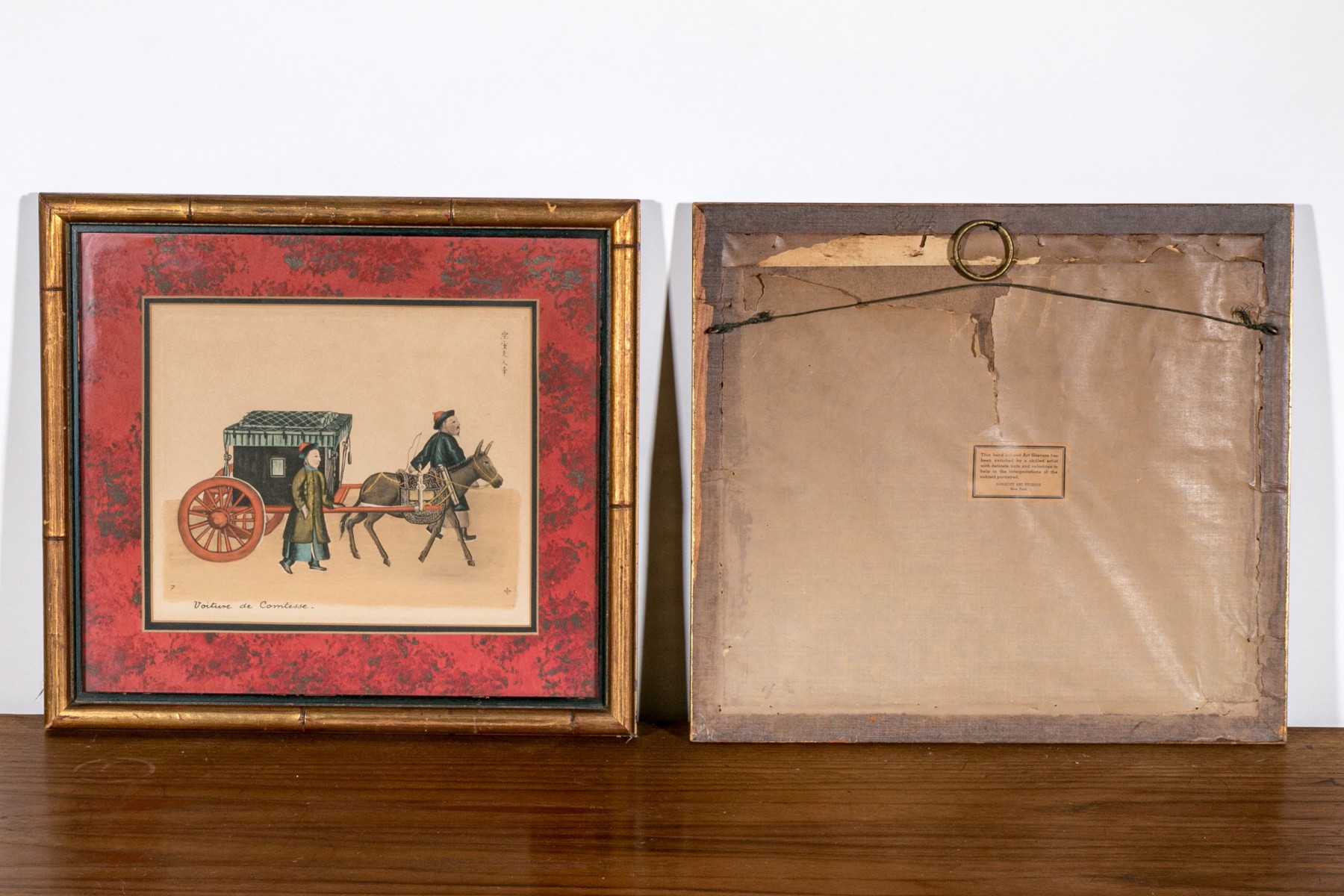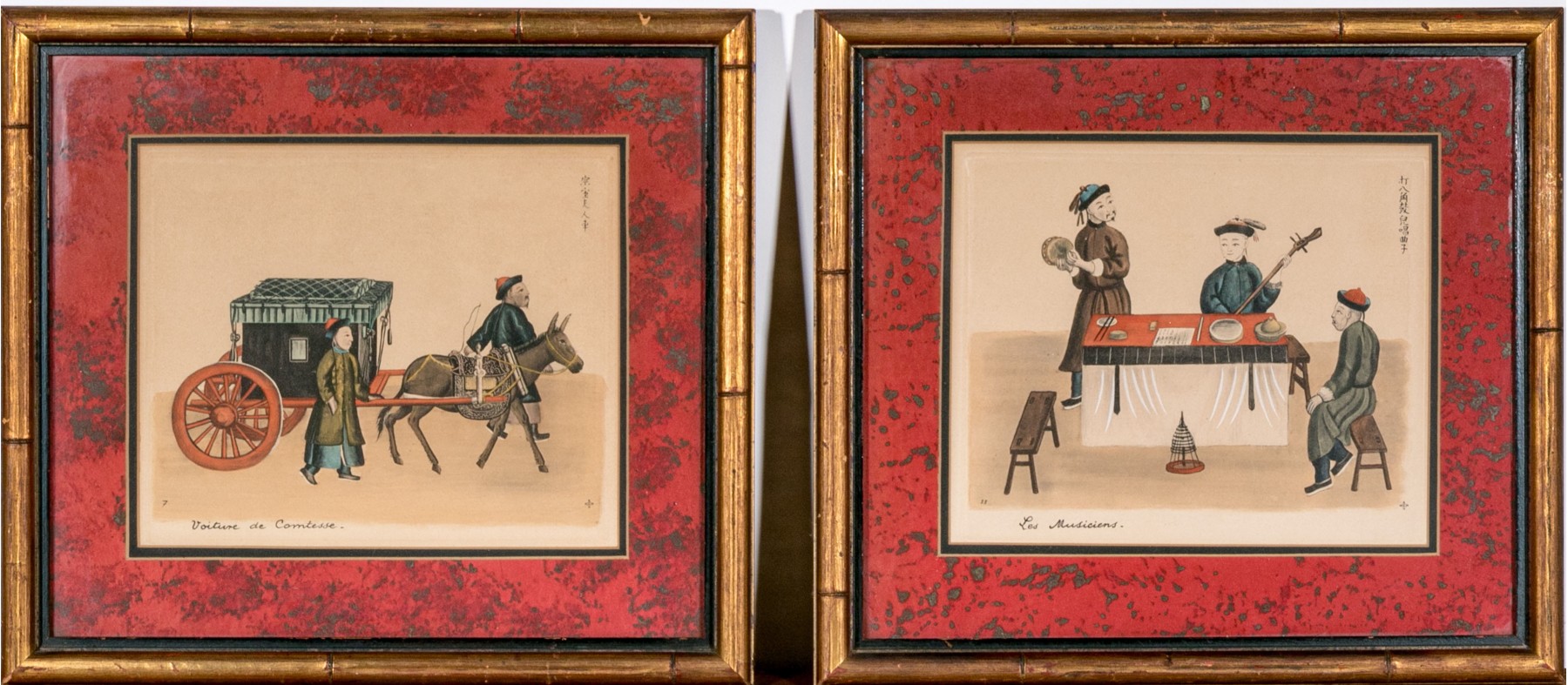 One featuring musicians, the other a carriage for a countess. Presented in fine custom mats in faux bamboo gilt frames with glass.