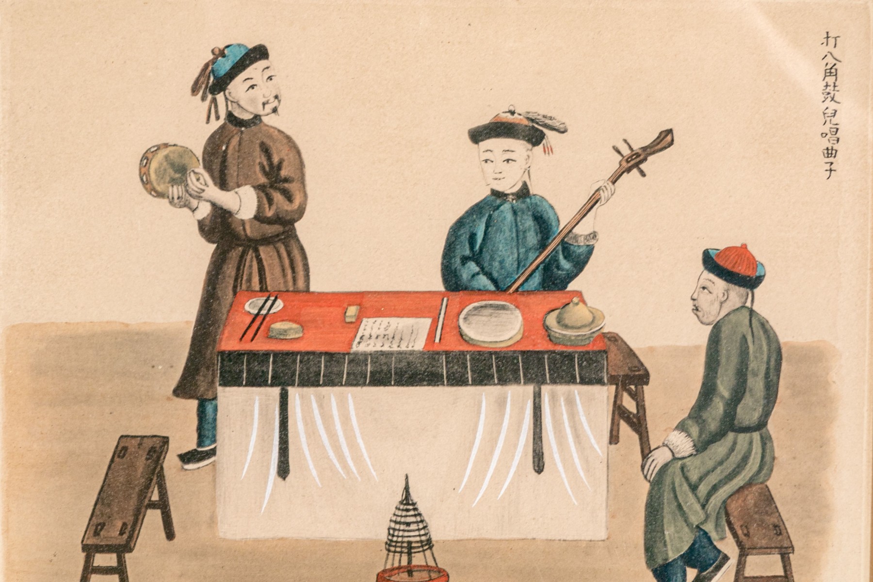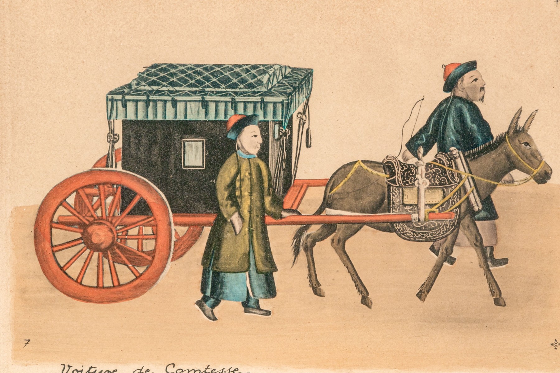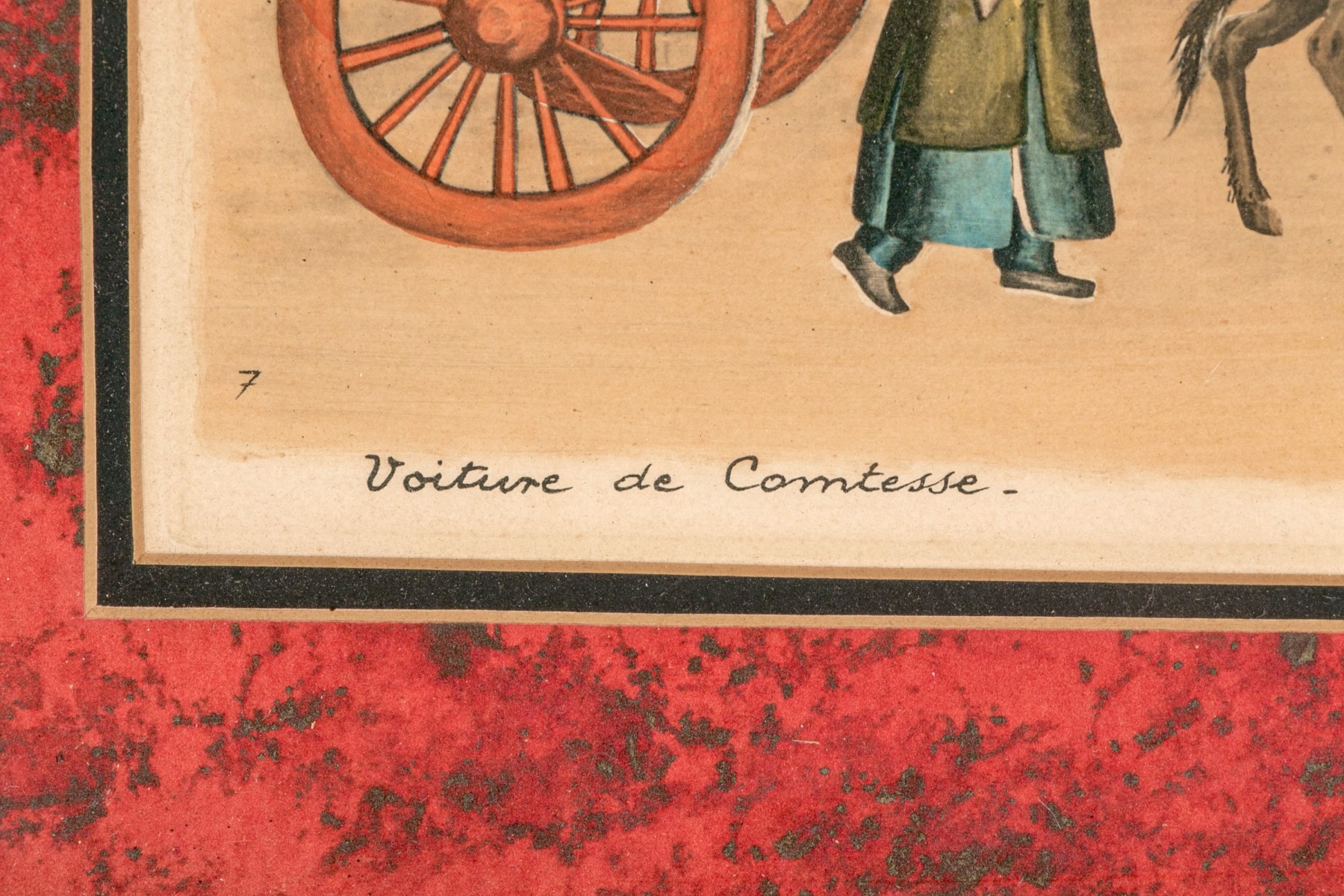One featuring musicians, the other a carriage for a countess. Presented in fine custom mats in faux bamboo gilt frames with glass.