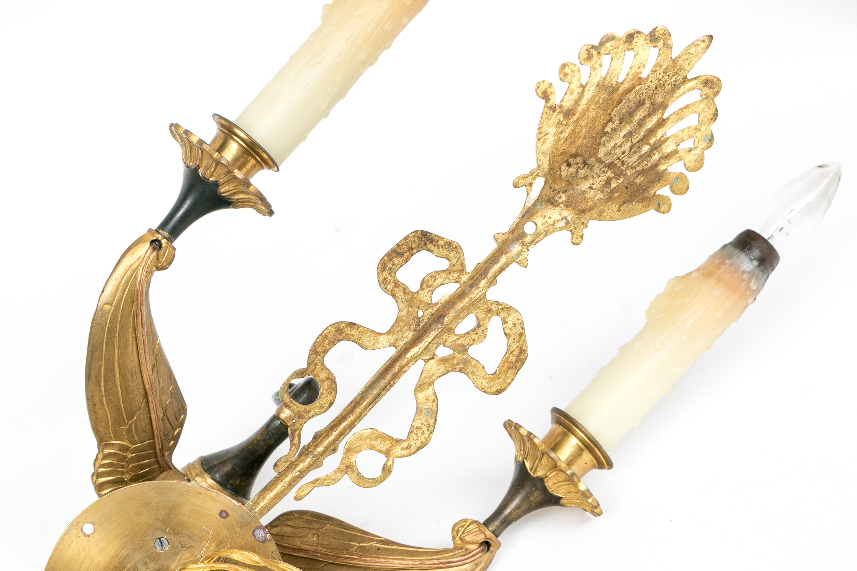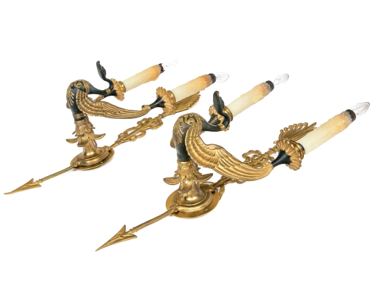 Pair Of Antique Gilt Bronze Empire Style Twin Arm Wall Sconces With Swan Supports #312415. Black Rock Galleries provides high end estate liquidation services through online estate auctions and a 50,000 sq ft designer showroom. estate liquidator, estate sale, online auction, antiques, fine art, liquidation, clean outs, auction, consignment, interior design, fine jewelry, collectibles, appraisals, estate appraisals, estate services, decor, furniture, furniture consignment, antique center, consignment shop. We offer appraisal services and specialize in fine art, jewelry, antiques and decorative arts. Sell with us. Black Rock Galleries is the tri-state's largest estate liquidator serving New England and the greater New York City area. We are the trusted source for expert appraisals, auction services, estate sales, and consignments. Black Rock Galleries is the east coast's largest and most trusted estate liquidator, with locations in Connecticut, greater Boston, MA and Raleigh, NC, Fairfield, Southport, Apex, TX. We are the best source for expert appraisals, auction services, estate sales and consignments. We have served thousands of families and estates with compassion, professionalism and expertise. BRG works with attorneys, executors, realtors and families to bring the greatest return on personal and estate property in the current market. Our unique combination of services make us the easy choice to get the job done in a timely and stress-free manner. We are with you from the initial consultation to the final clean out. Our house-built online auction software platform offers clients a dynamic approach to liquidating their personal property. This venue is most successful in bringing the best return with the least amount of disruption for our clients. See our services page for a complete description of this offering. Pair Of Antique Gilt Bronze Empire Style Twin Arm Wall Sconces With Swan Supports #312415