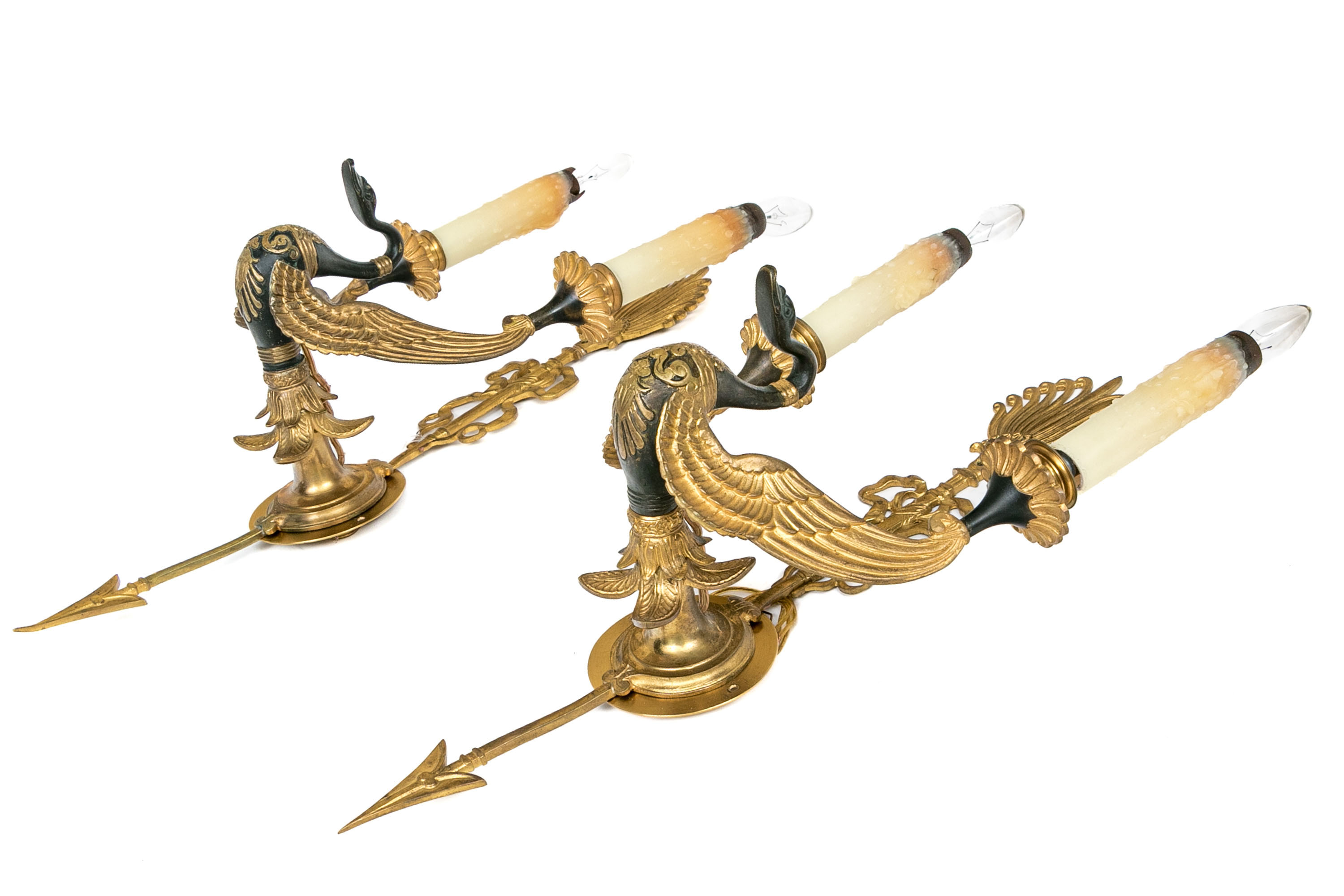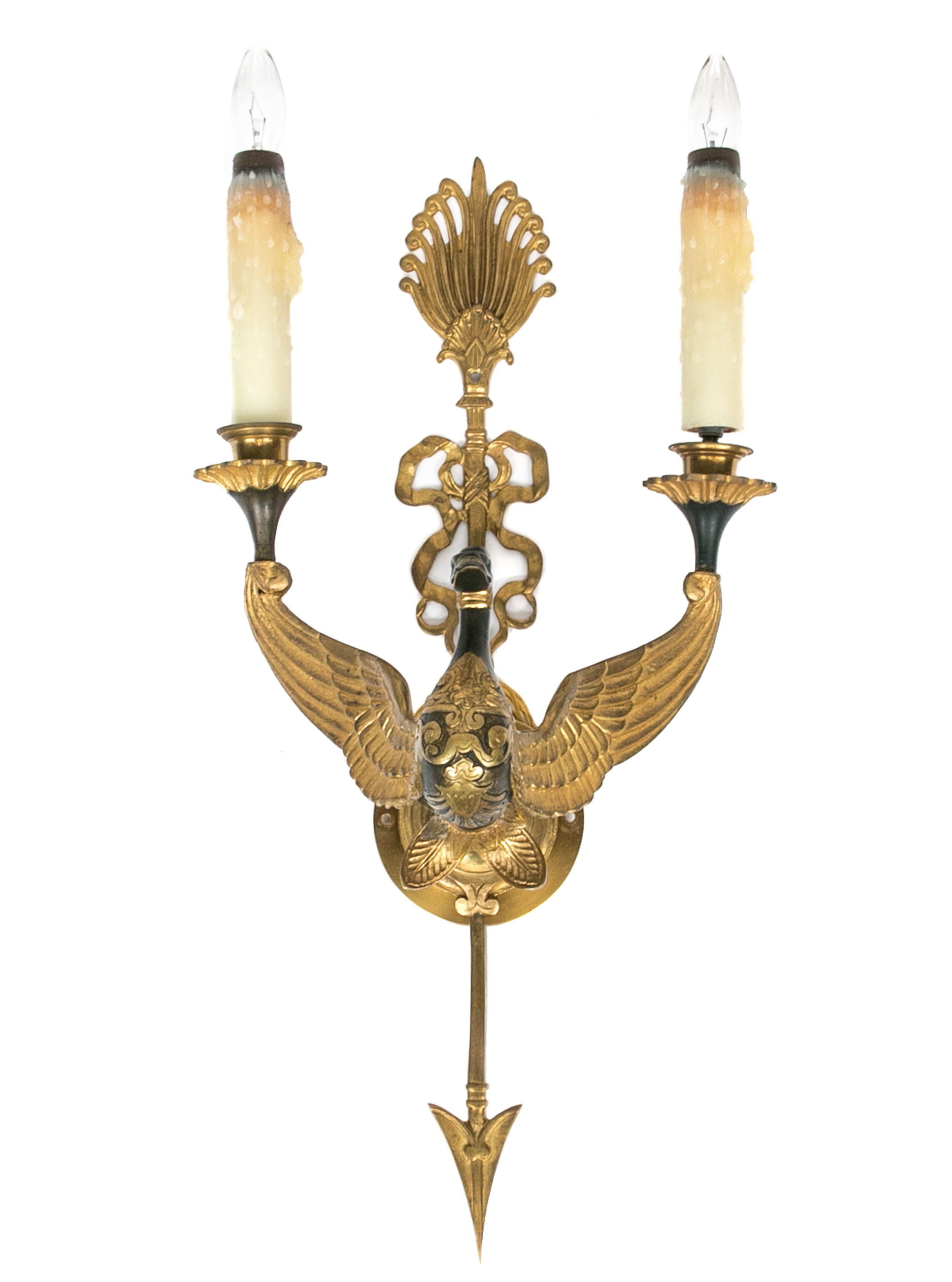 Large tall and heavy bronze sconces. The backs in the form of arrows at the bottom with bow wrapped shafts above and palmette finials. A swan figure with outspread wings in patinated and gilt bronze supports the arms and is decorated with scrolls and palmettes on the breast and is mounted on a leafy base. The arms with flower form bobeches and real wax candle sheaths. Along with smocked pleated ecru silk shades with fine gold braid trim.