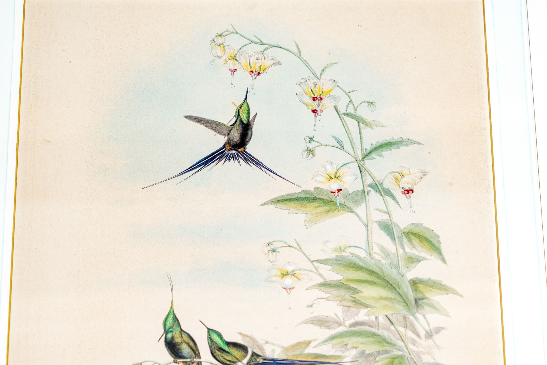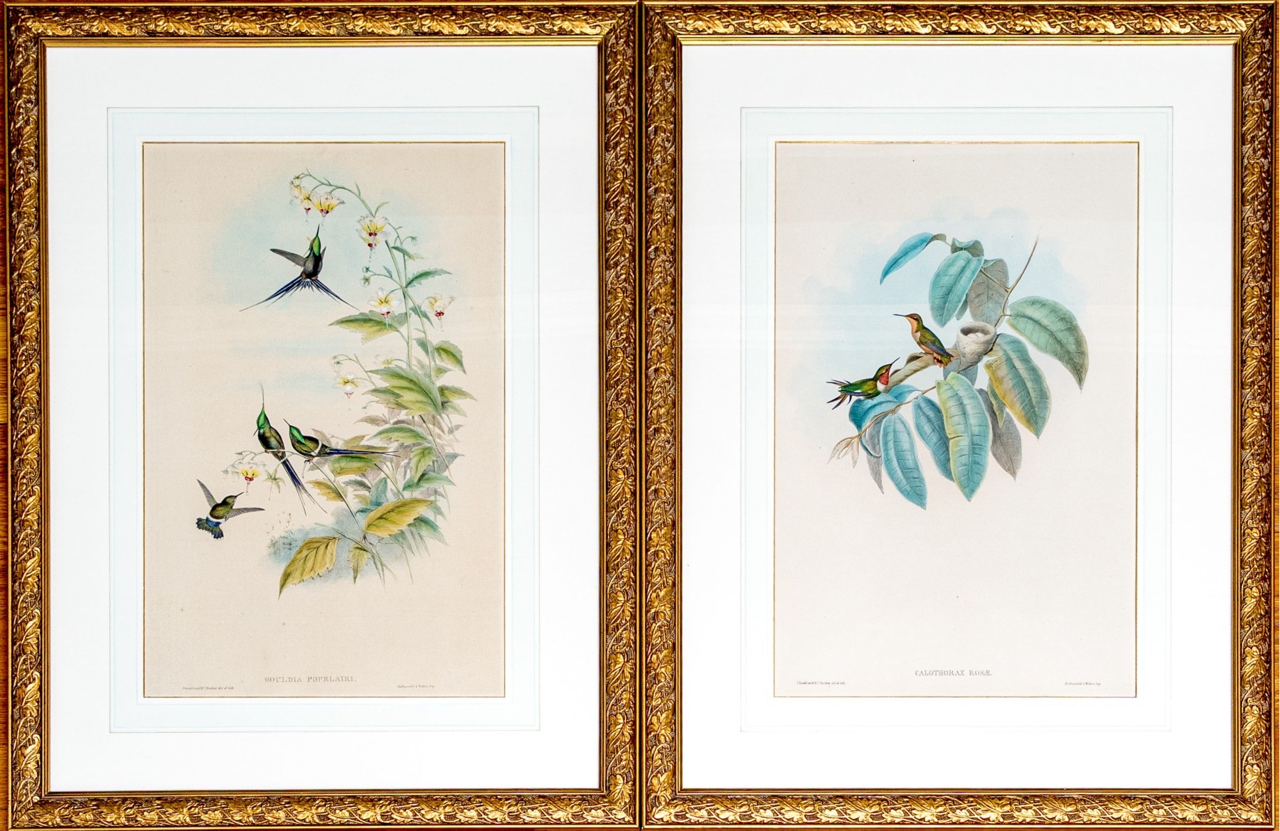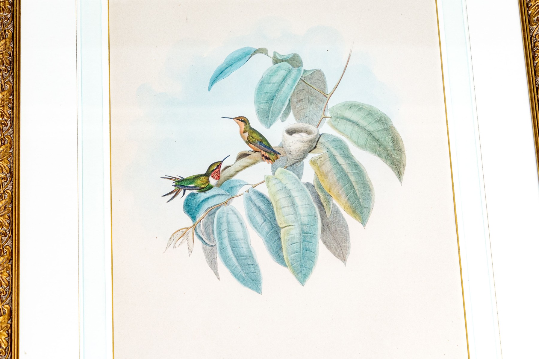 A delightful pair of antique hand-colored prints depicting hummingbirds and foliage. Both presented matted within decorative gilt finished frames with floral motifs.
