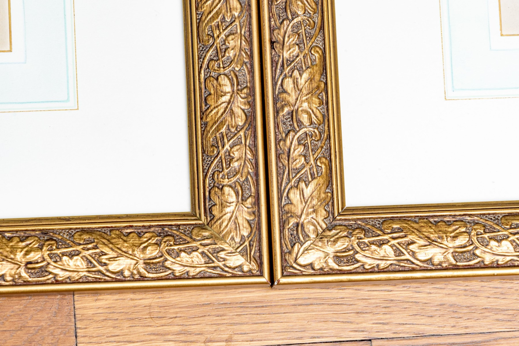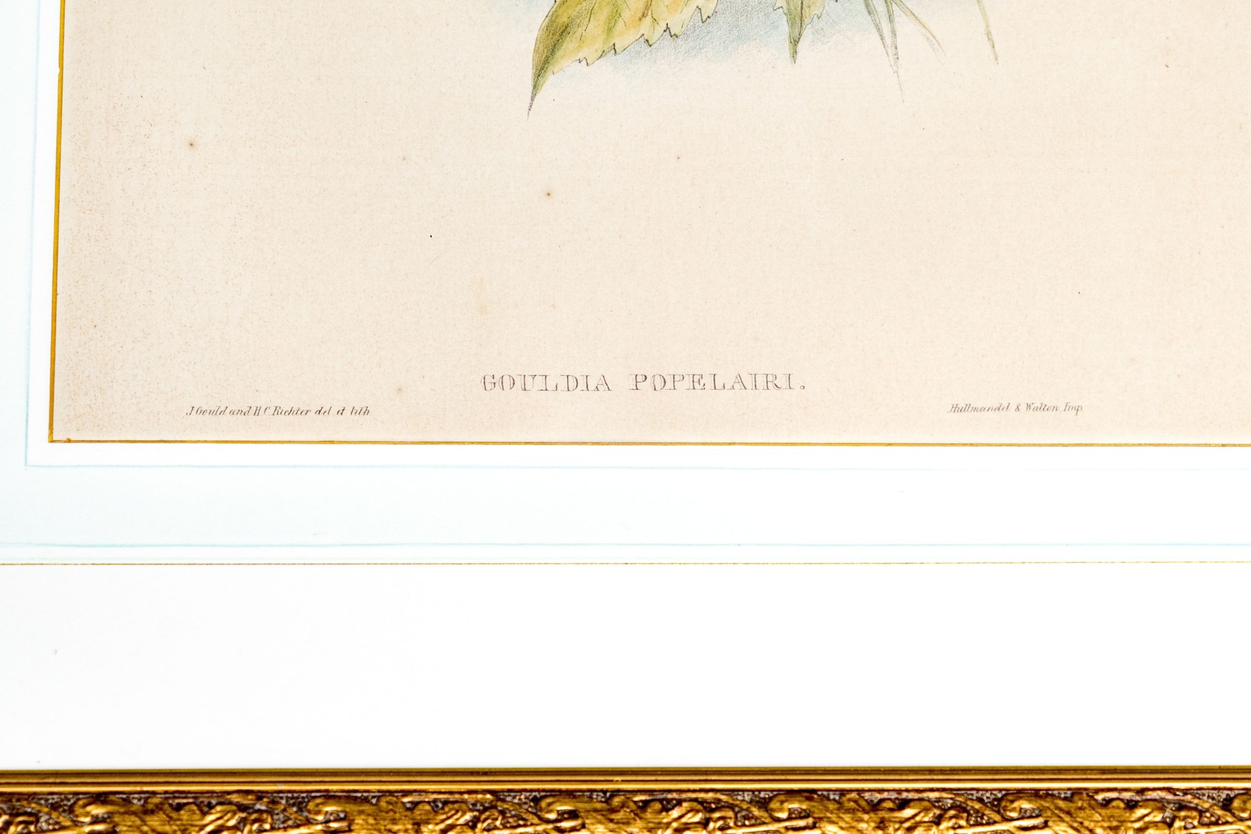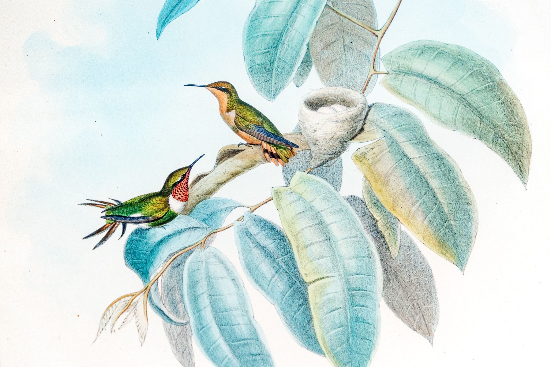 A delightful pair of antique hand-colored prints depicting hummingbirds and foliage. Both presented matted within decorative gilt finished frames with floral motifs.