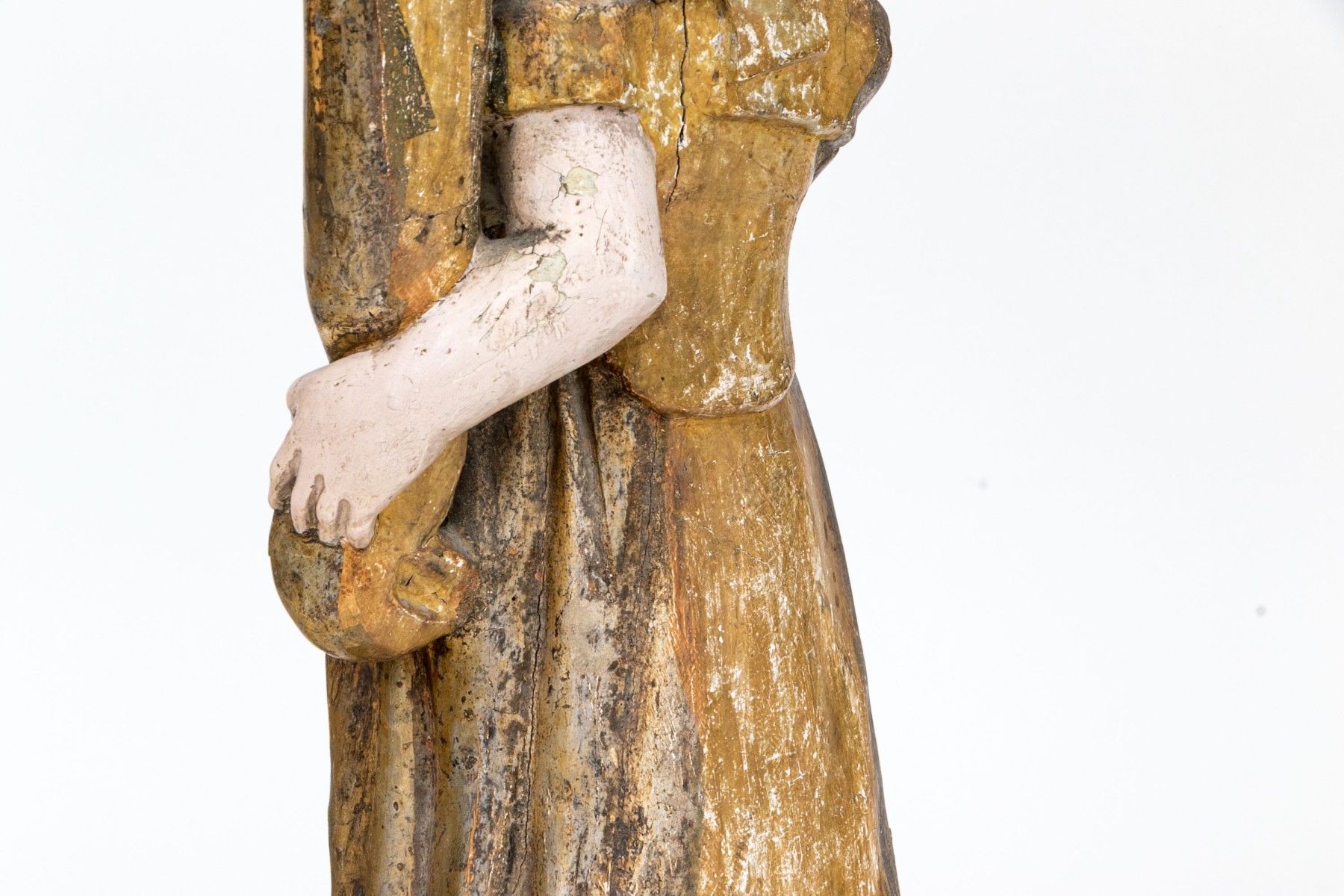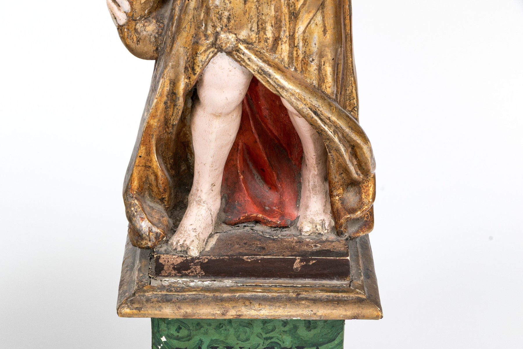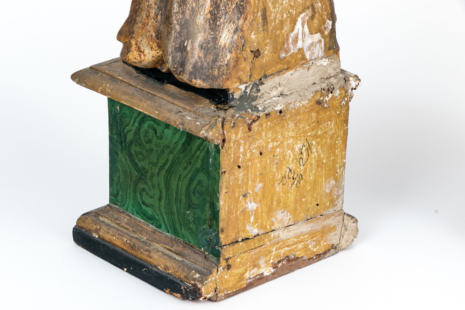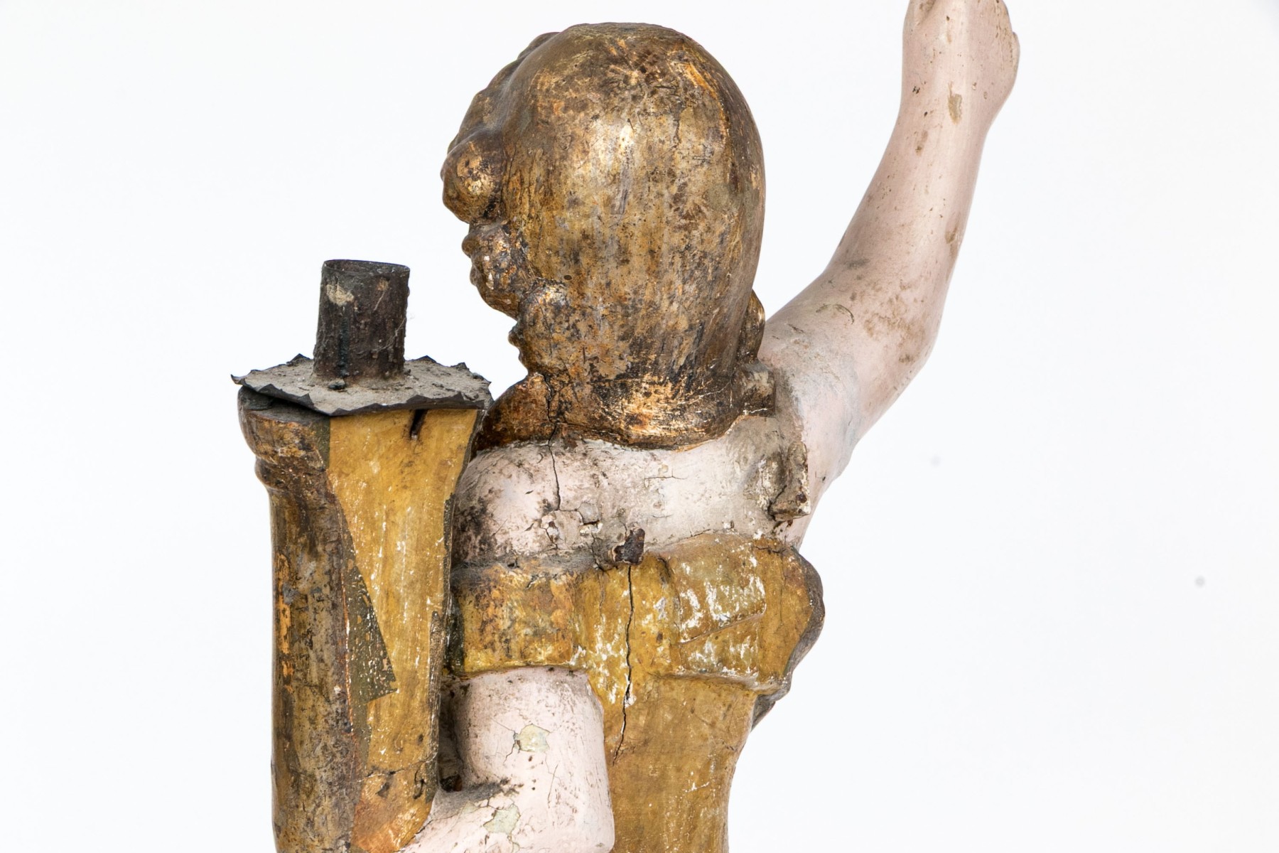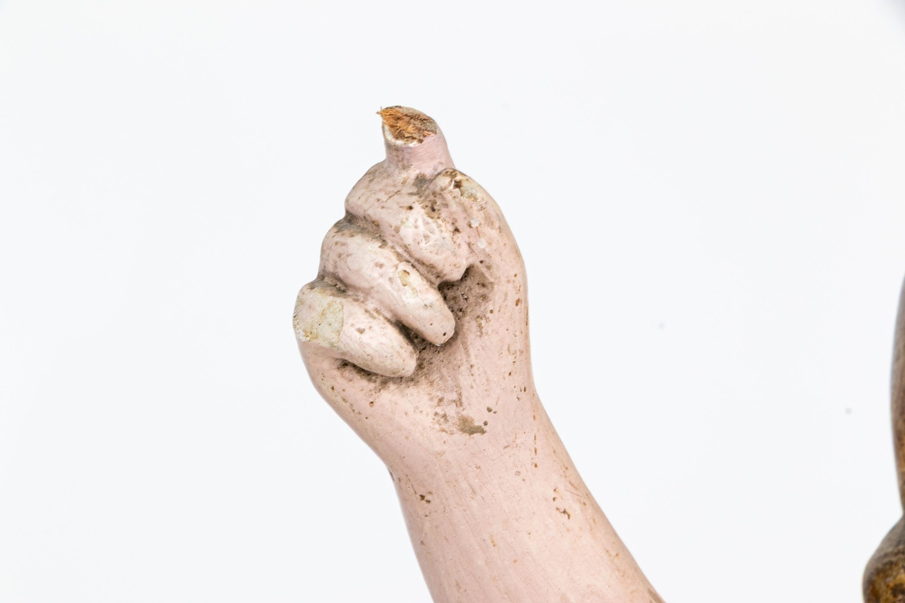 Wear and losses to the painted finish commensurate with age; a broken finger to one figure. Oxidation to metal nozzles.