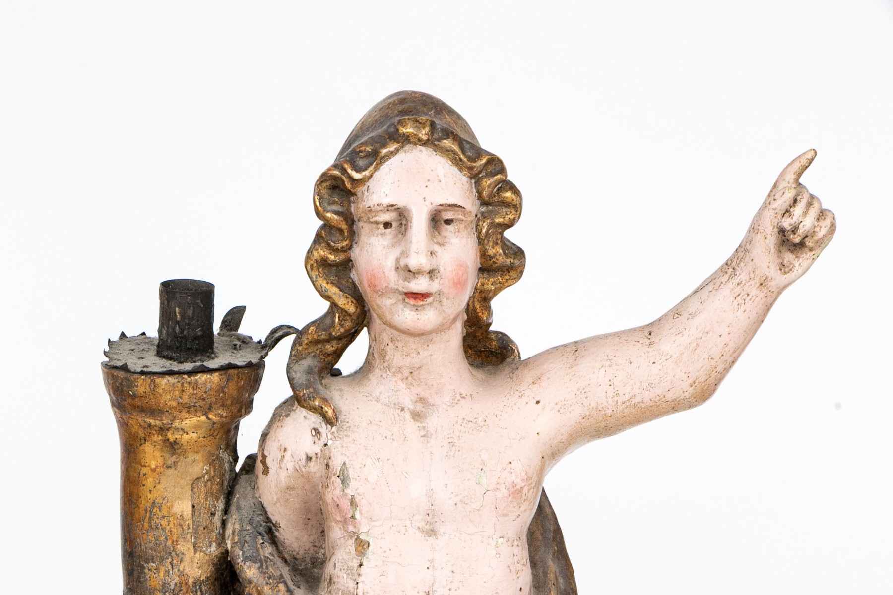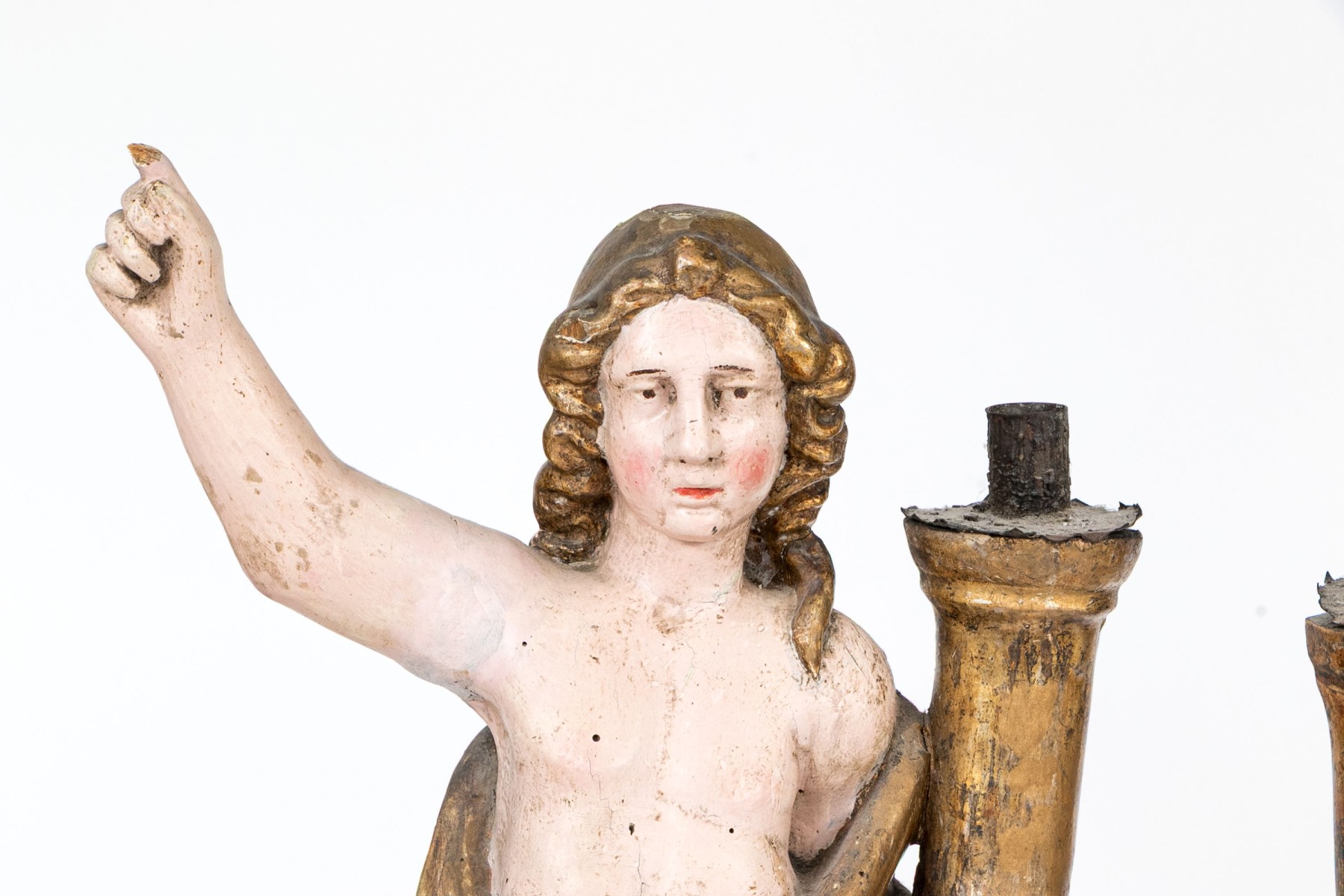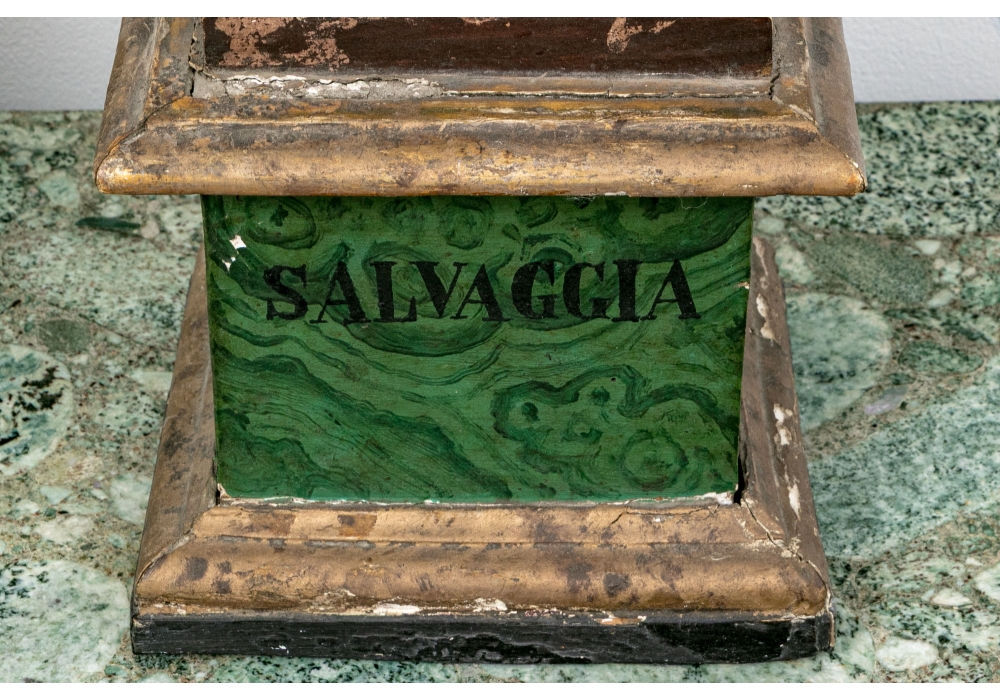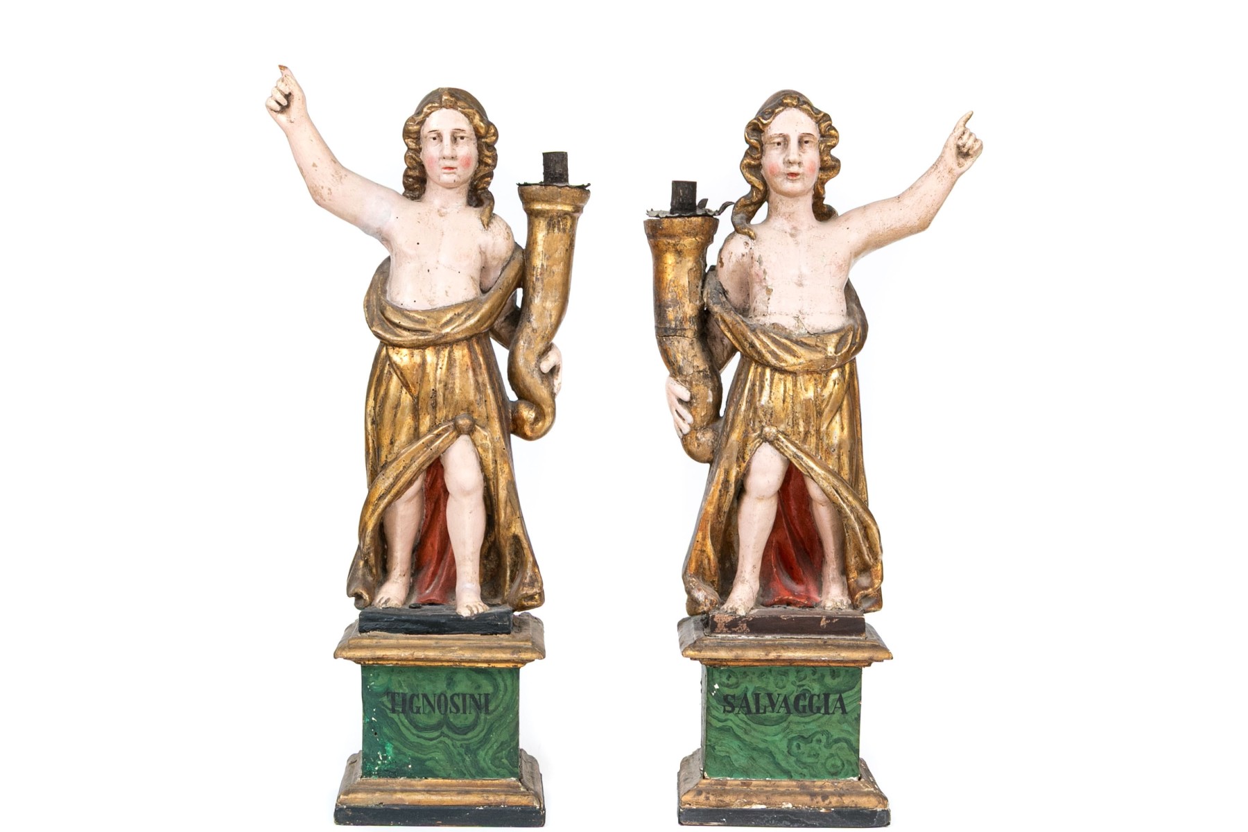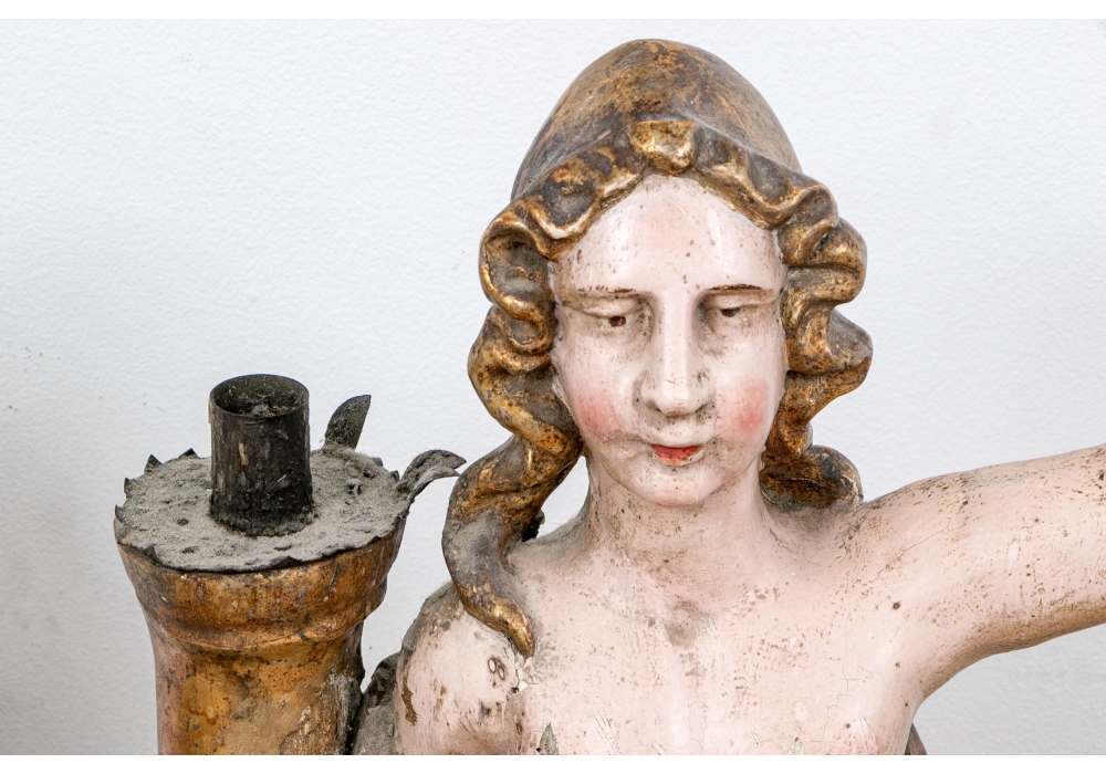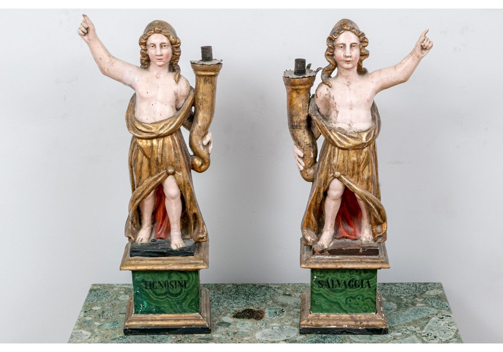 A fabulous pair of antique Italian wood and gesso carved candlesticks in the form of neoclassical angels in opposing form with arms raised to point upwards and other hands holding tail-shaped sconces. The angels are both painted with gilt, wavy hair, draped in gilt robes with red interiors standing atop affixed faux malachite plinths.