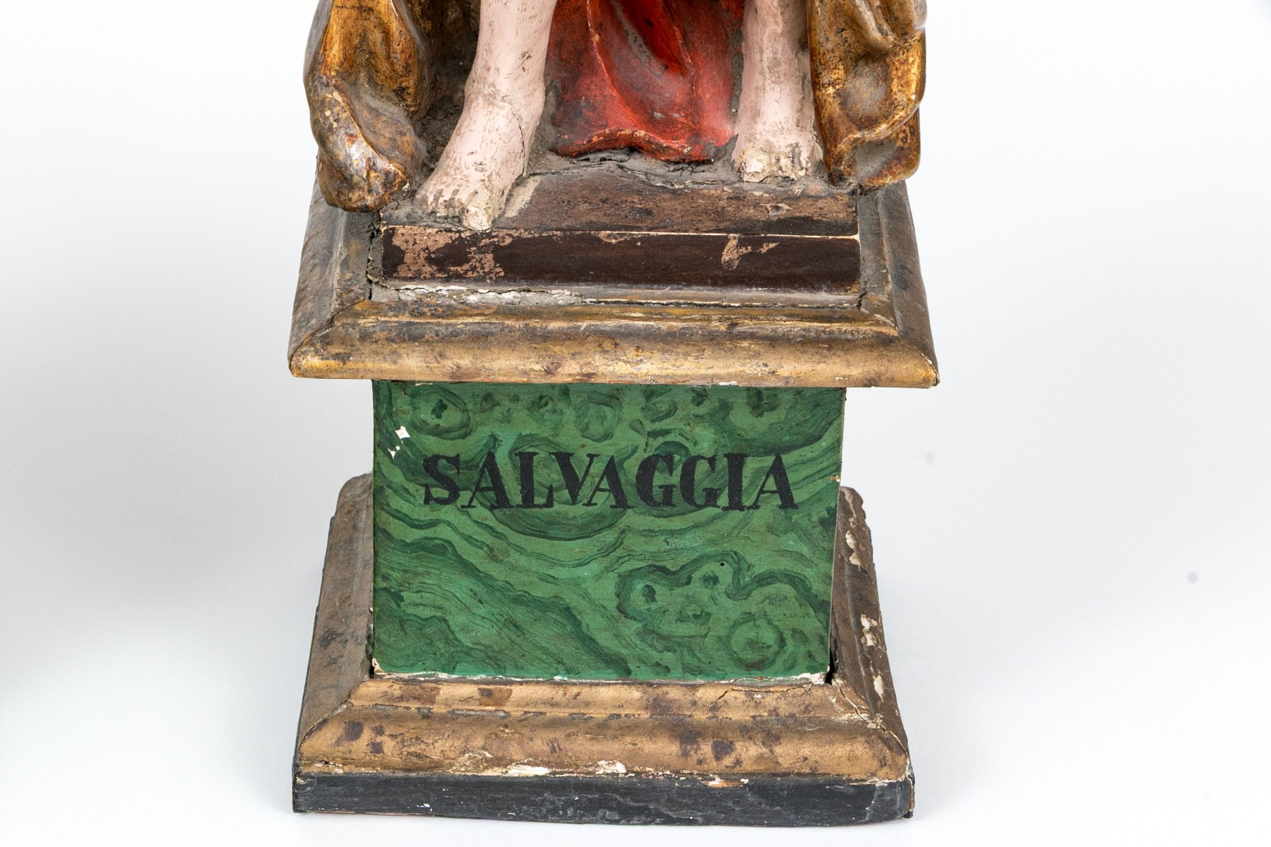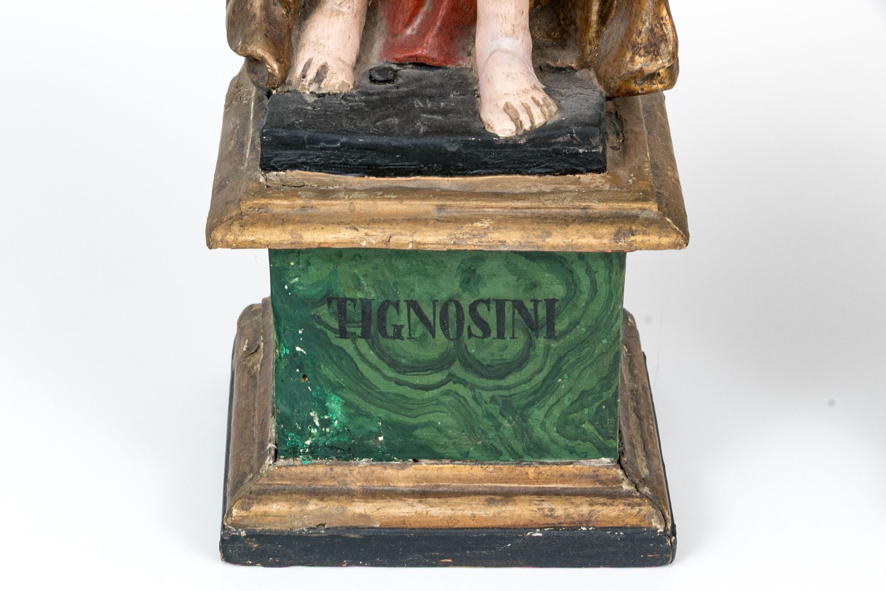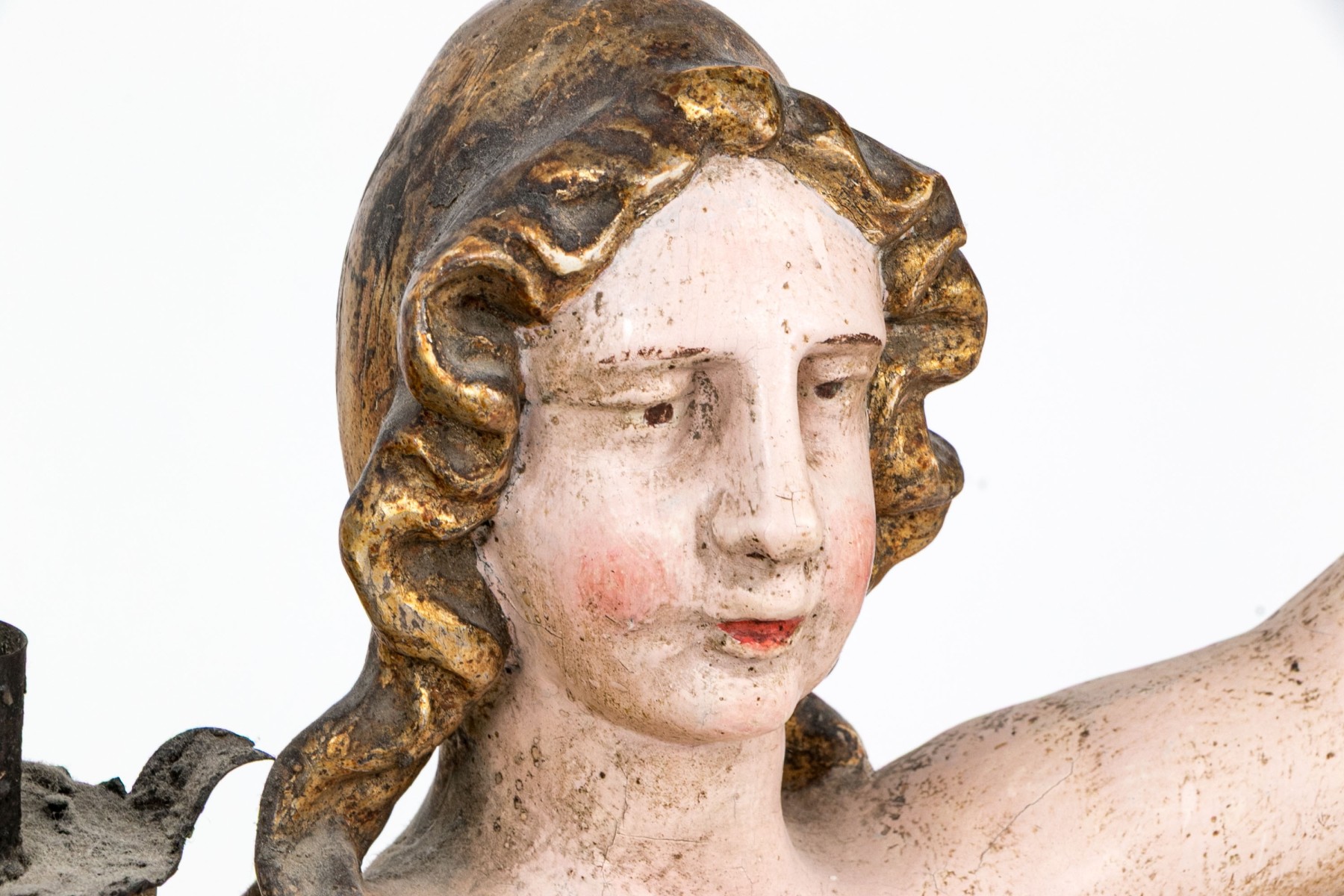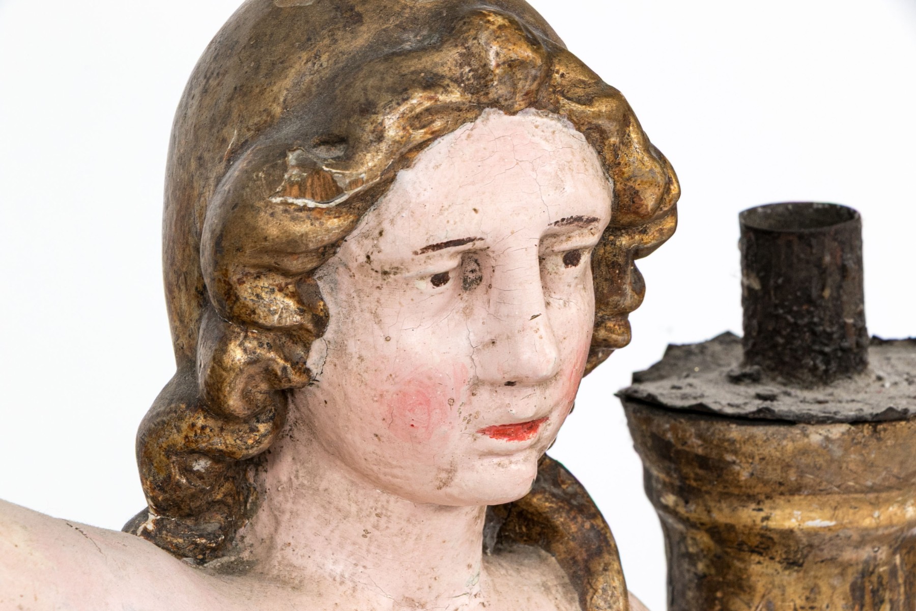 A fabulous pair of antique Italian wood and gesso carved candlesticks in the form of neoclassical angels in opposing form with arms raised to point upwards and other hands holding tail-shaped sconces. The angels are both painted with gilt, wavy hair, draped in gilt robes with red interiors standing atop affixed faux malachite plinths.
