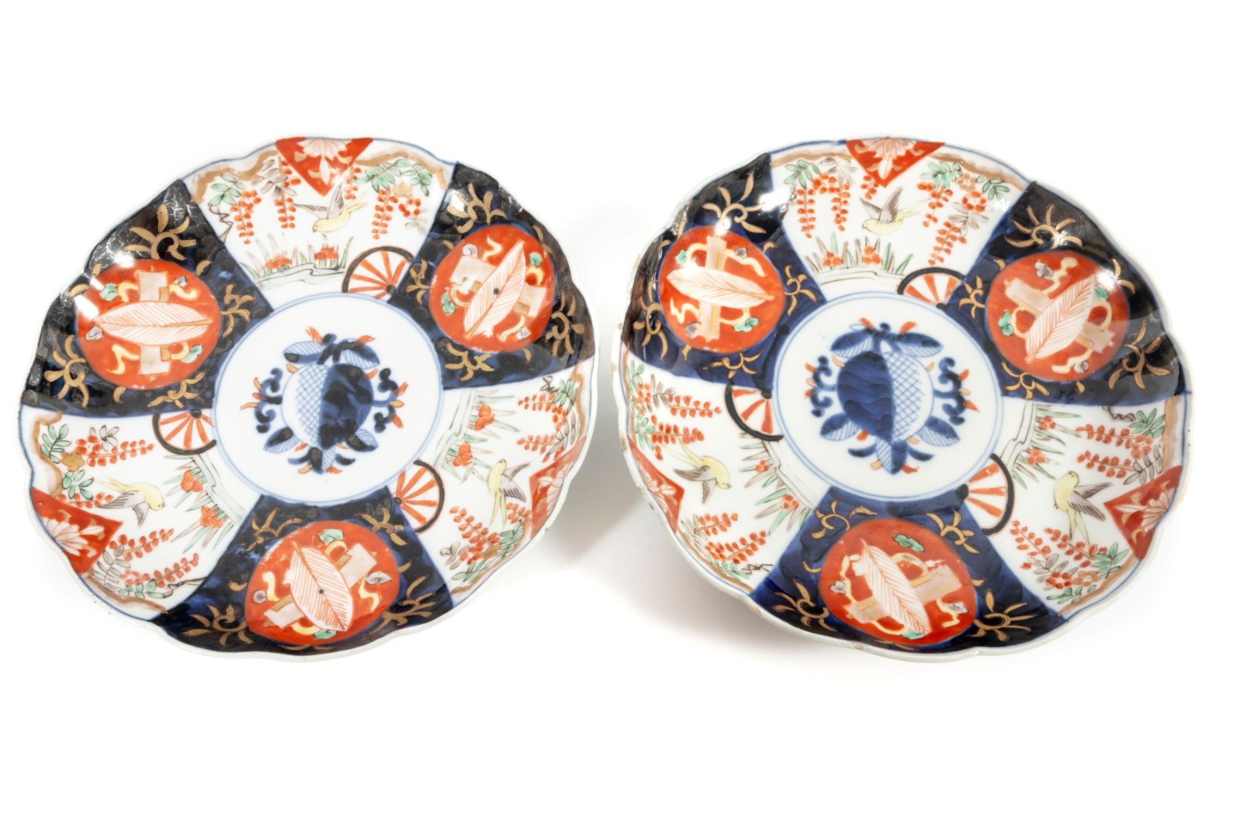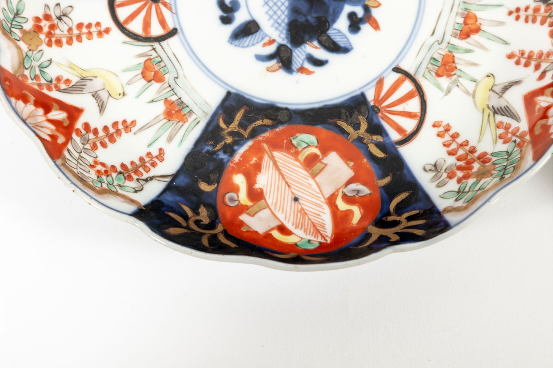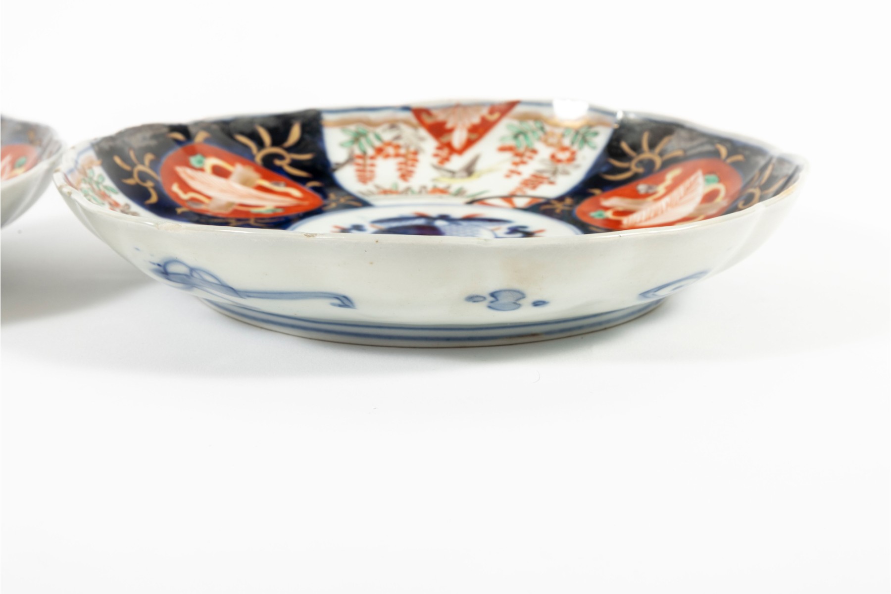 A set of two late 1800 (Meiji Era) Japanese Imari porcelain plates with a central peach motif and bird panels emblazoned with florals. A marking resides at the bottom.