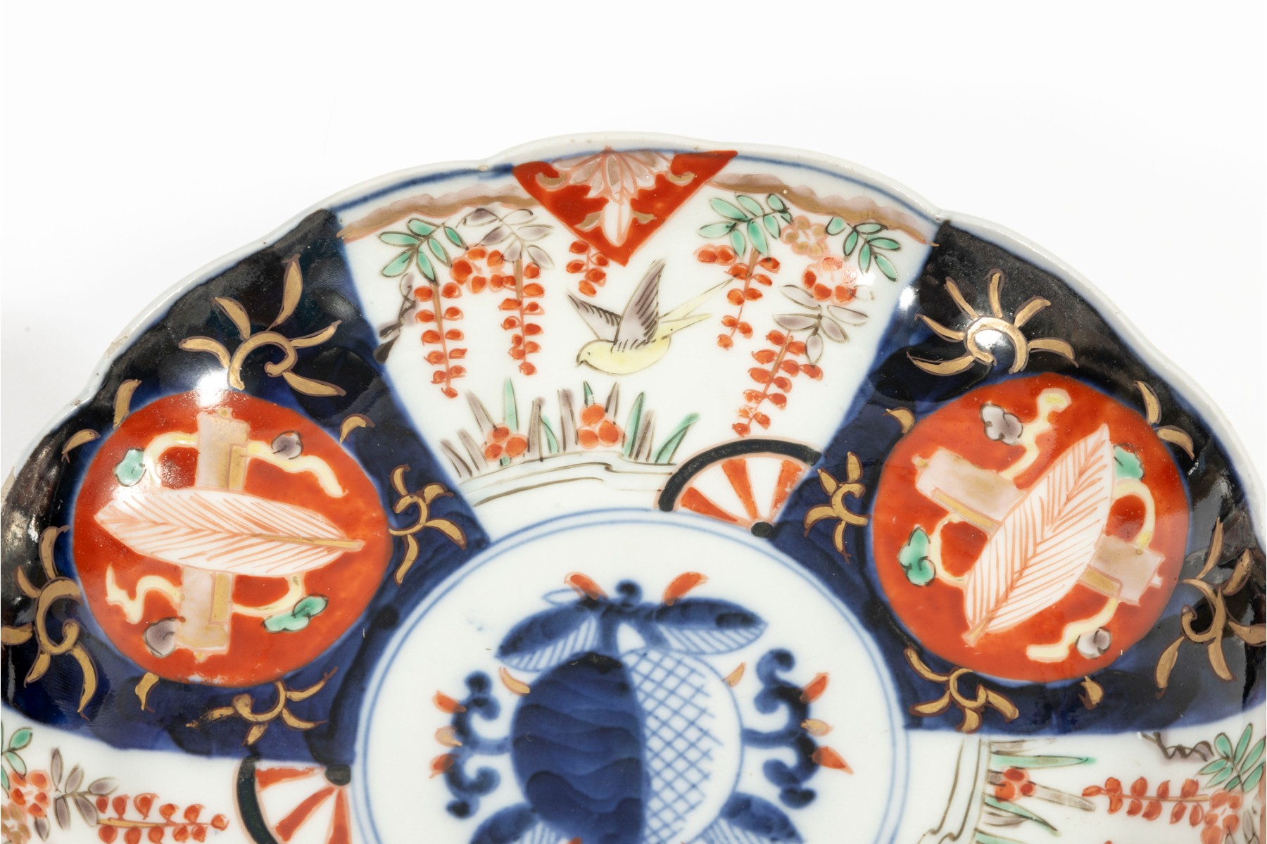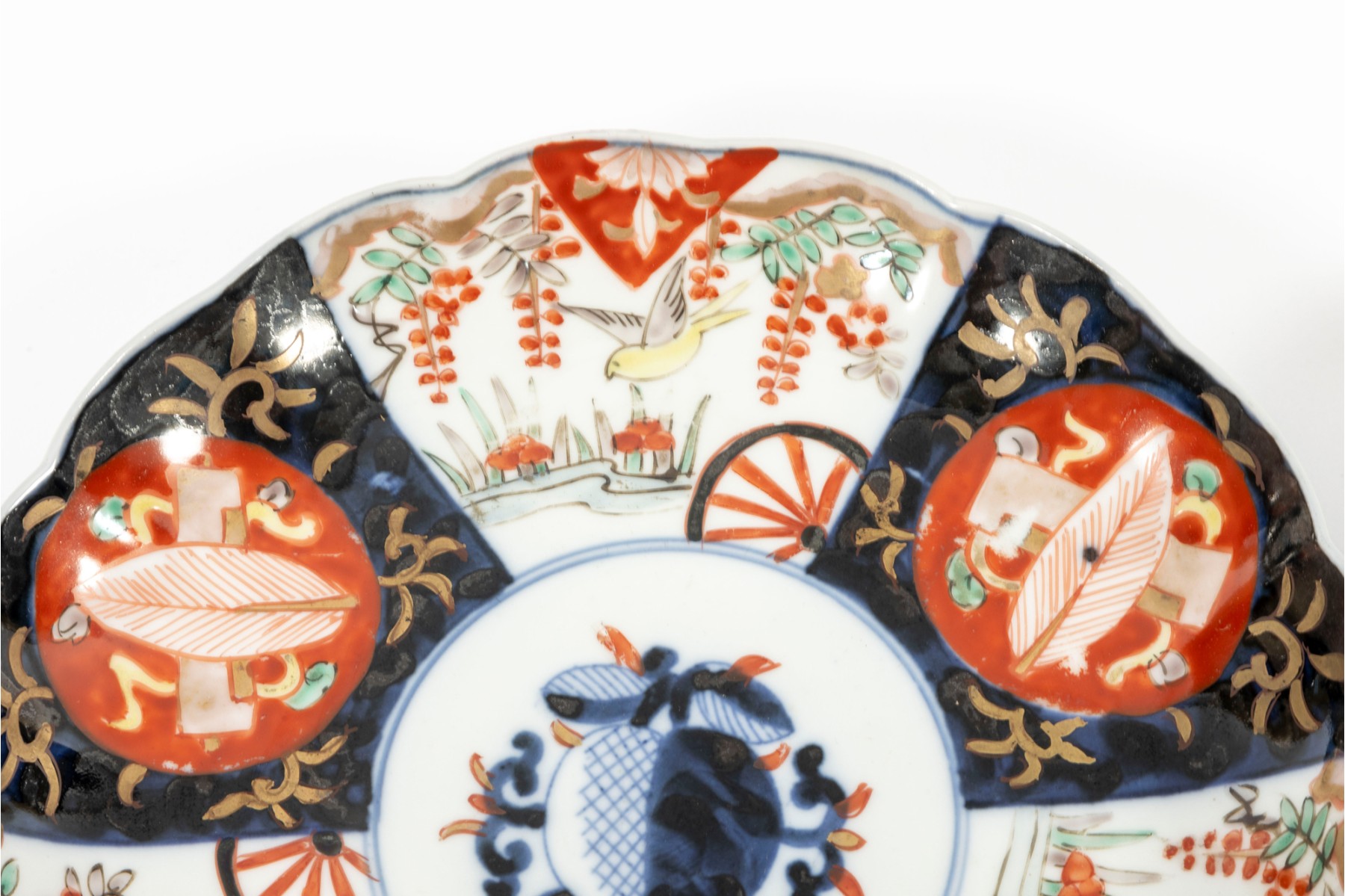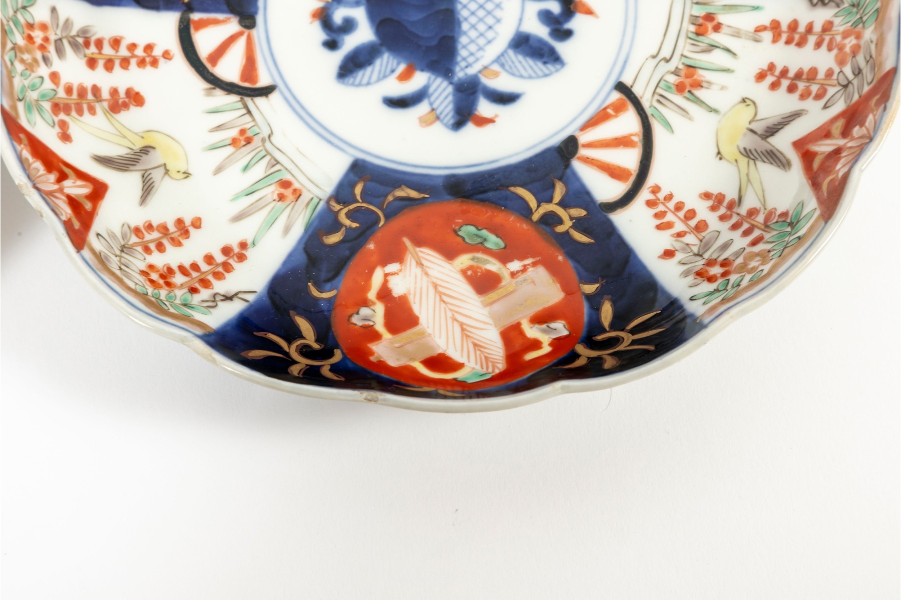 A set of two late 1800 (Meiji Era) Japanese Imari porcelain plates with a central peach motif and bird panels emblazoned with florals. A marking resides at the bottom.