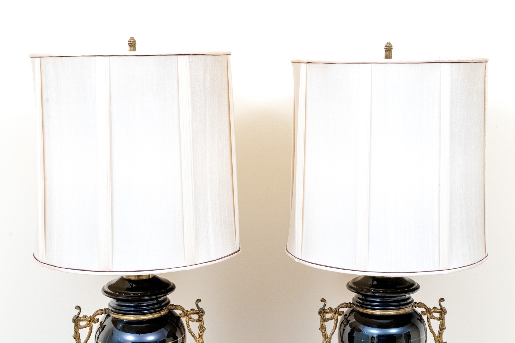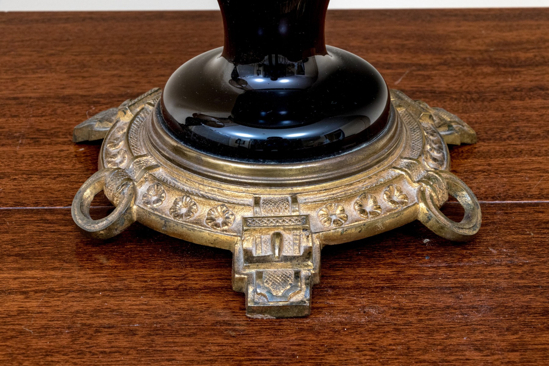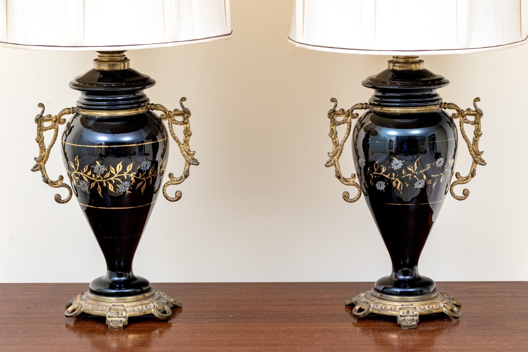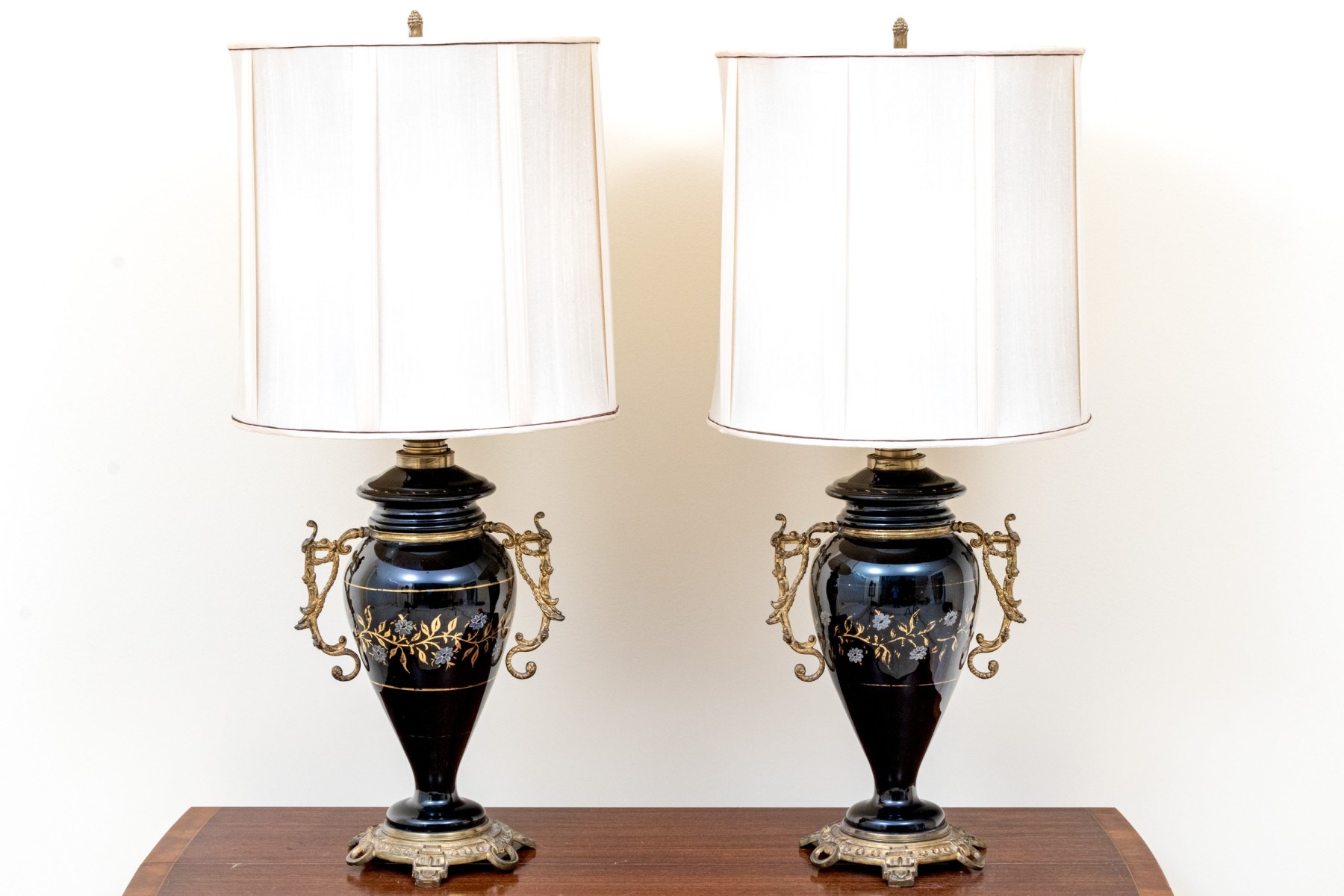 Black glass lidded urns decorated with white painted flowers on gilt vines. With brass mounts, twin scrolled handles and round bases with ring and tab details. The shades are very worn and torn and not to be used.