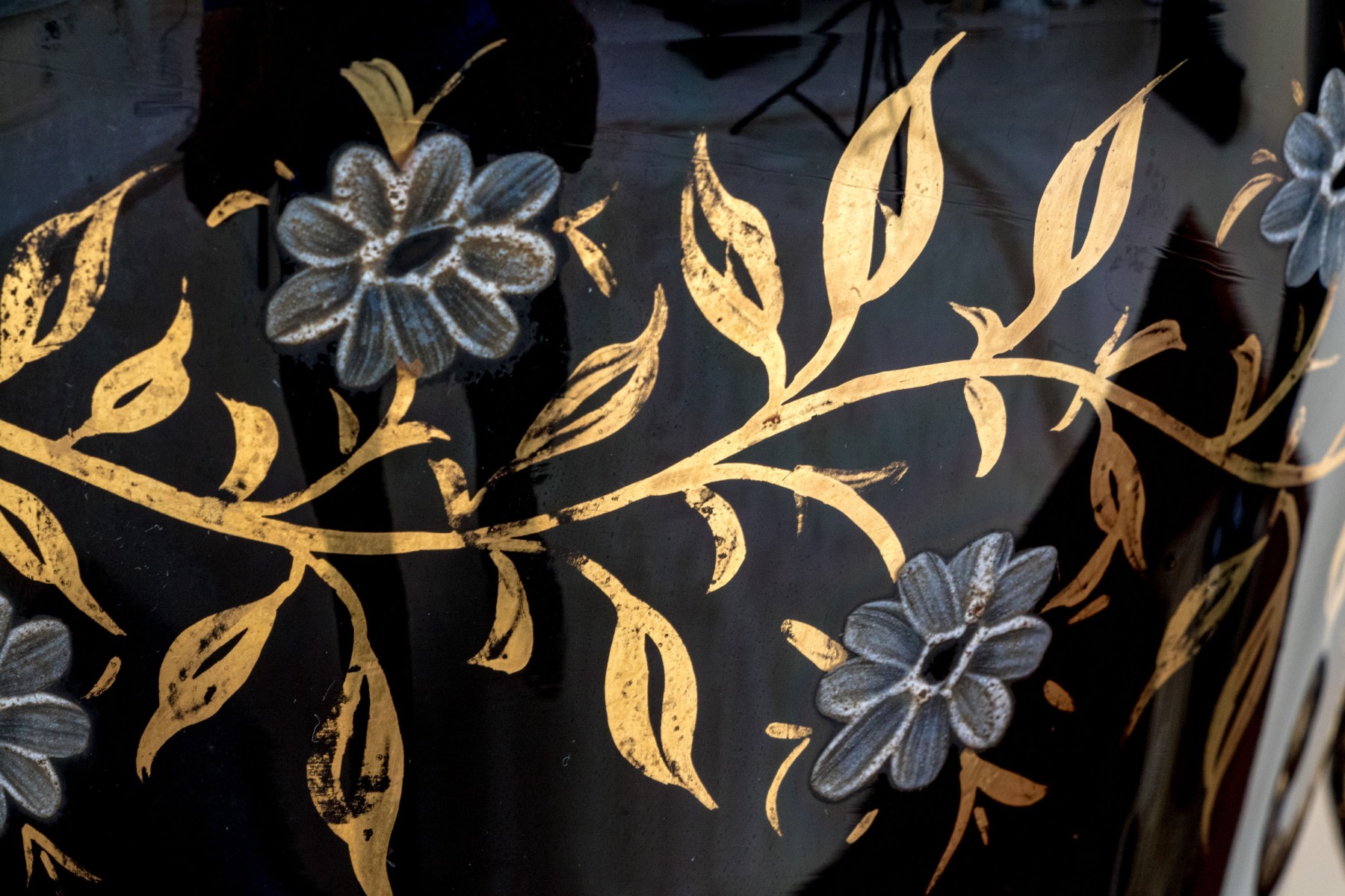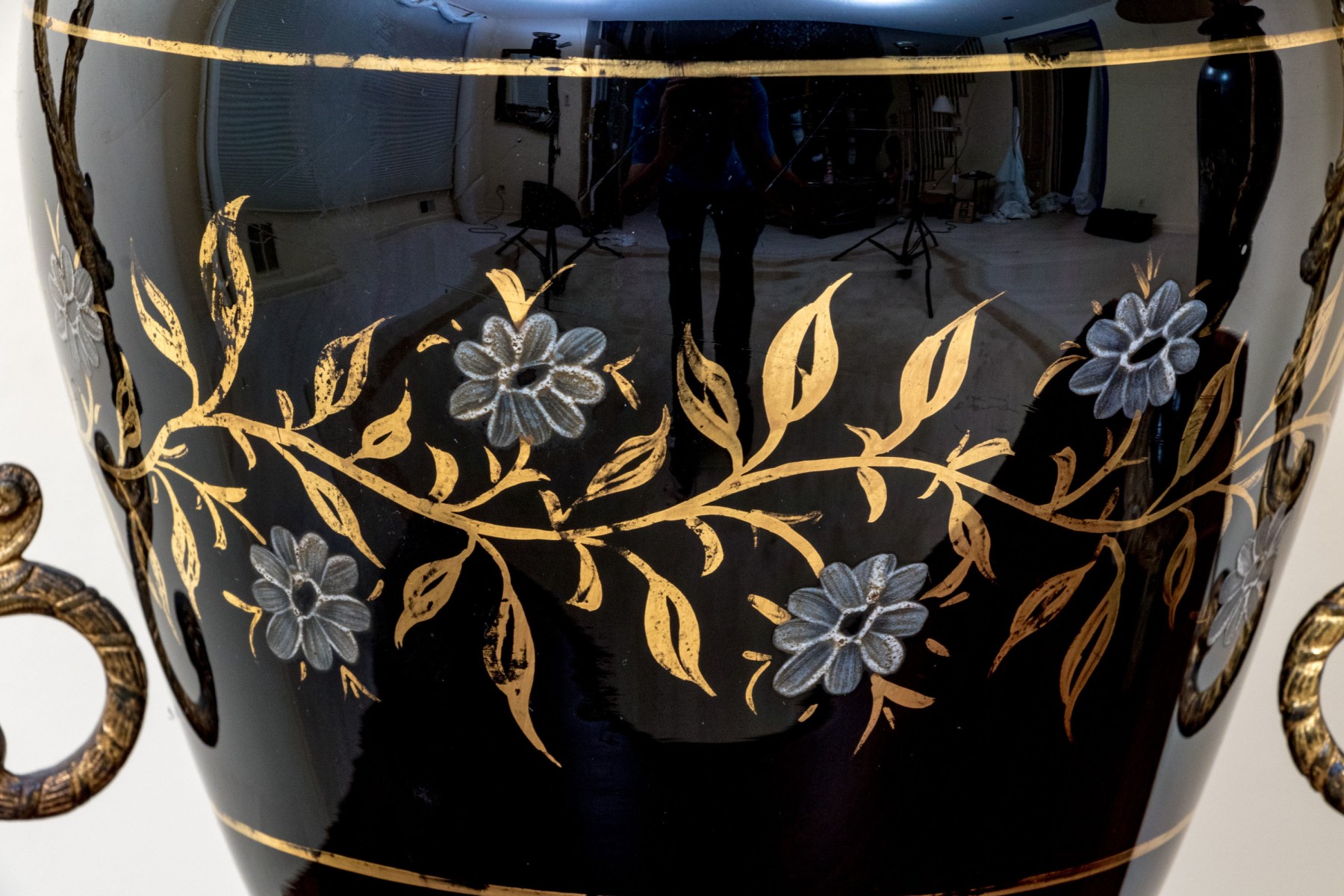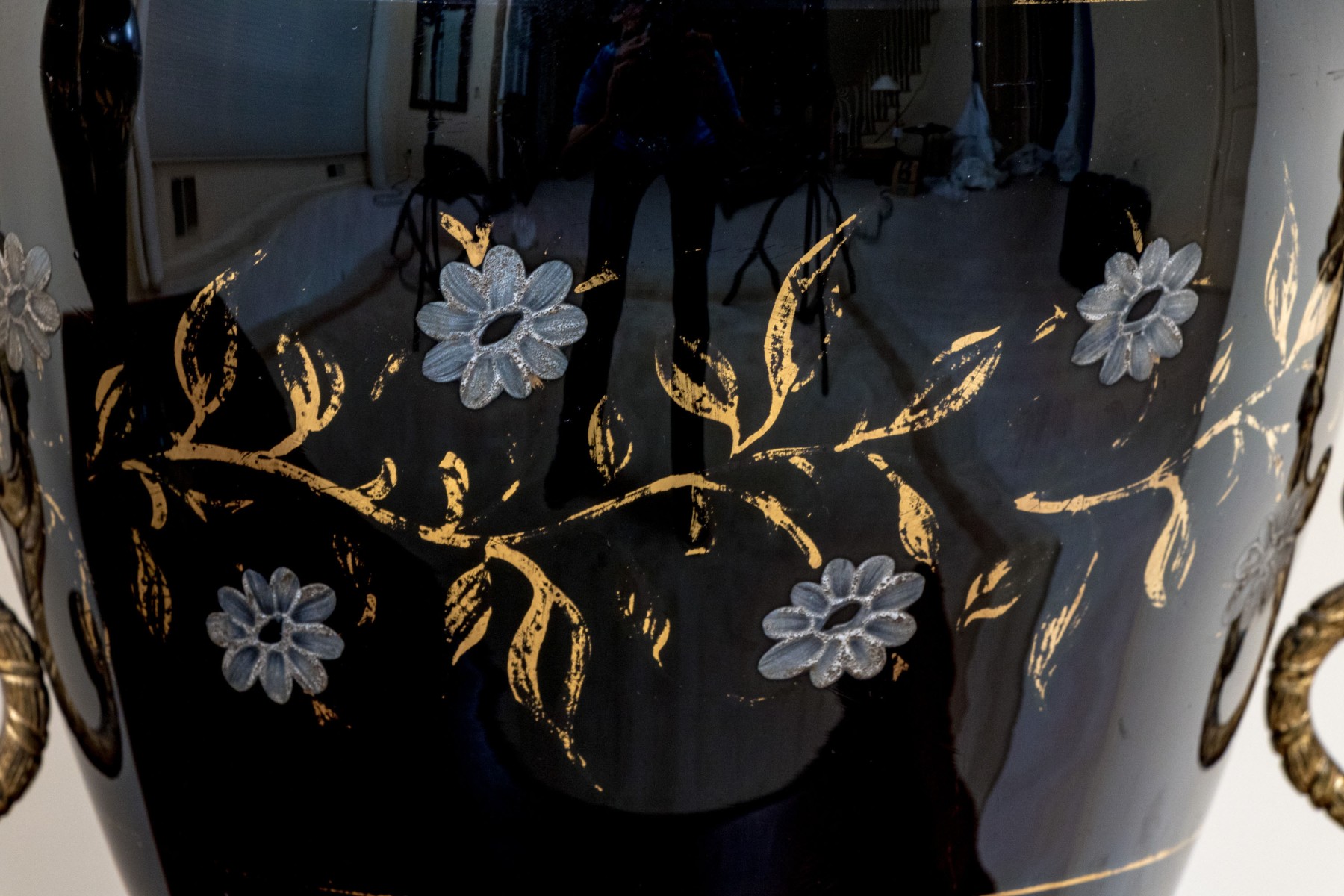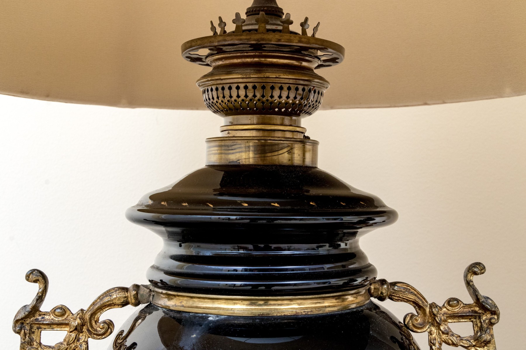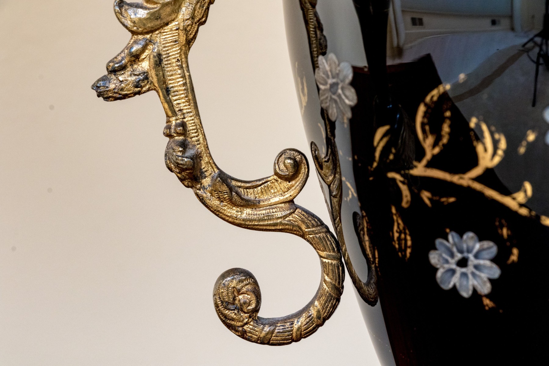 Black glass lidded urns decorated with white painted flowers on gilt vines. With brass mounts, twin scrolled handles and round bases with ring and tab details. The shades are very worn and torn and not to be used.