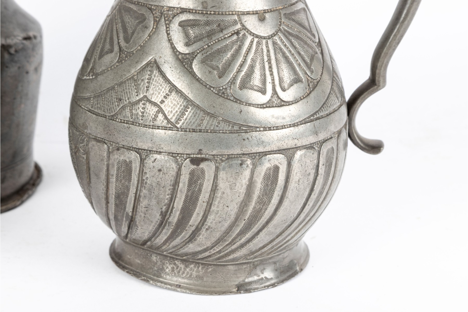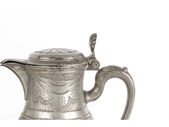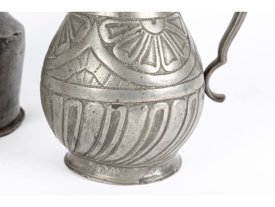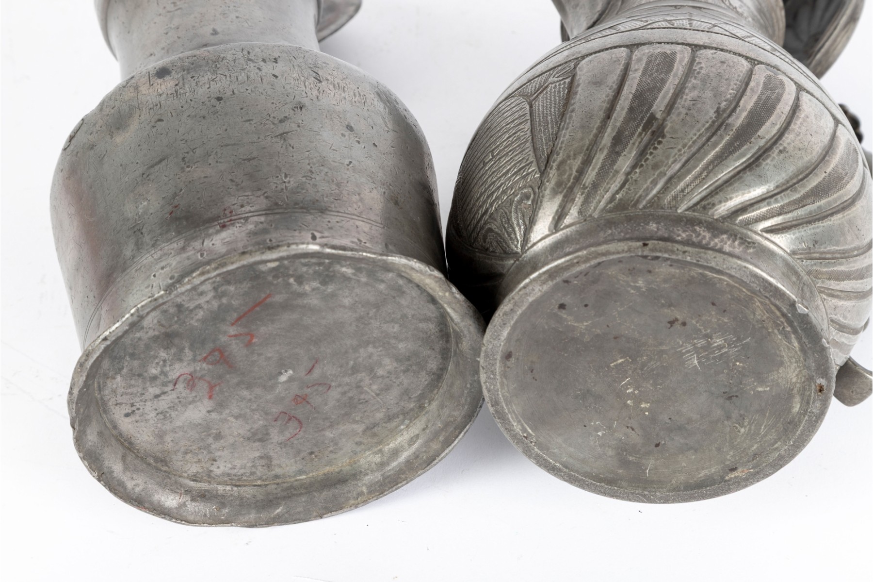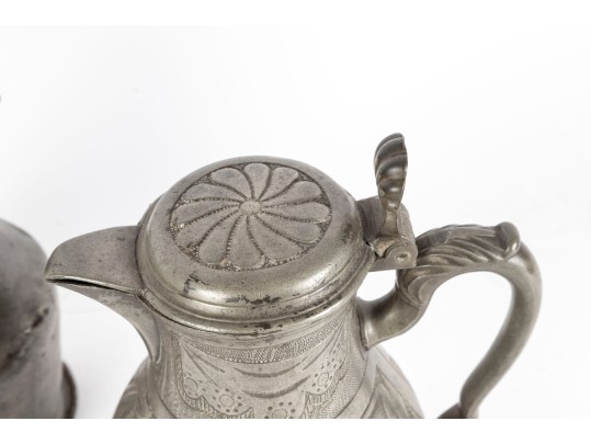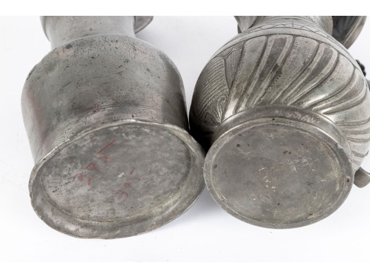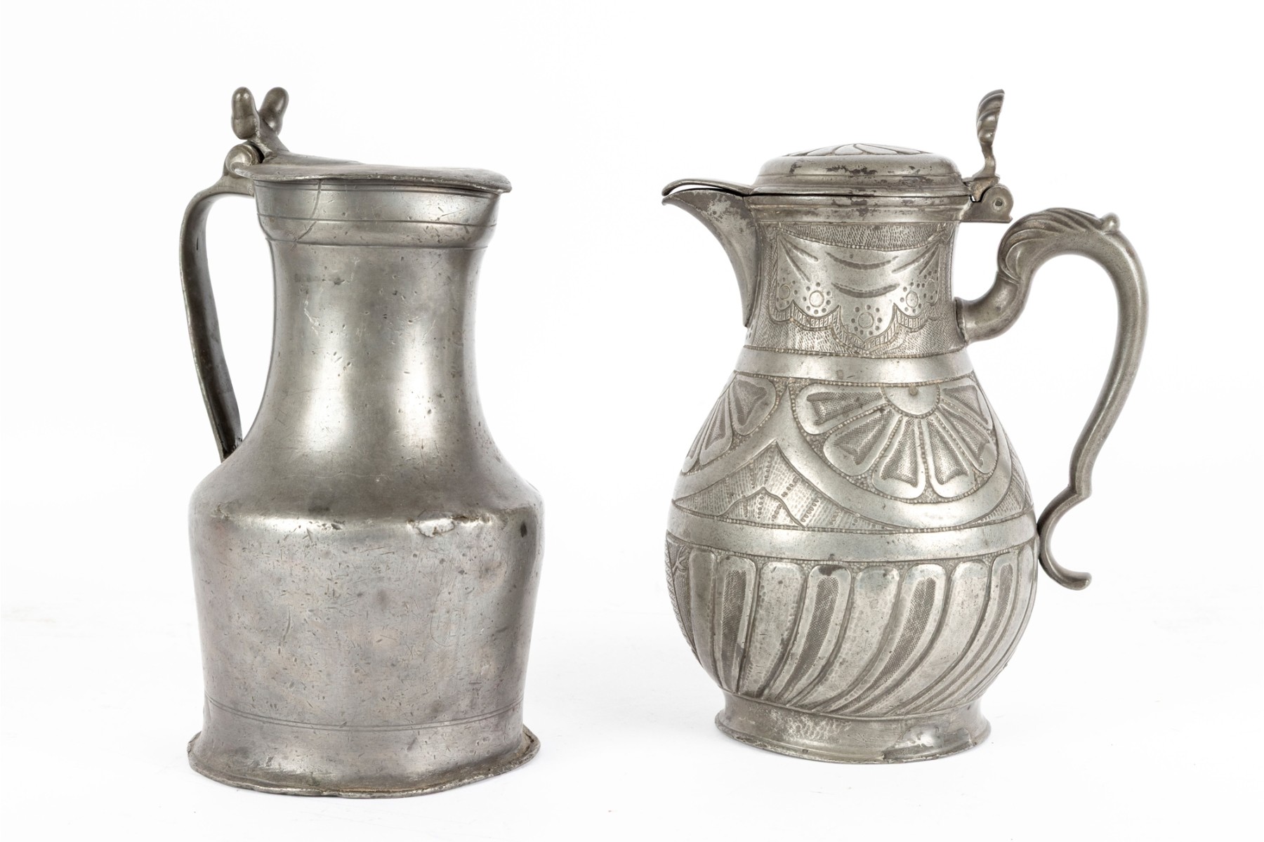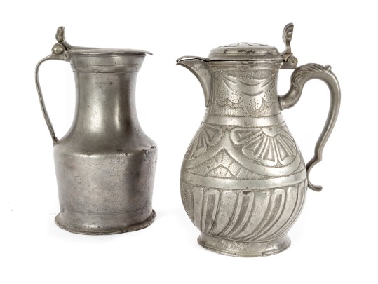 A delightful pair of antique pewter lidded jugs, likely French. The first sports a simple, rustic design with a mallet form body and fine banded decorations. The second showcases a pear form with gorgeous relief including draped garlands, half-suns or flowers, and swooping gadroons.