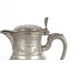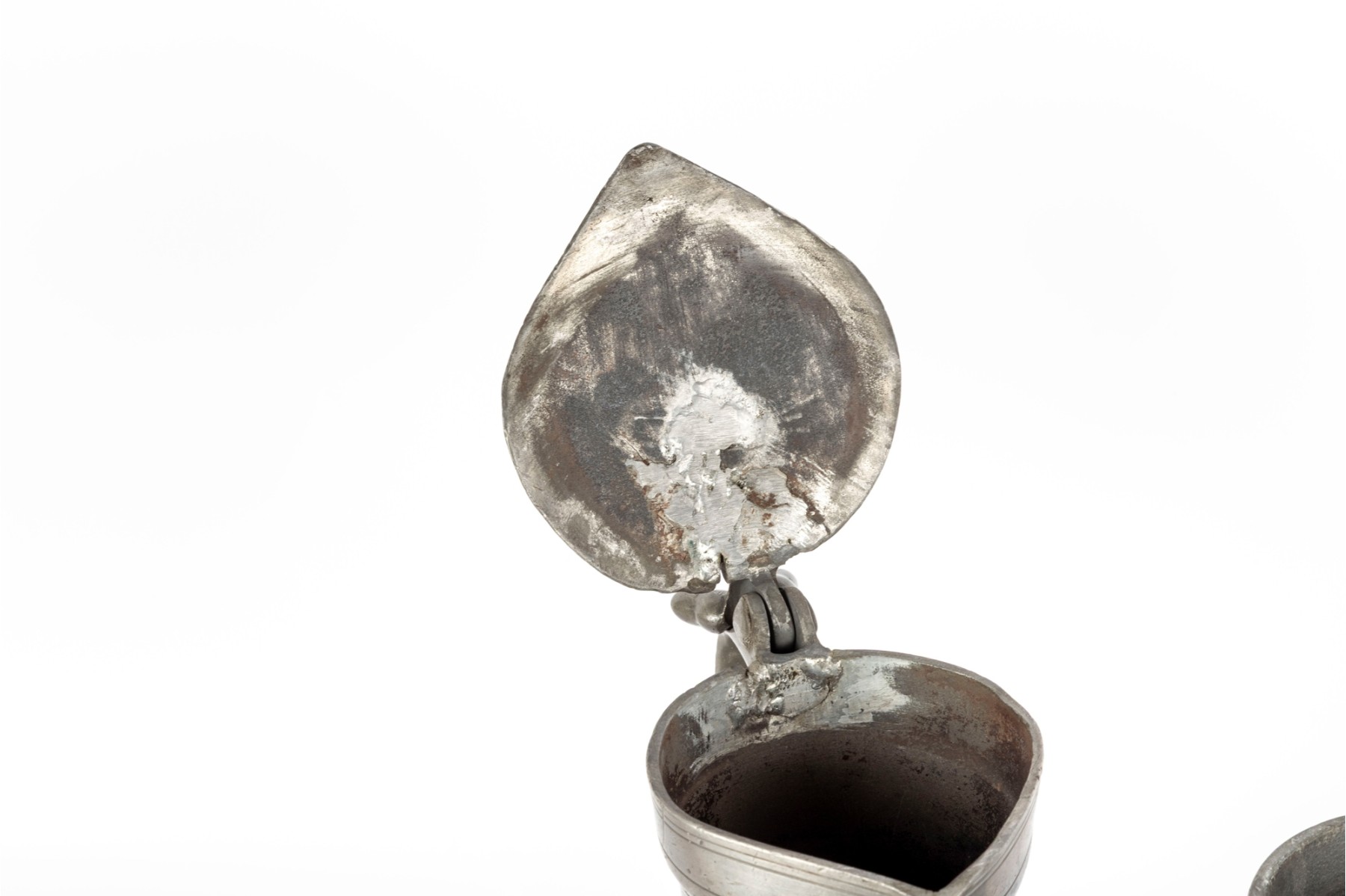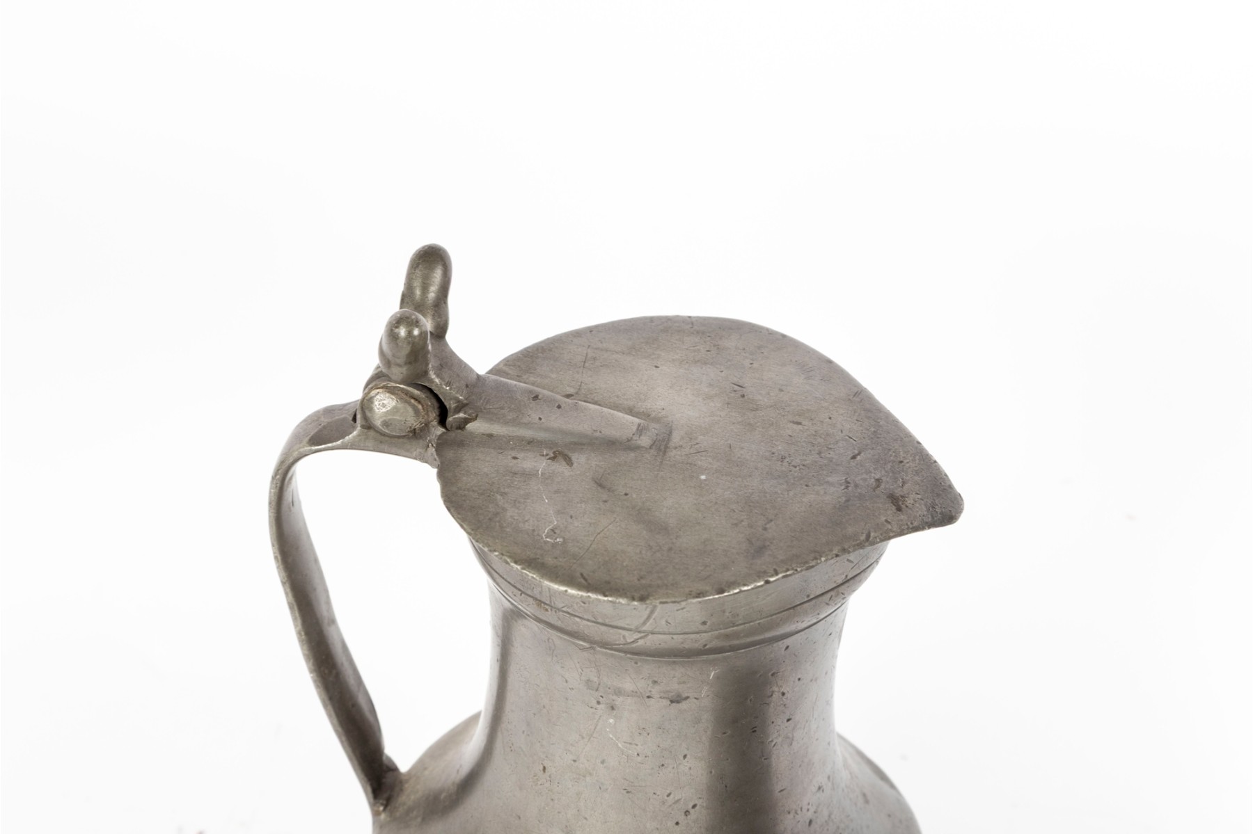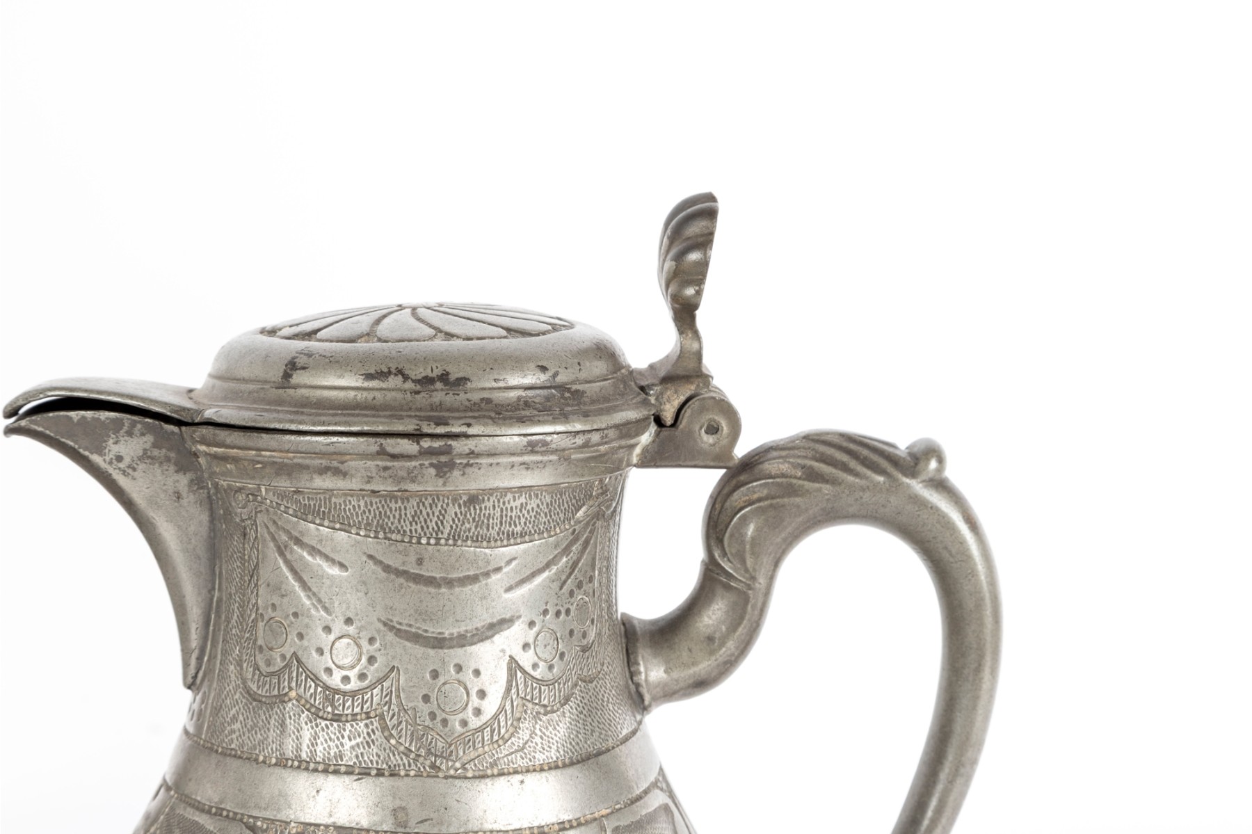 A delightful pair of antique pewter lidded jugs, likely French. The first sports a simple, rustic design with a mallet form body and fine banded decorations. The second showcases a pear form with gorgeous relief including draped garlands, half-suns or flowers, and swooping gadroons.