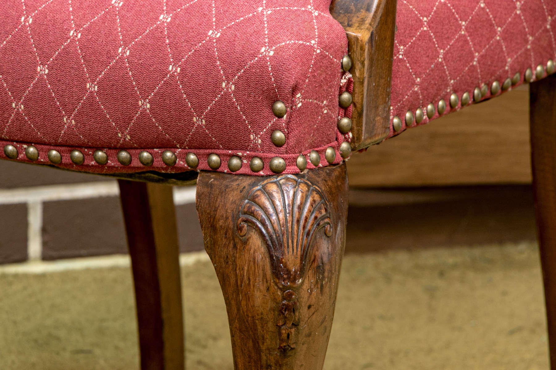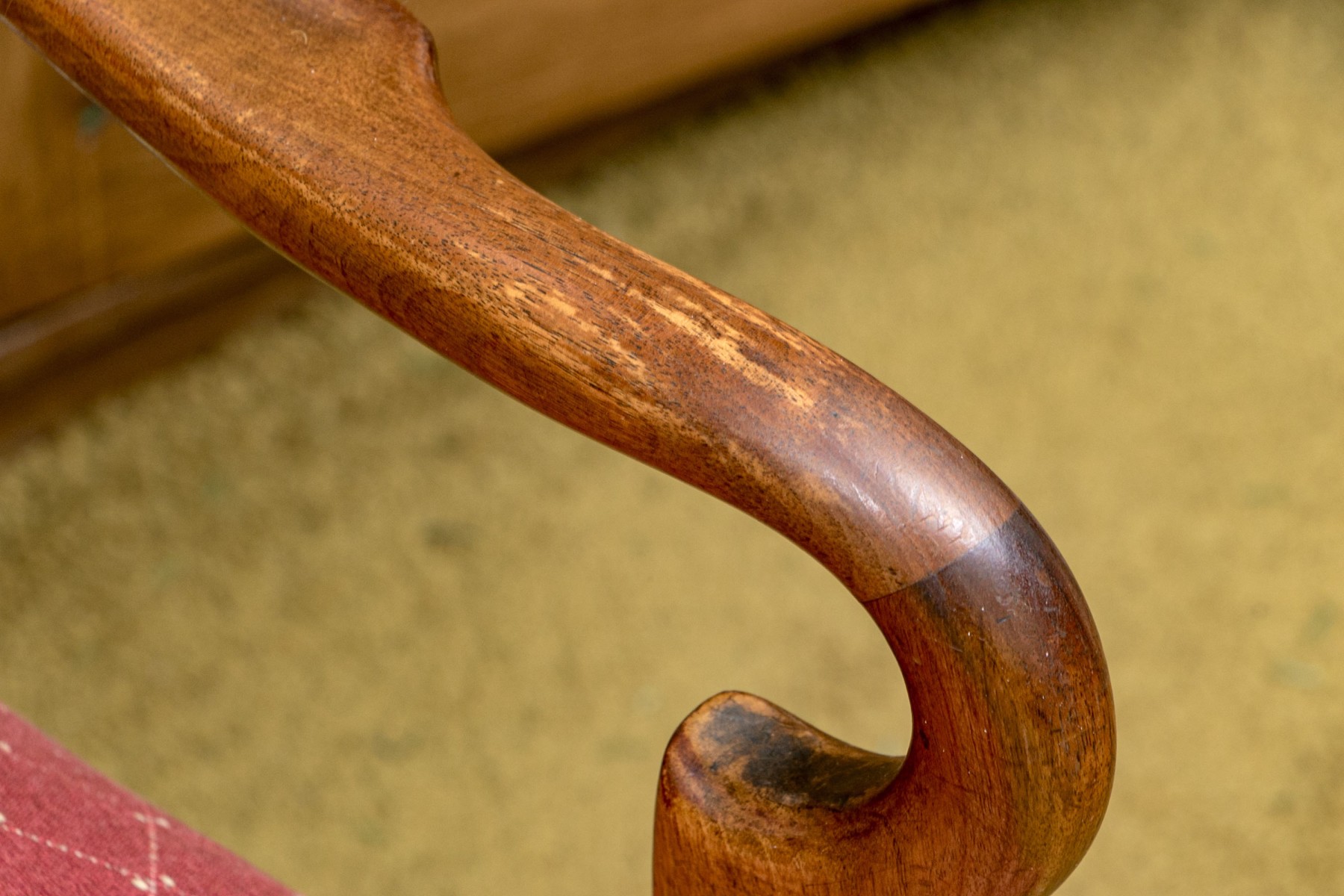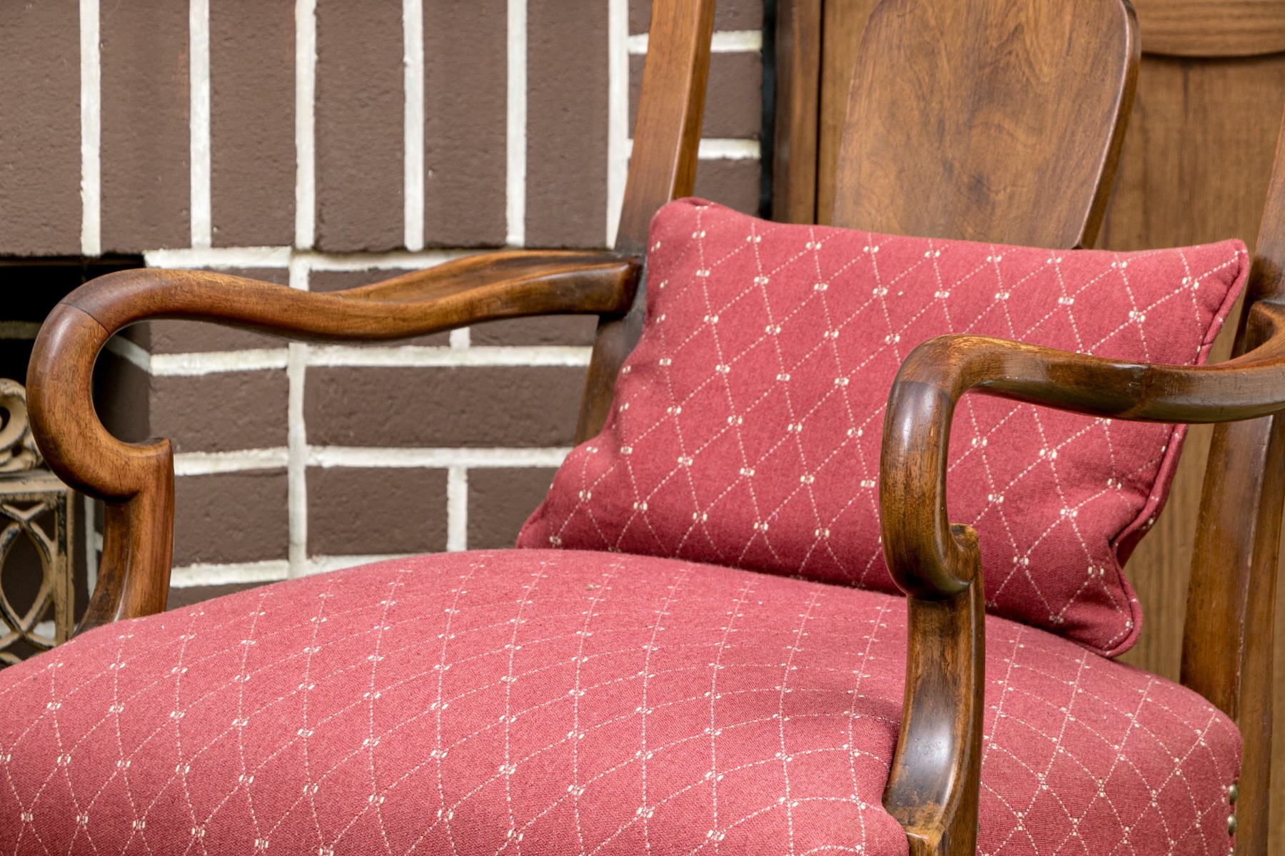 Elegant armchairs in carved fruitwood or walnut with vasiform splats and shepherd's crook flat arms. Raised on curved front legs with carved shell knees and pad feet. Square curved back legs. Upholstered in red and white diamond pattern fabric with lumbar pillows.