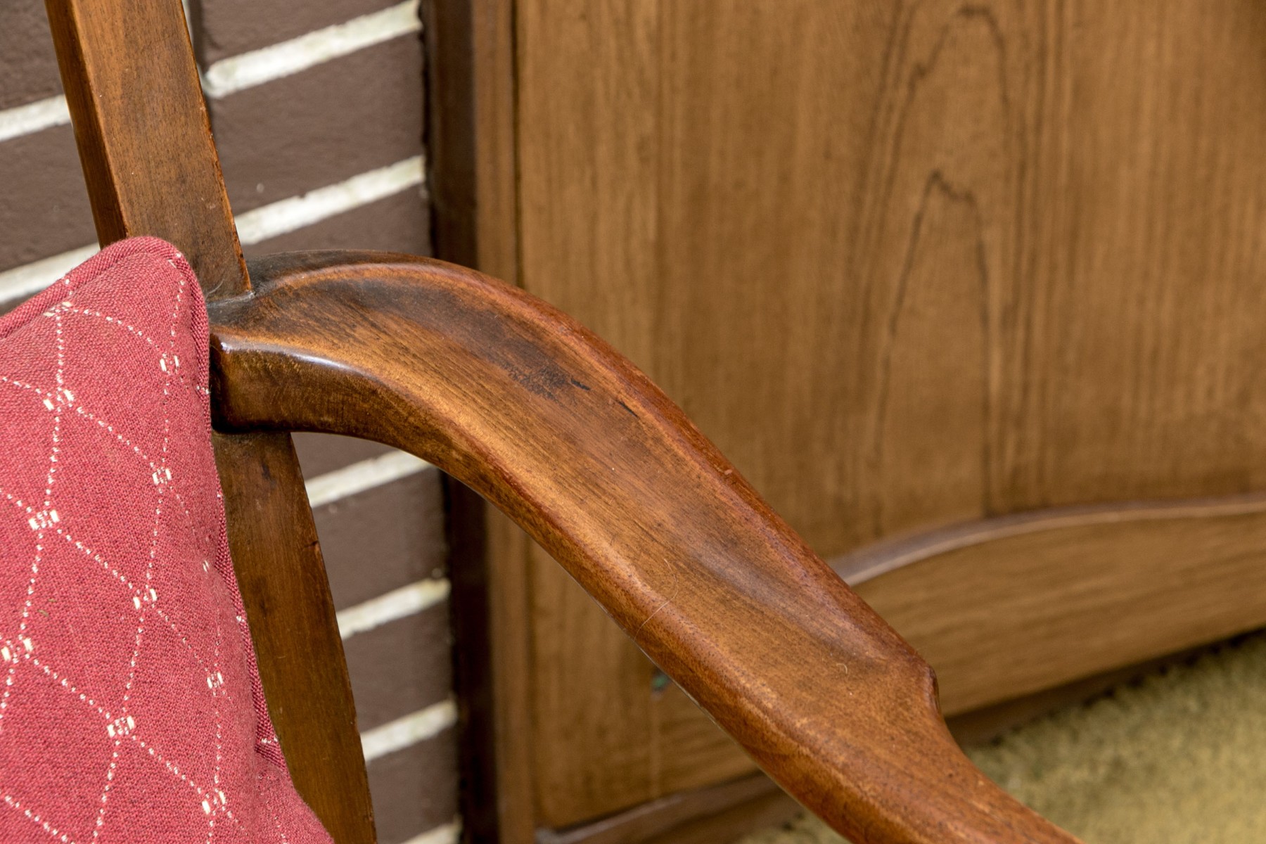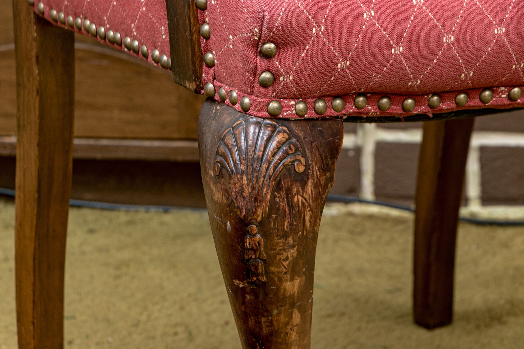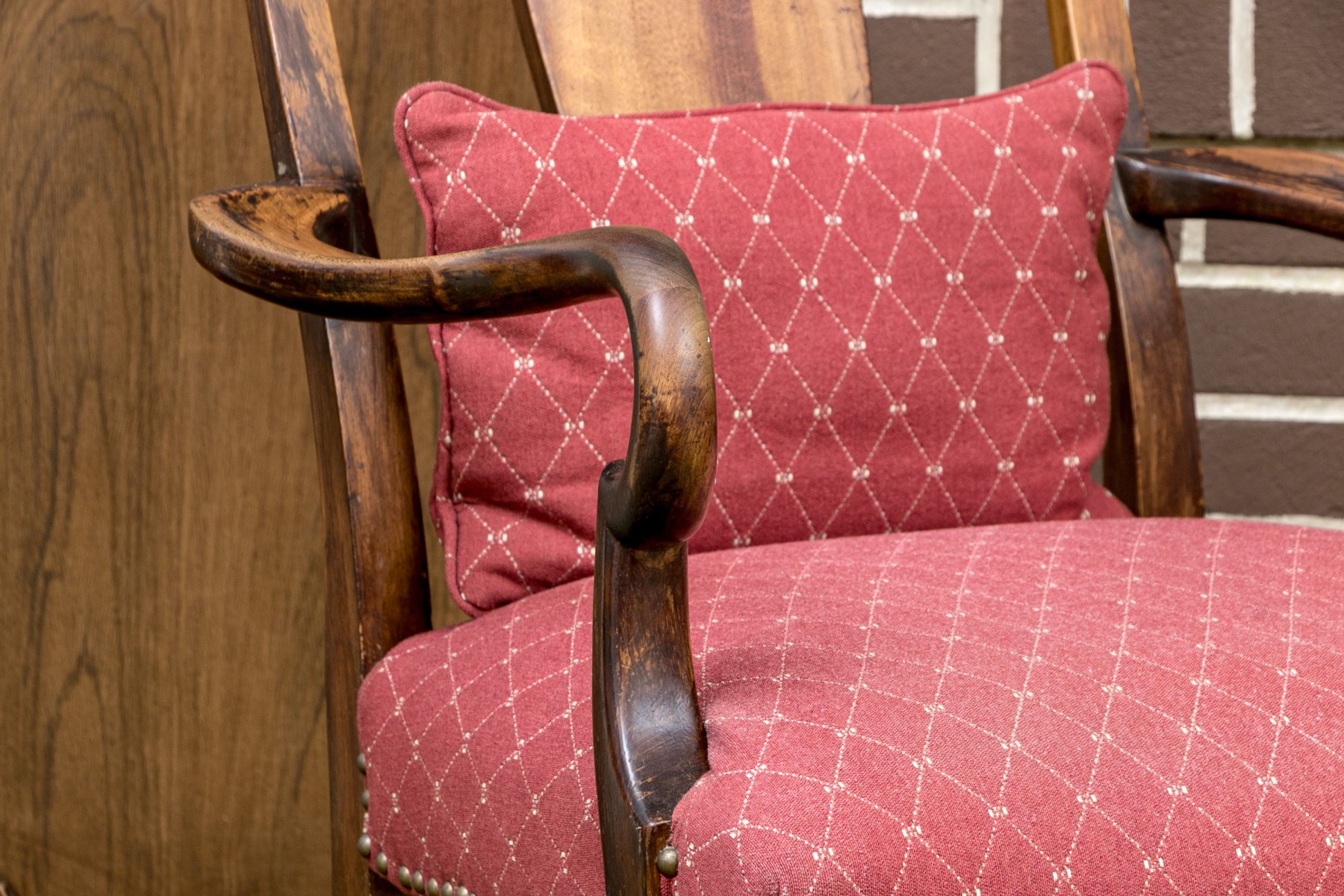 Elegant armchairs in carved fruitwood or walnut with vasiform splats and shepherd's crook flat arms. Raised on curved front legs with carved shell knees and pad feet. Square curved back legs. Upholstered in red and white diamond pattern fabric with lumbar pillows.