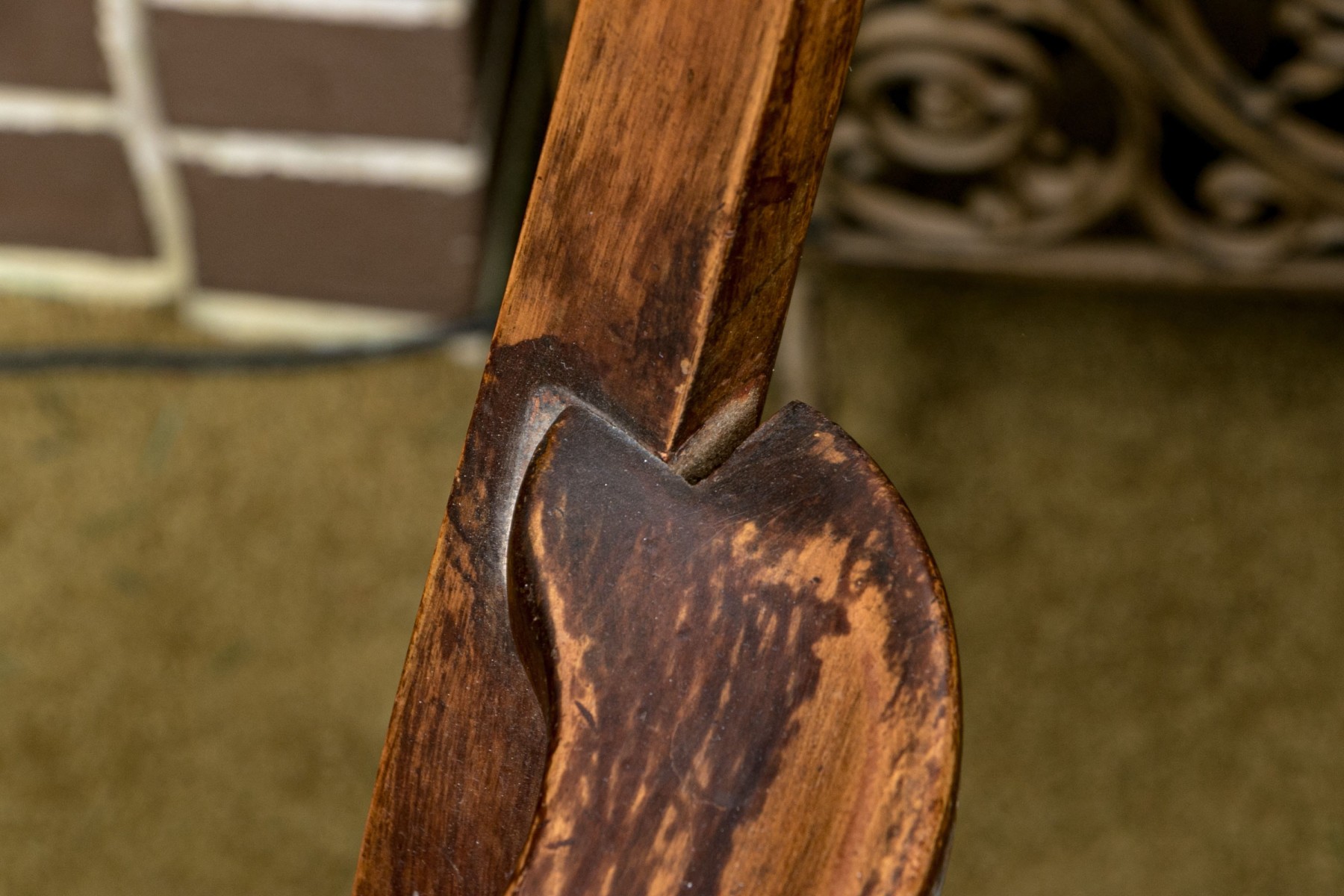 Condition: clean, one chair with worn crest rail and arms, stains on both splats, some scrapes to the feet. Please review the photos as they are part of the condition report.