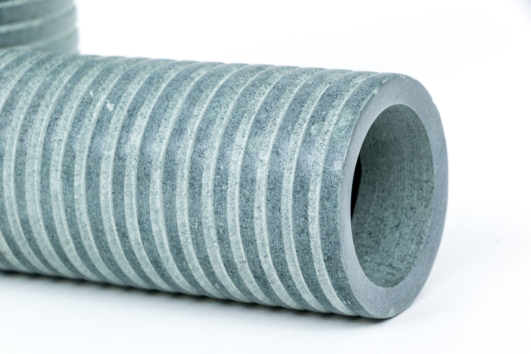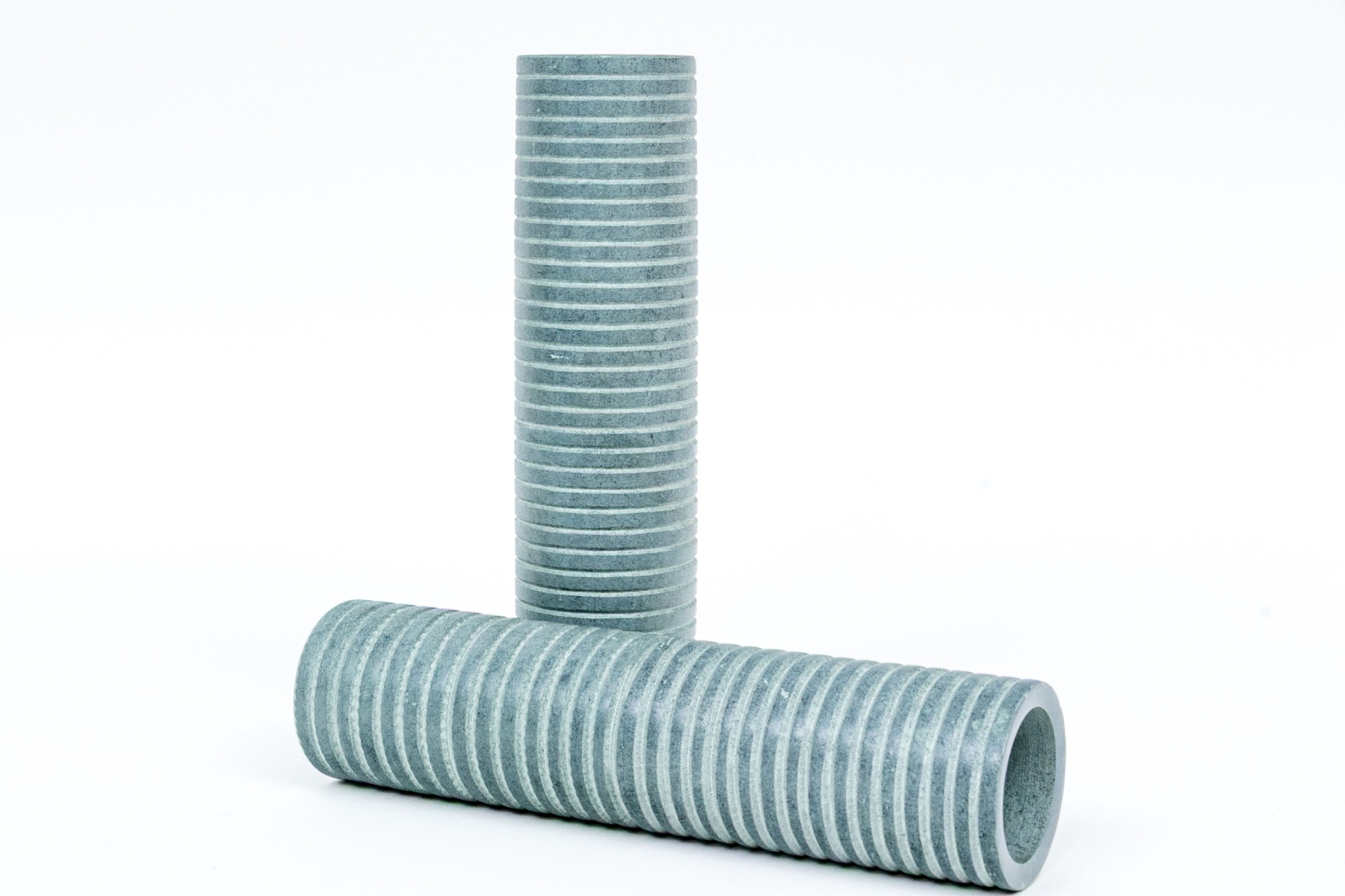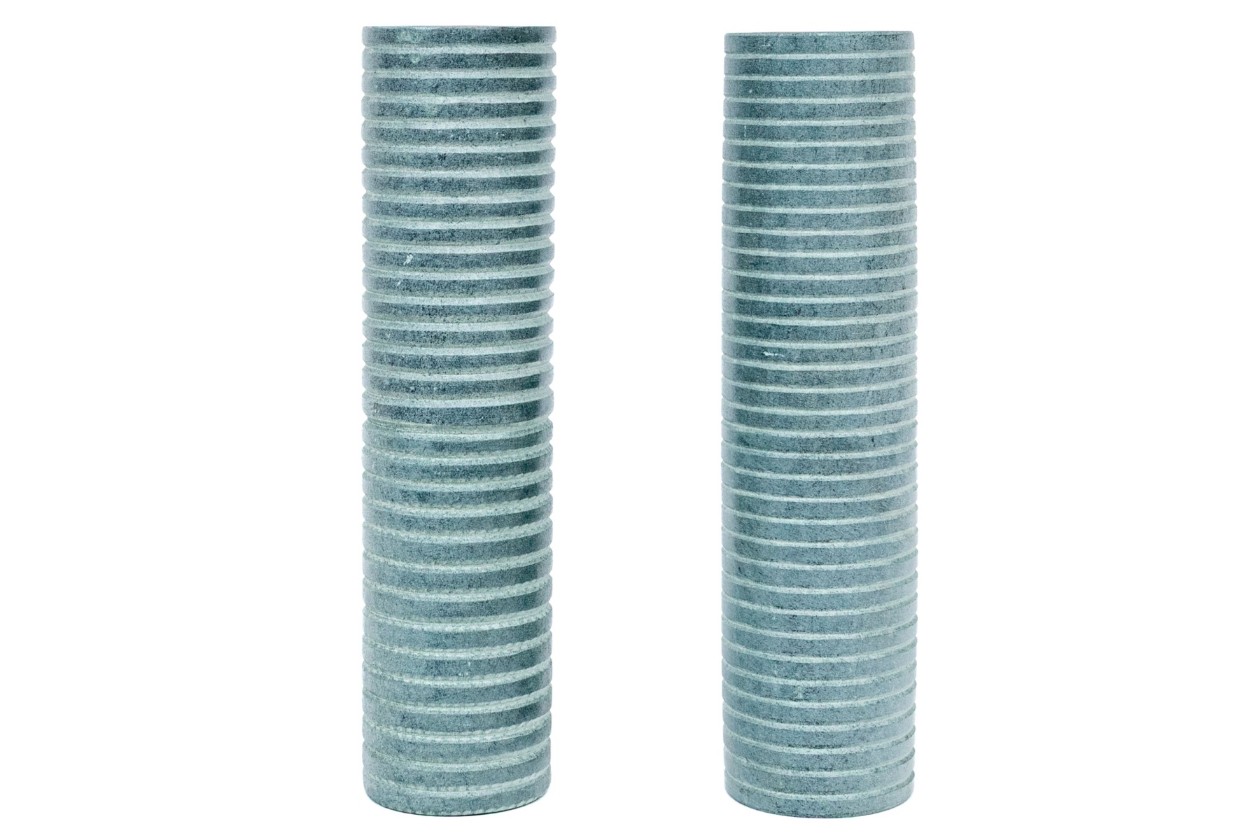Slim gray stone cylindircal vases carved in a ribbed pattern. With labels on the bases.