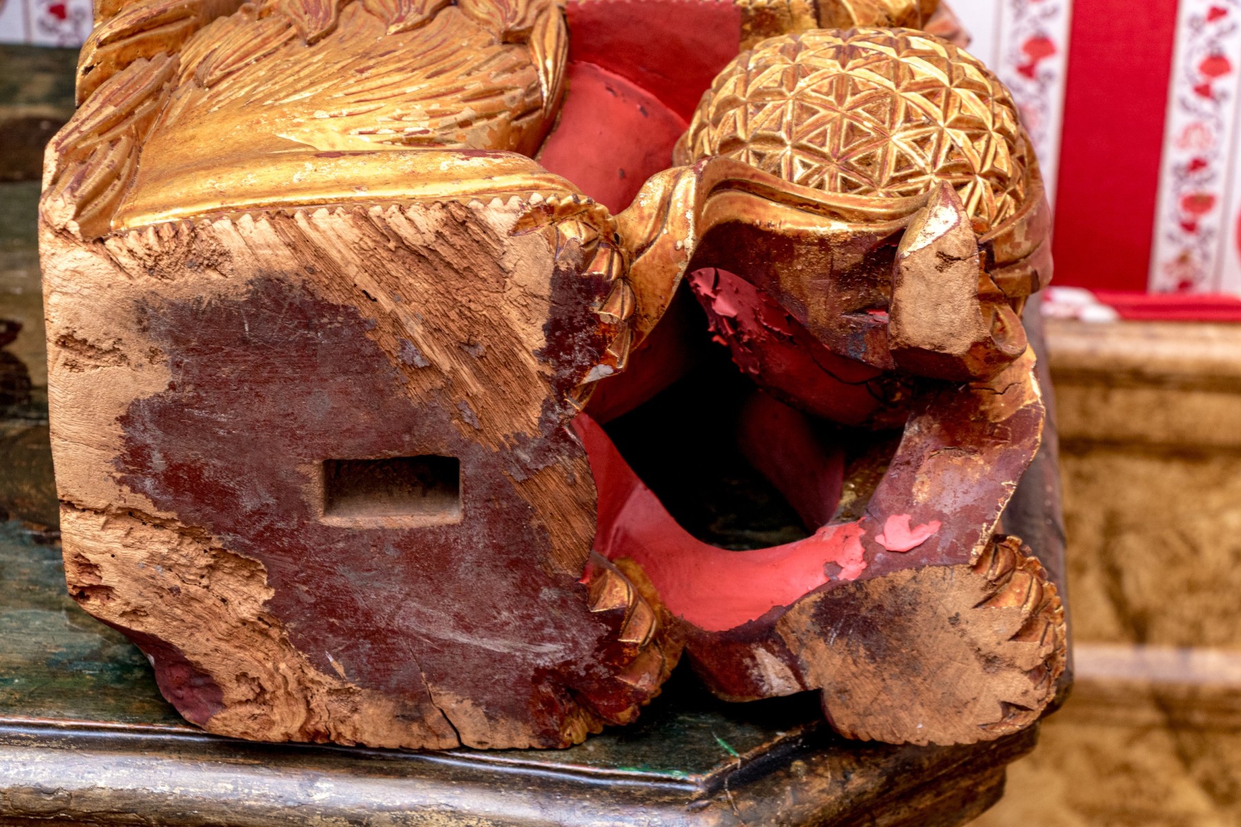 A stunning pair of Asian foo dogs sporting gilt shaggy fur, arched plume-like tails, and colorful red underbellies. The female poses with its child playfully perched on its raised paw, while the male raises its paw over a high decorative lattice pierced orb. Notches to the back side and bottom; they were likely mounted on an architectural element, possibly a temple.