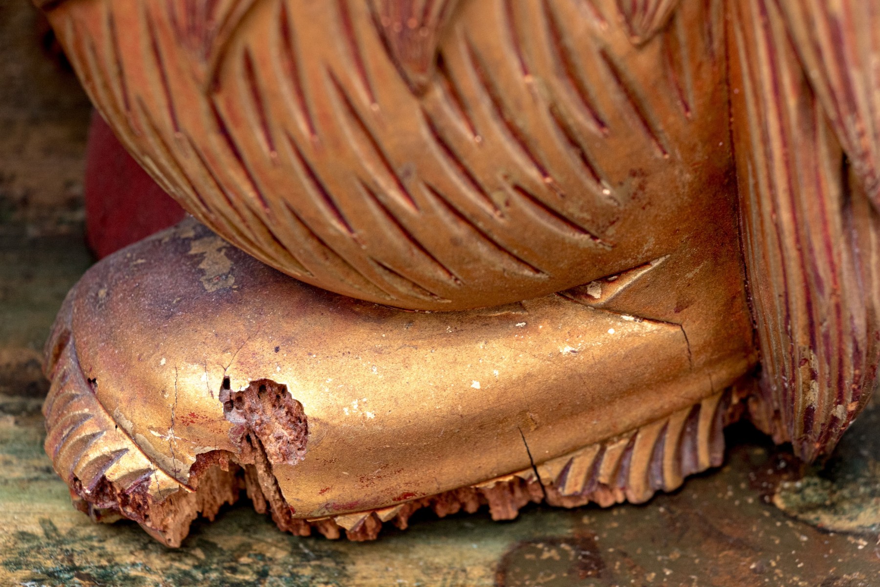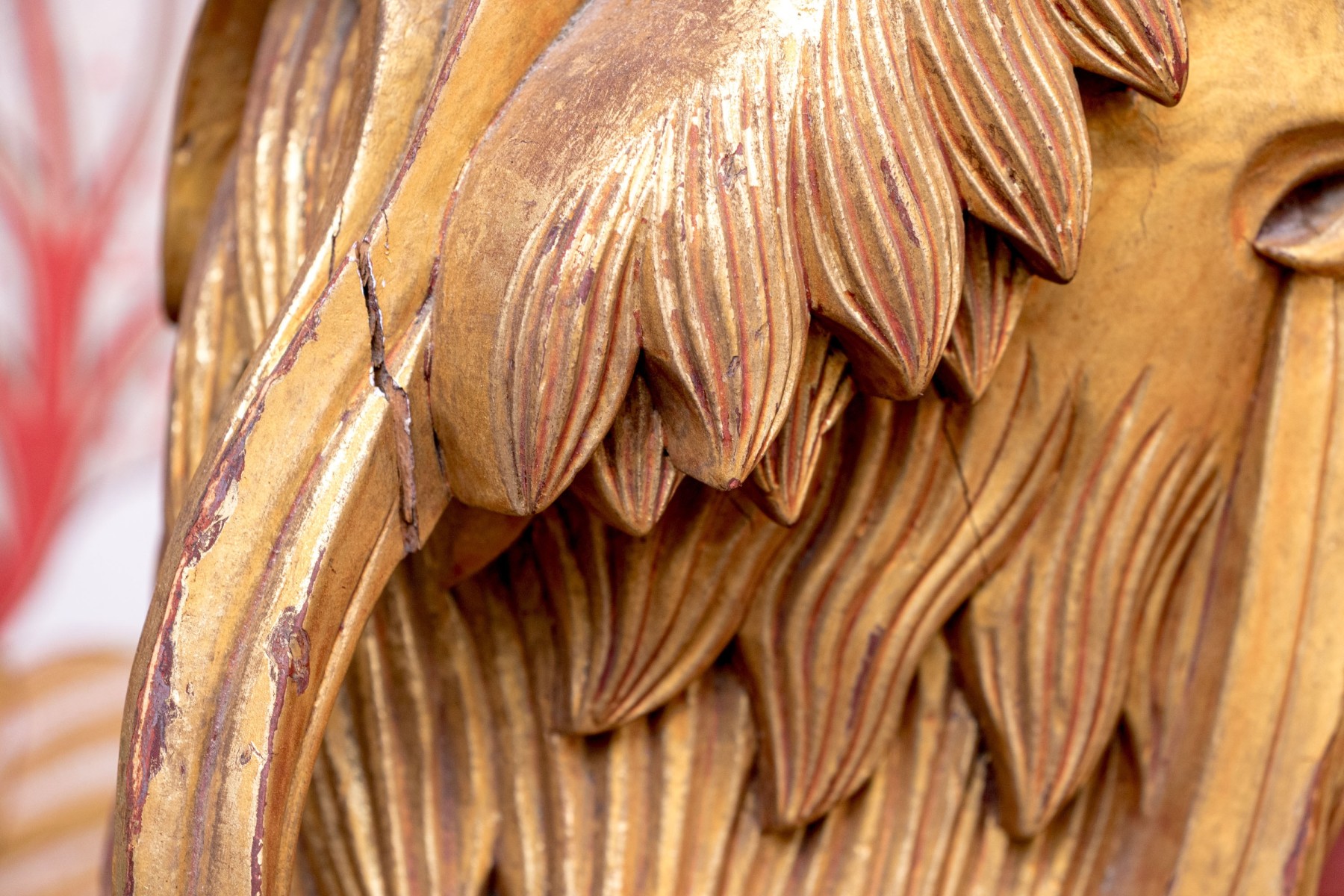 Losses to the gilt and painted finish with splits to the bodies, to the elbow and behind the tail of the male and in spots to the female.