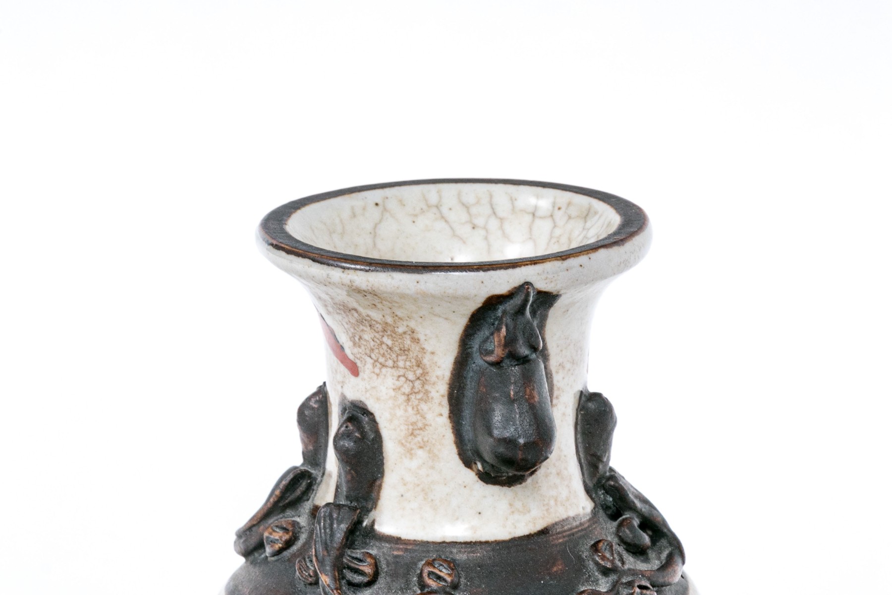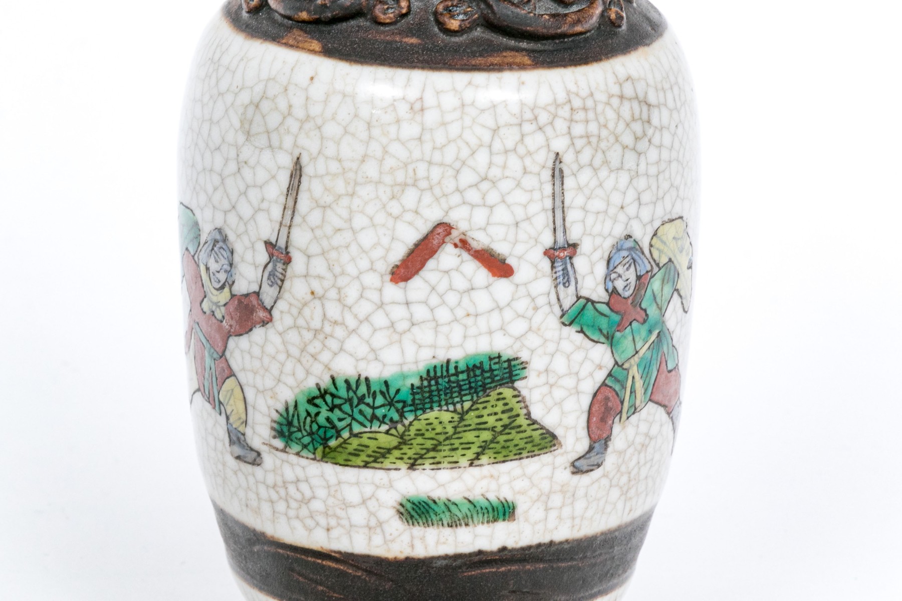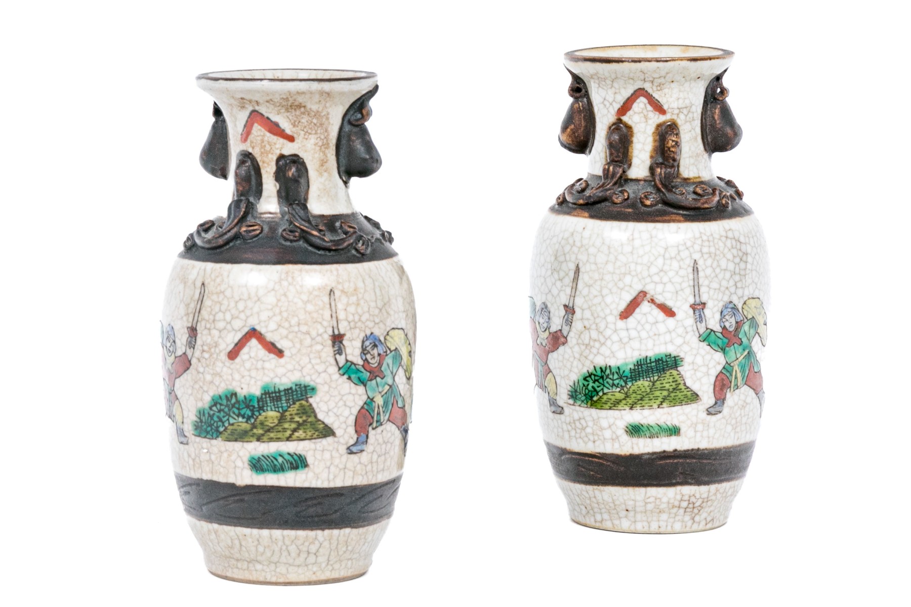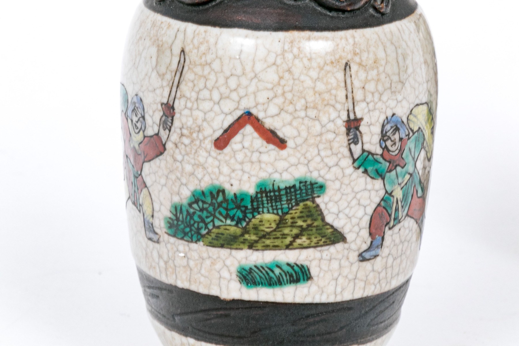 A pair of Asian diminutive vases with mixed glazed finish with a central band of figures with shields and swords in battle against crackle glazed finish. Moulded dragons to neck and mouth rim with a bronzed finish glaze. Two character mark underfoot.