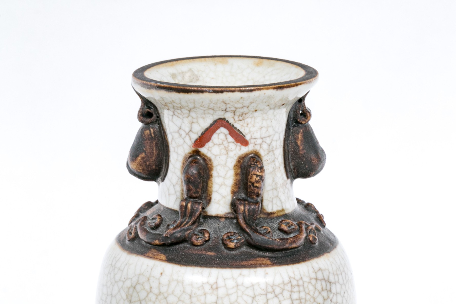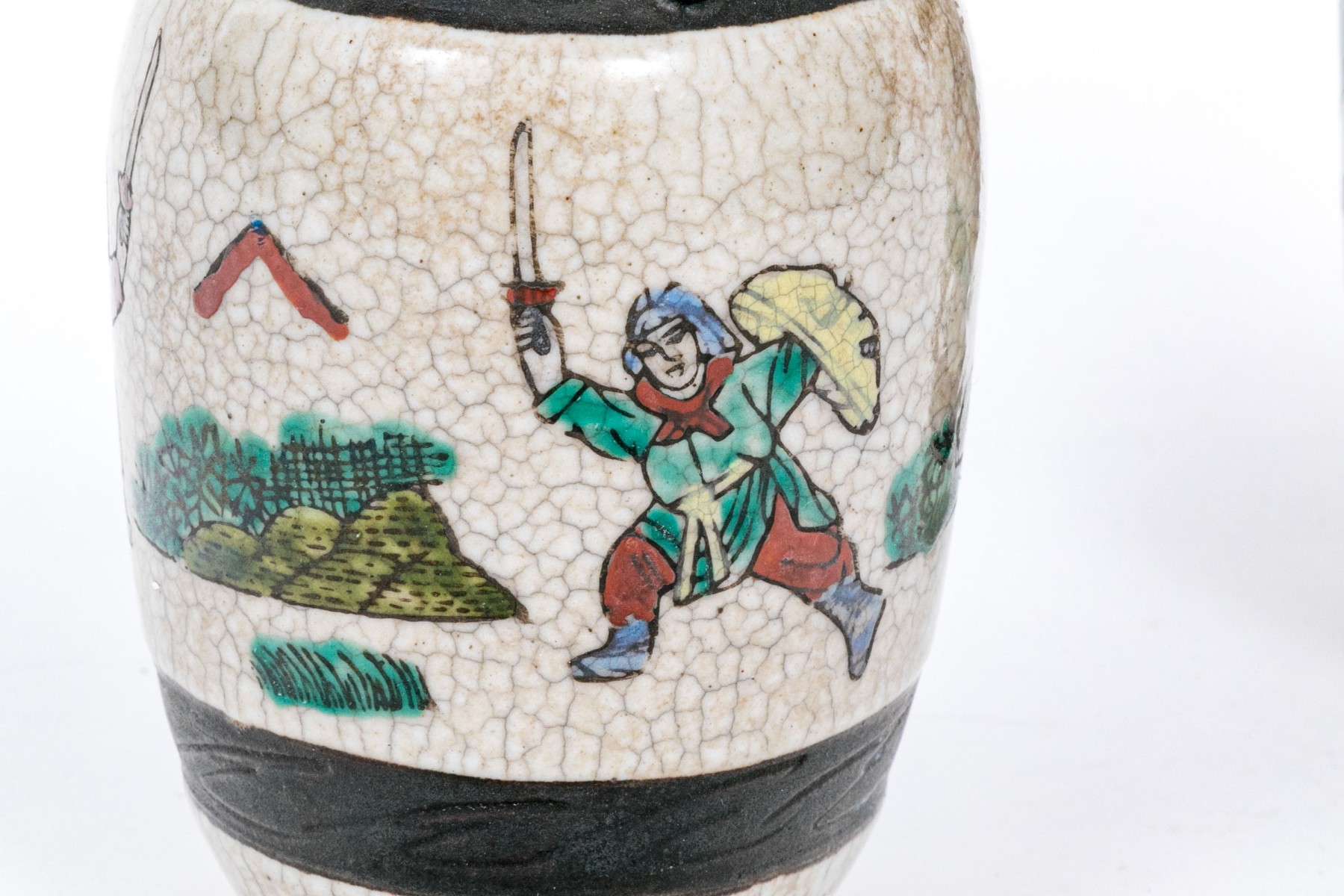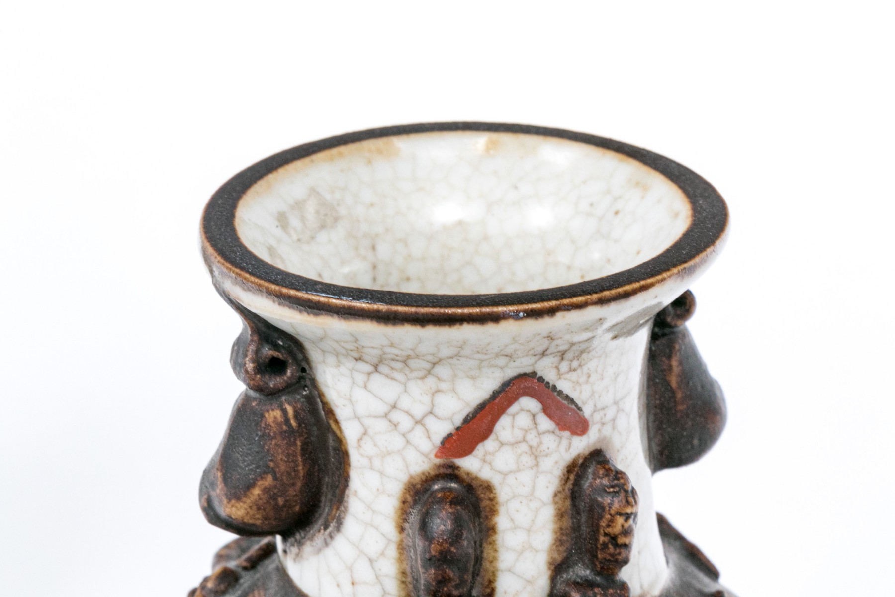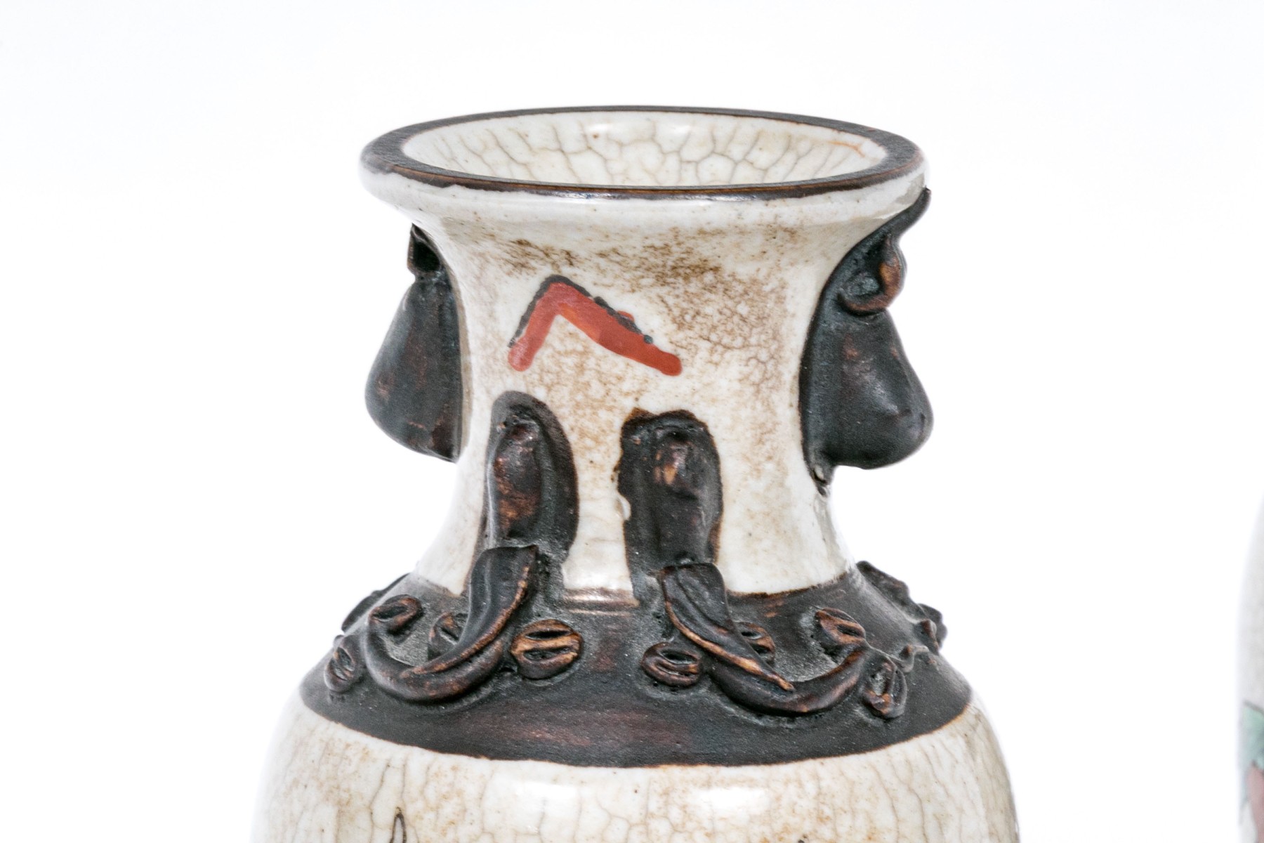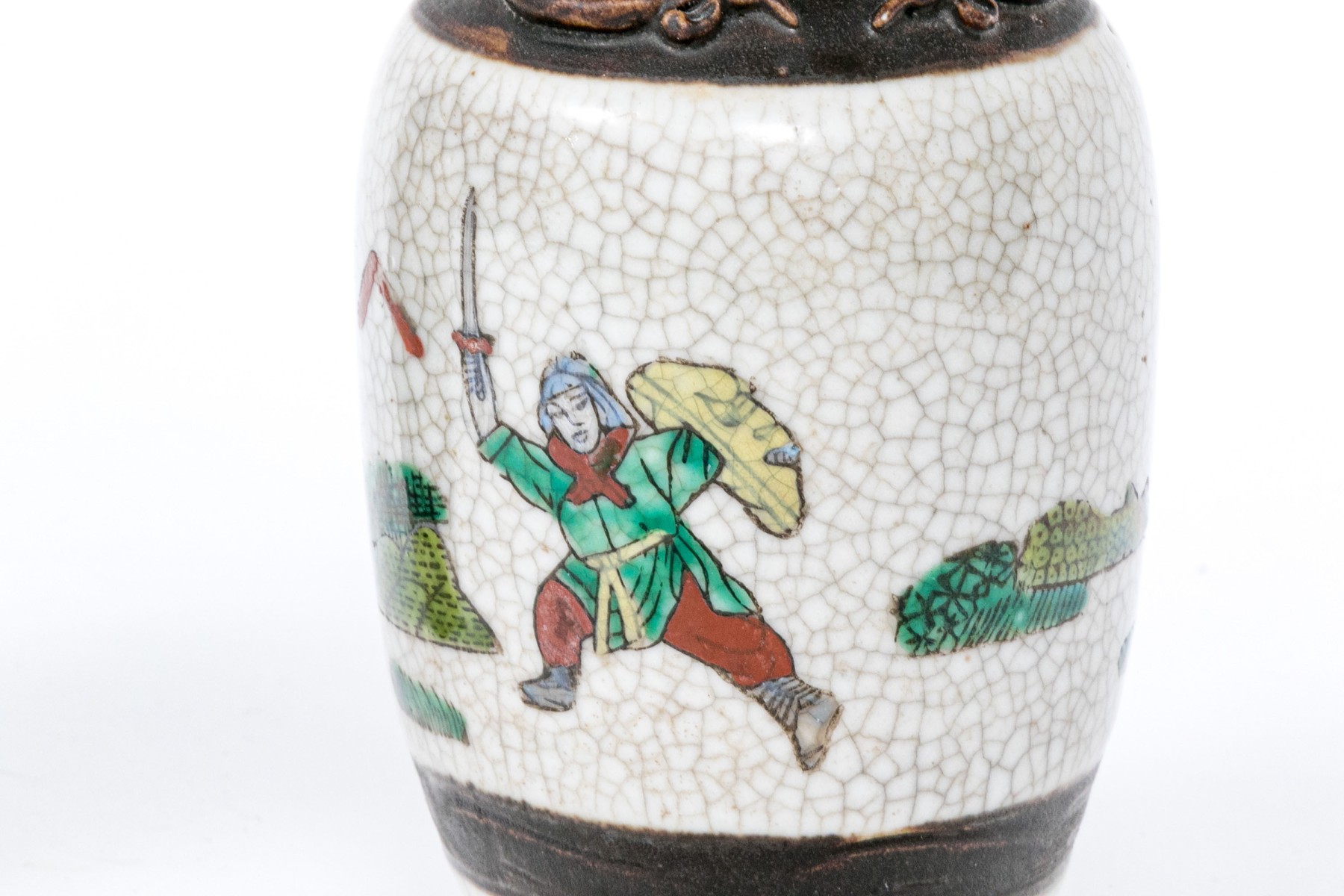 A pair of Asian diminutive vases with mixed glazed finish with a central band of figures with shields and swords in battle against crackle glazed finish. Moulded dragons to neck and mouth rim with a bronzed finish glaze. Two character mark underfoot.