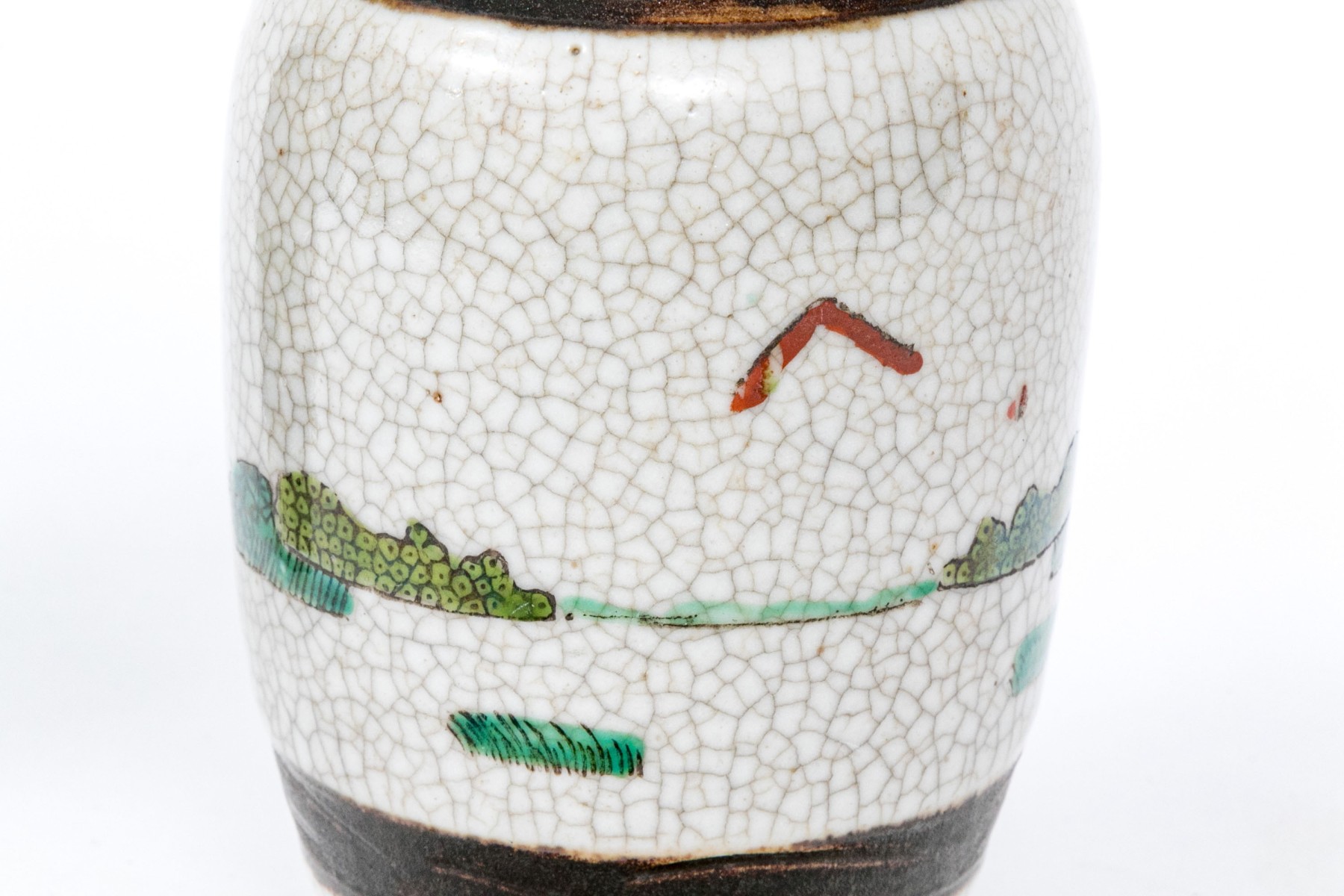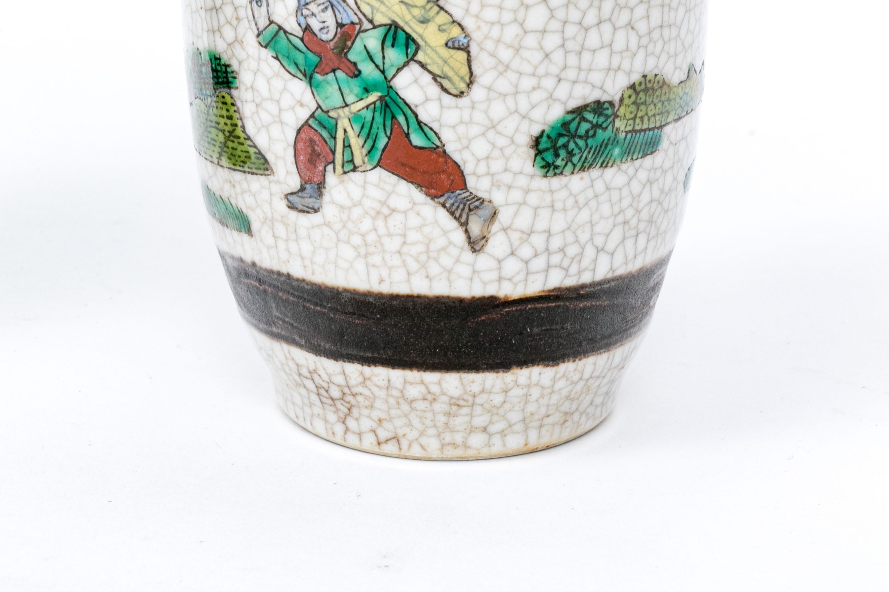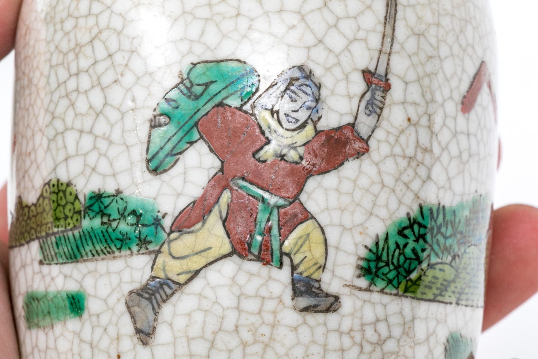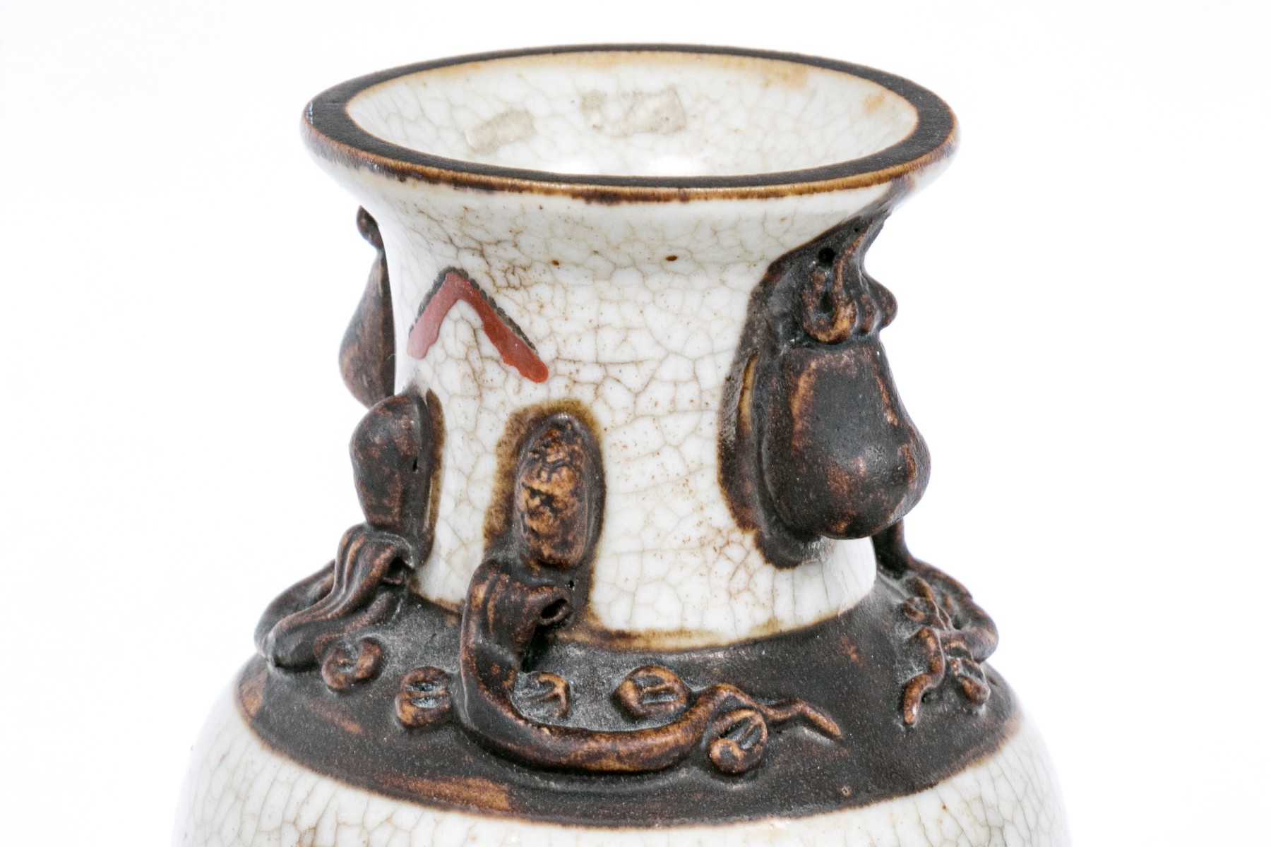 A pair of Asian diminutive vases with mixed glazed finish with a central band of figures with shields and swords in battle against crackle glazed finish. Moulded dragons to neck and mouth rim with a bronzed finish glaze. Two character mark underfoot.