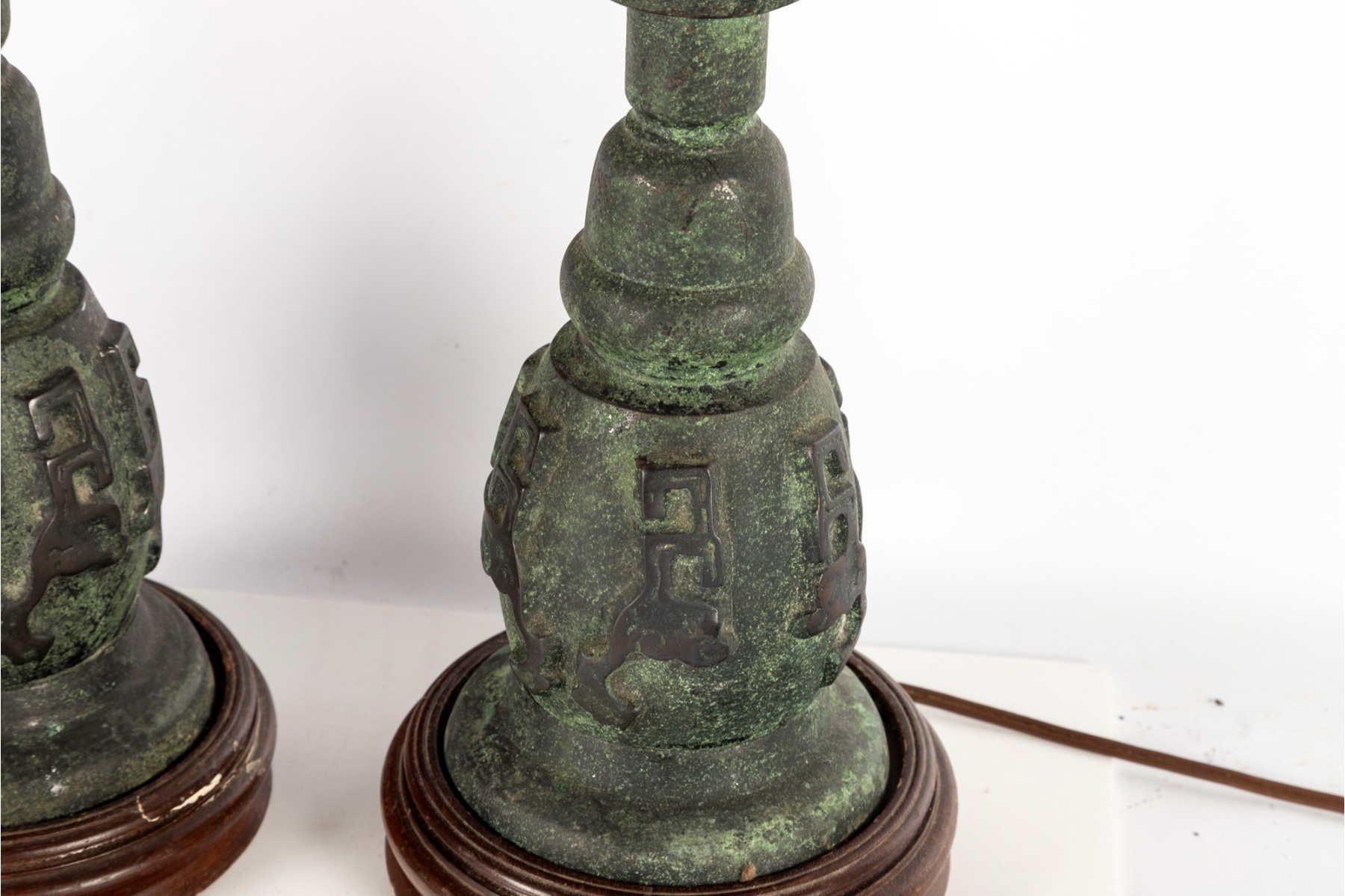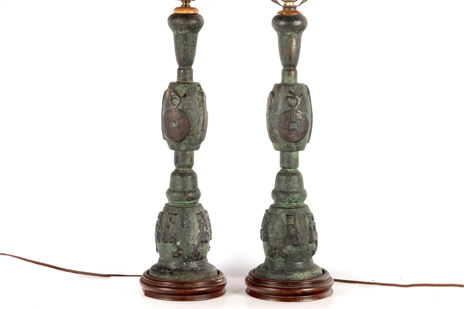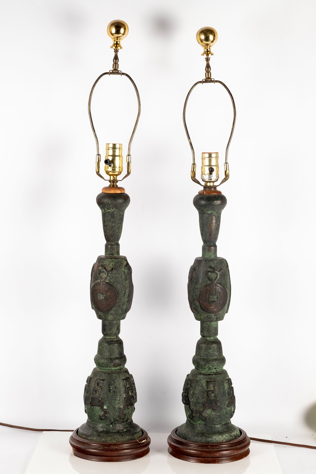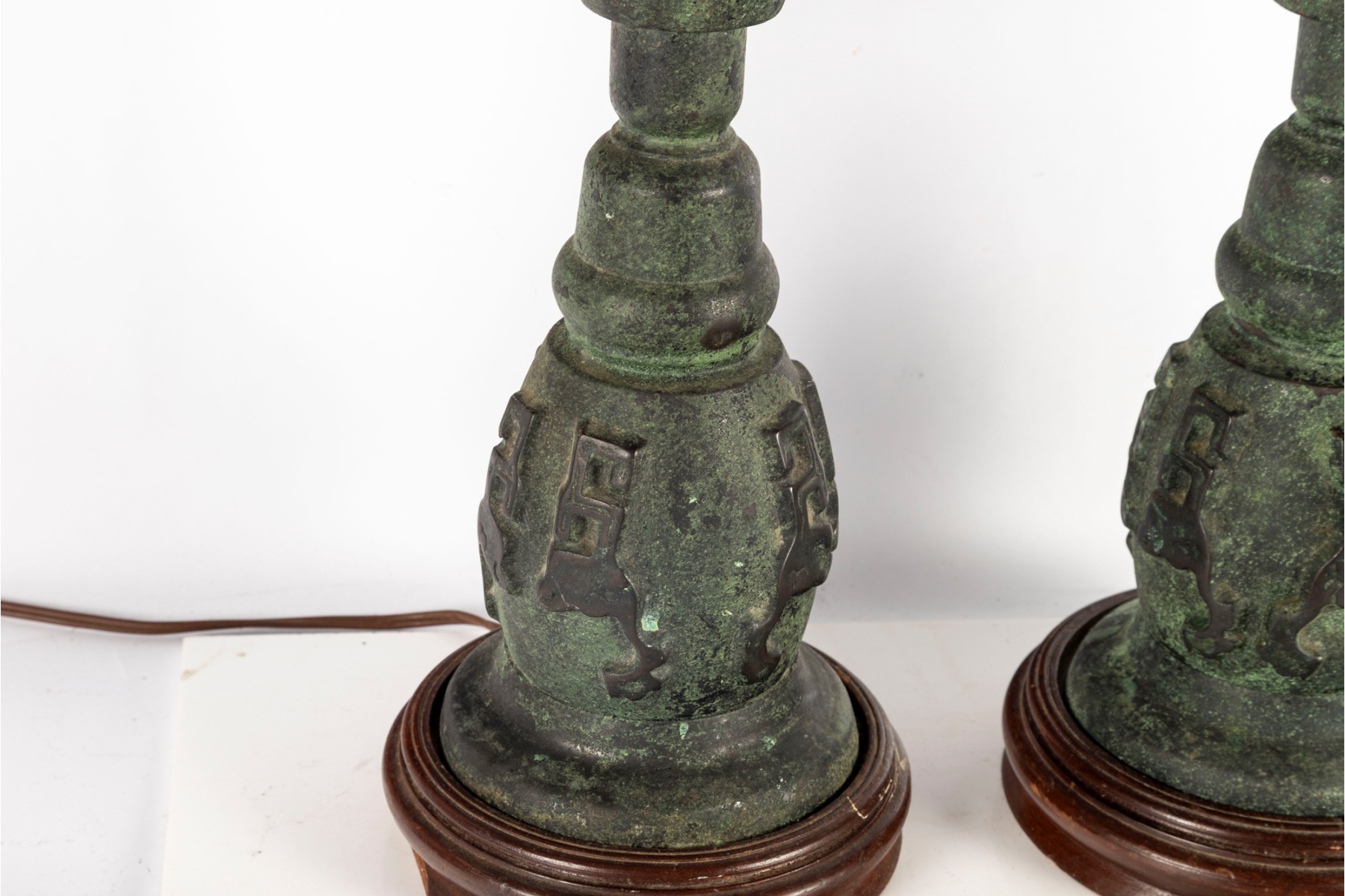Pair of heavy metal table lamps in an aged verdigris finish, each featuring cast relief designs inspired by ancient Chinese motifs, including stylized coin and key patterns. The bodies are mounted on circular wooden bases with brass harp fittings and finials.