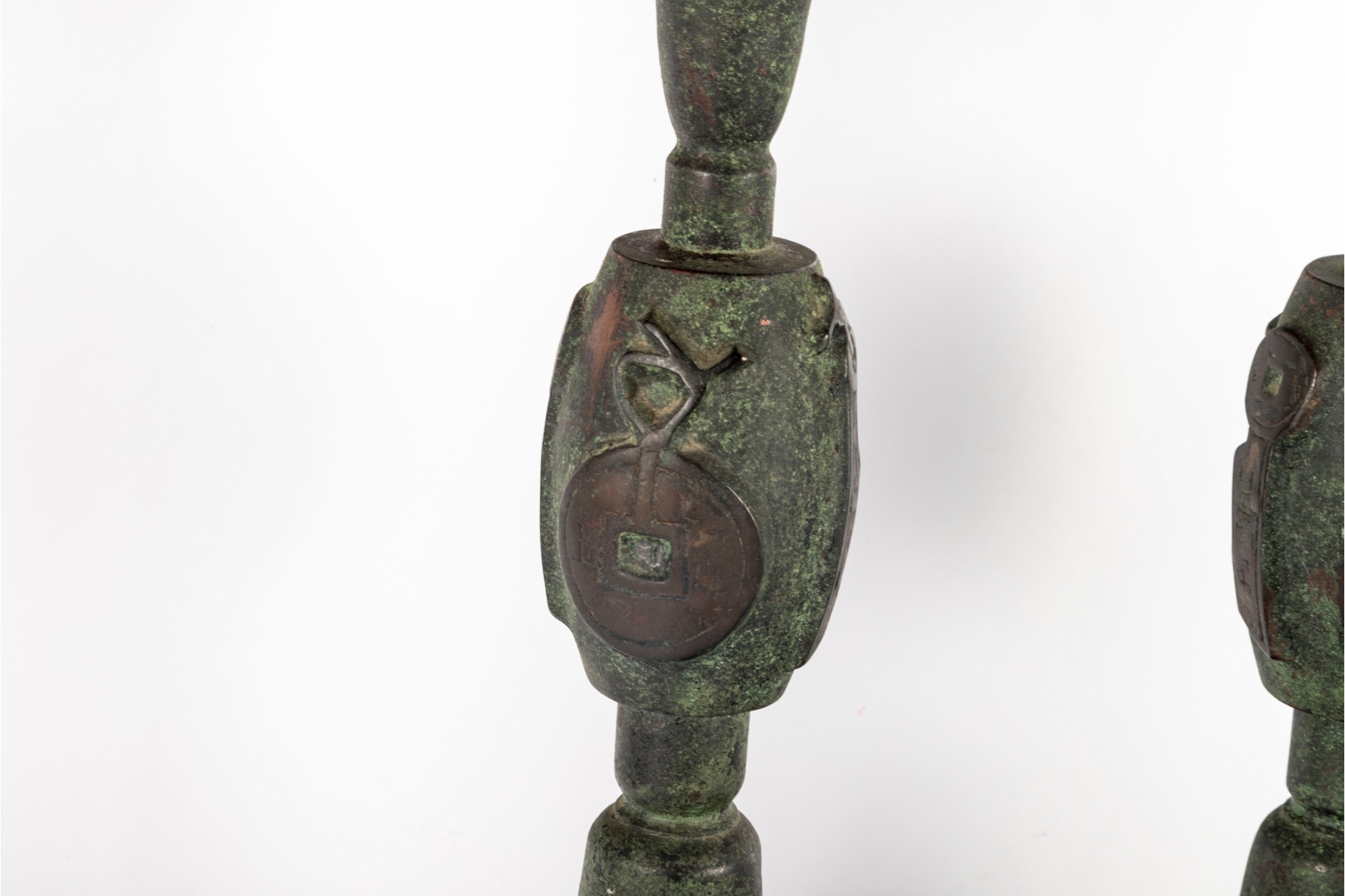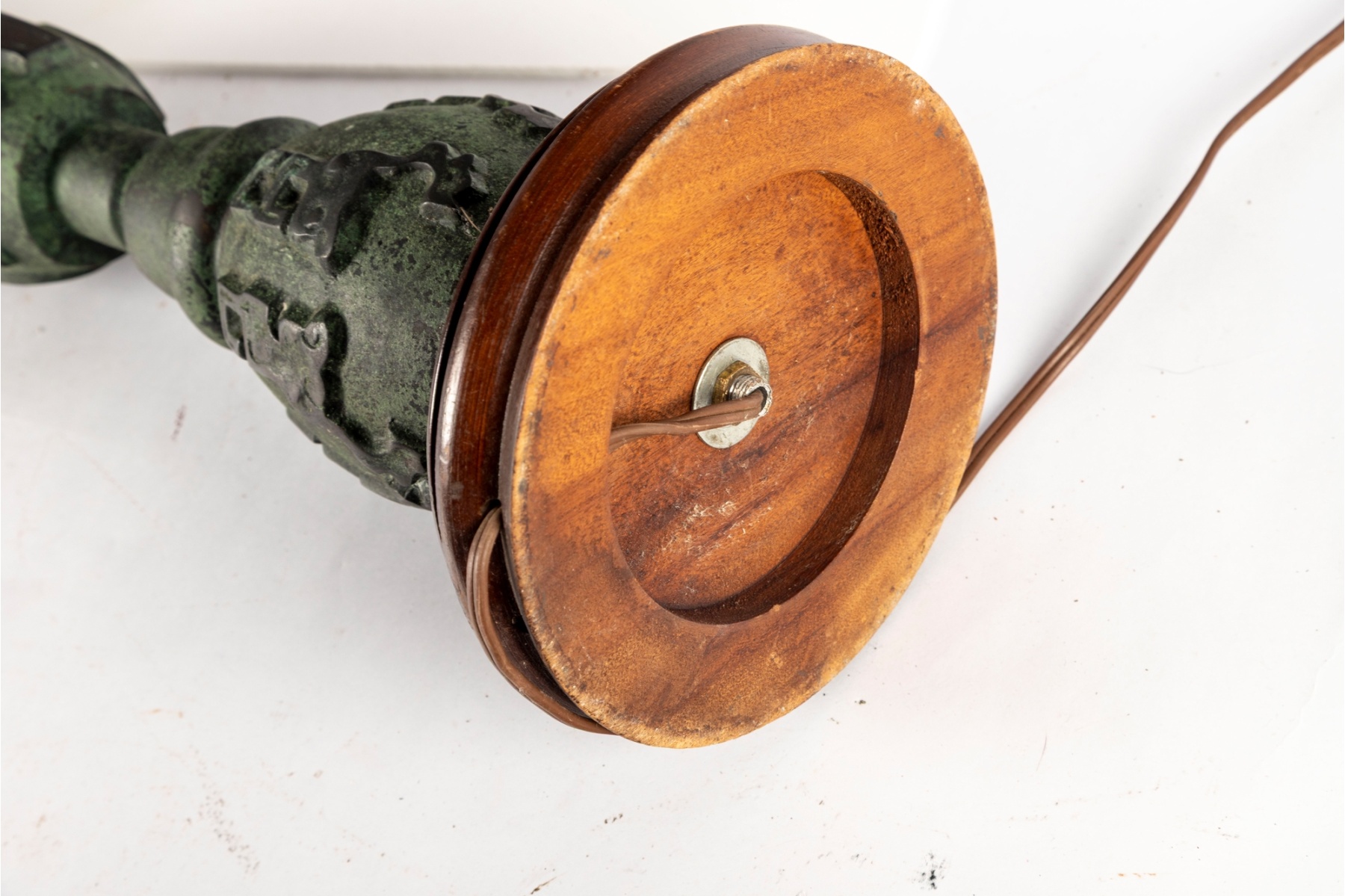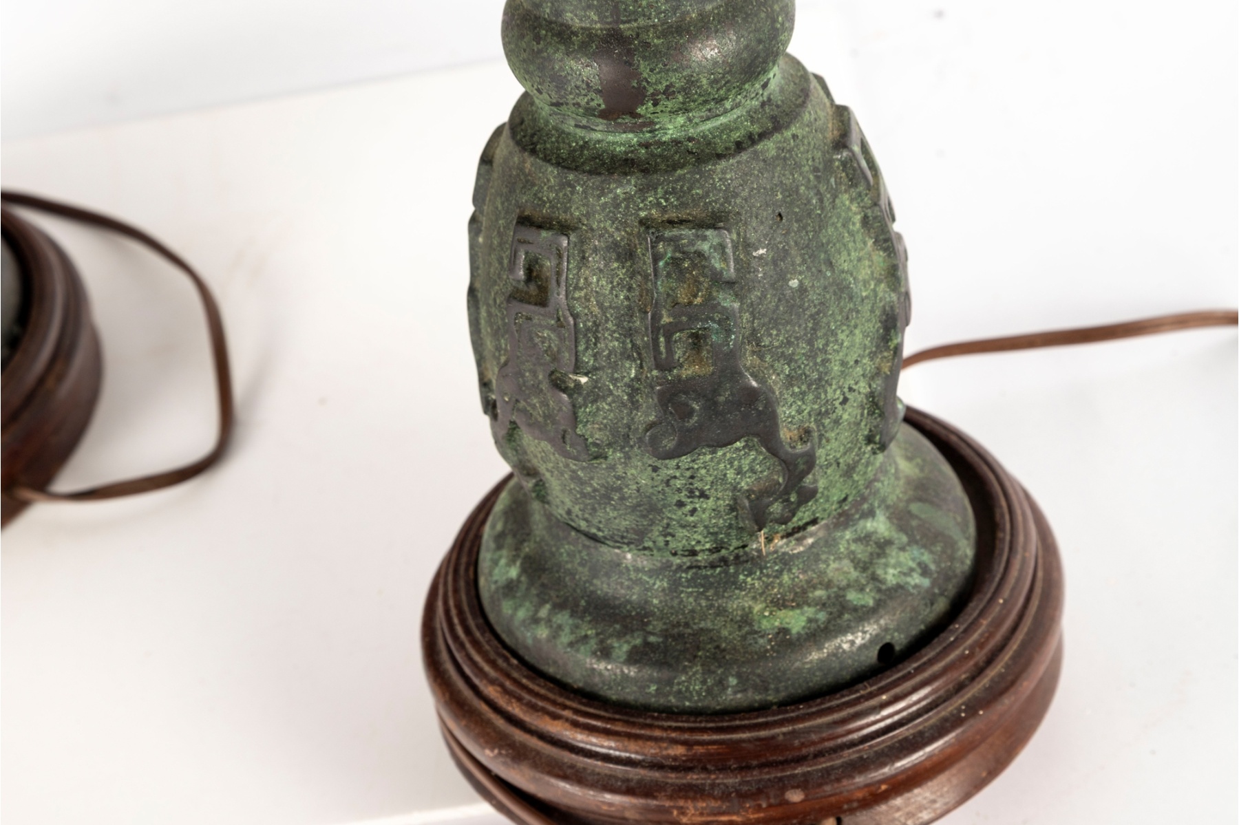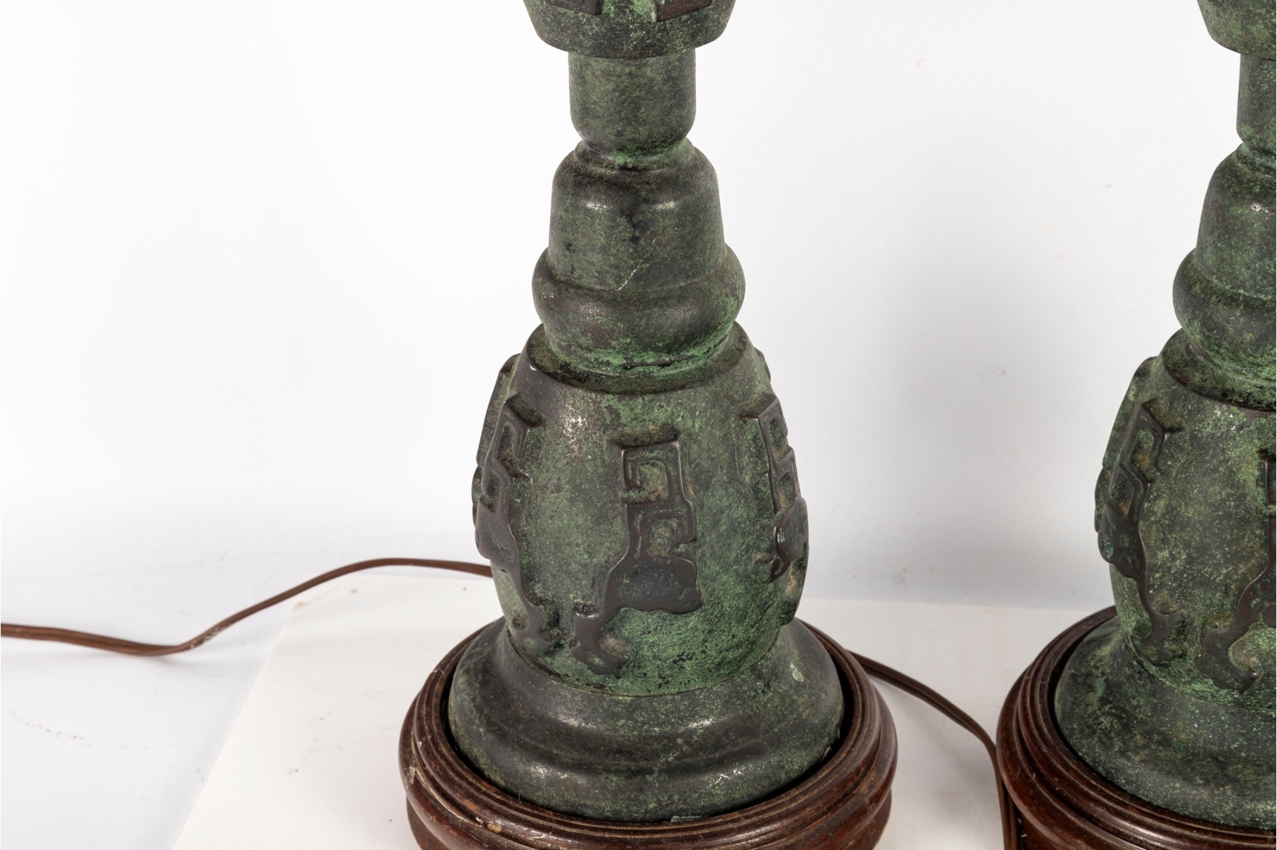 Pair of heavy metal table lamps in an aged verdigris finish, each featuring cast relief designs inspired by ancient Chinese motifs, including stylized coin and key patterns. The bodies are mounted on circular wooden bases with brass harp fittings and finials.